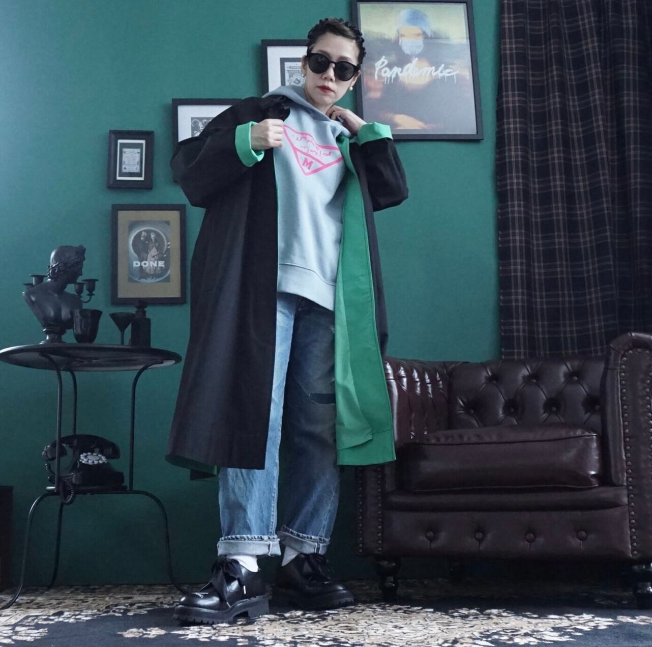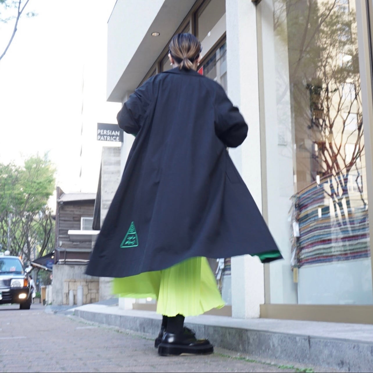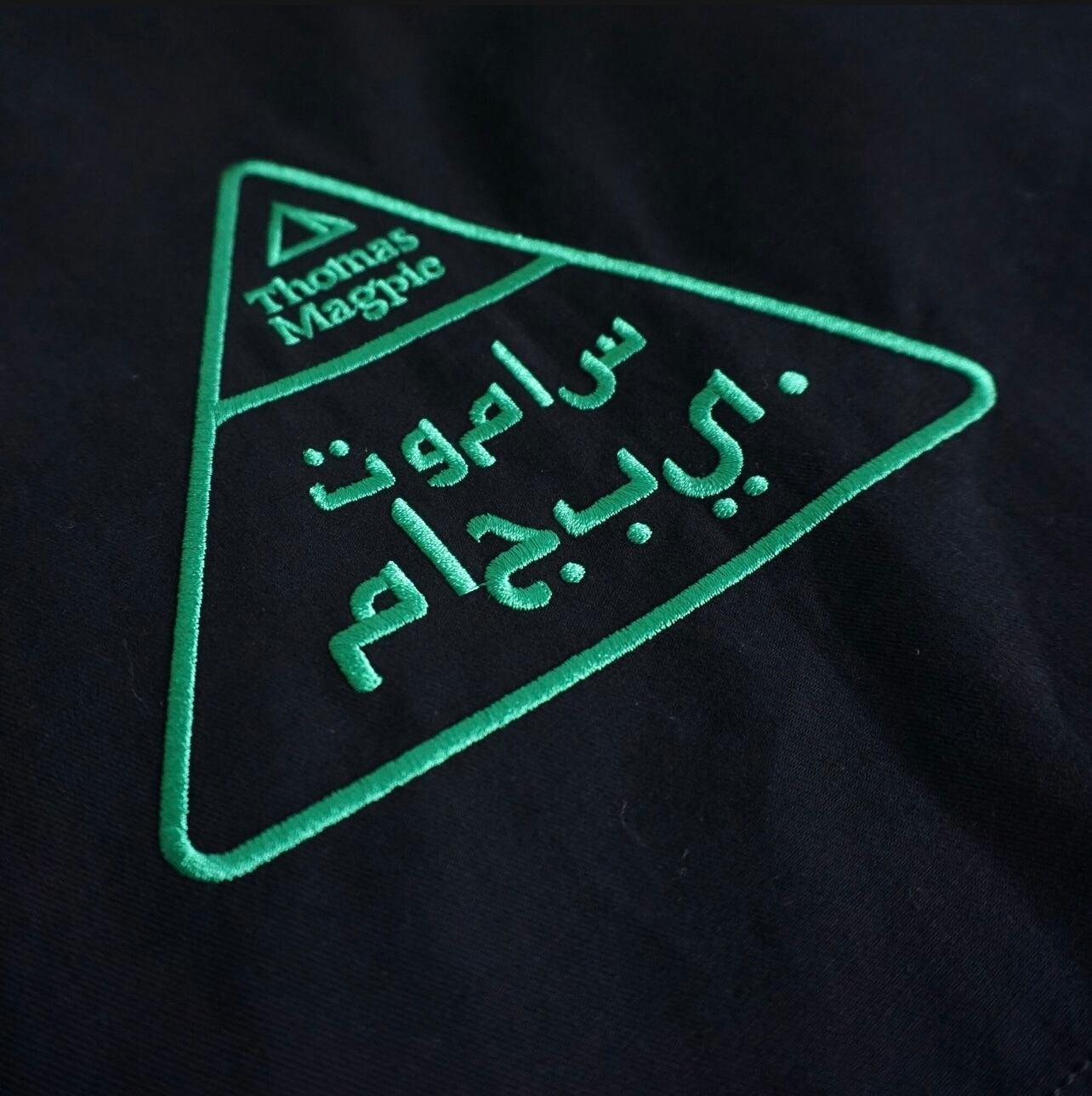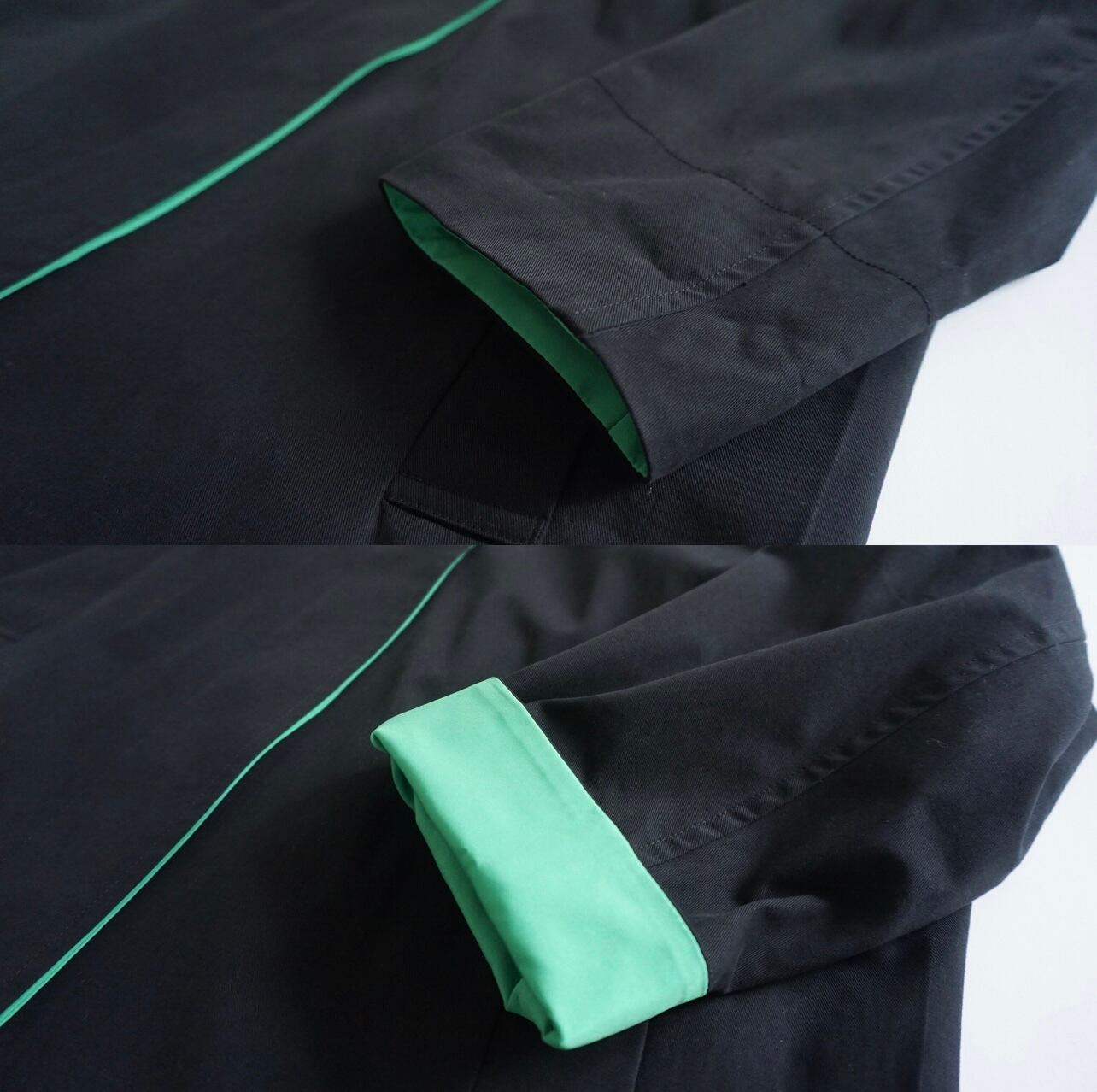デザインする時に、いつも心掛けている事は、なるべくなら身長を限定しないようにと思っています。着丈は気になりませんが、小柄な方は袖丈だけは、合わないと違和感を感じで美しく着ることができないような気がする方が多いと思います。最近はシャツもコートも袖丈が長い方がファッション性があると思いますが、小柄な方はやはり袖が長いものは抵抗感があると言われます。今回もこのコートは袖を曲げる事で、配色見せができる作りにしています。違和感なく小柄さんにフィットさせることができます。春は短めに曲げて袖裏のグリーンを見せて配色を楽しめます。真冬は袖の折り返しはせずに長めに着用できます。チラリと見える裏地のグリーン配色もとても可愛いと思います。また同じくグリーンの刺繍を今回は背面の裾に入れました。トライアングルの刺繍は、今回の制作テーマでもあるマズローの5段階欲求のヒエラルキーを表現しています。アラビア文字でTHOMAS MAGPIEのブランドネームを刺繍で入れてみました。主張の少ないシンプルなデザインの中に、グリーンの挿し色が映えて、普段に合わせやすいコートに仕上がったのではないかと思います。トレンチほど着ているゴワツキがないので人気なのだそう。製作チームスタッフにもとても人気で、購入を決めている人も多いので、幅広く受け入れやすく使えるコートなのだと実感しました。またコットンなので、扱いがしやすくホームクリーニング可能。(コットンなので縮む可能性があります。クリーニング推奨)大きめの刺繍が入る割には、プライスも魅力の3万円代です。