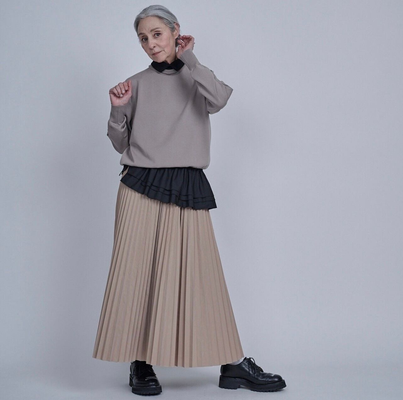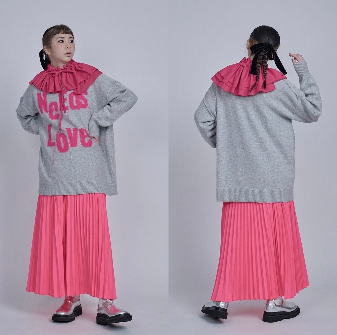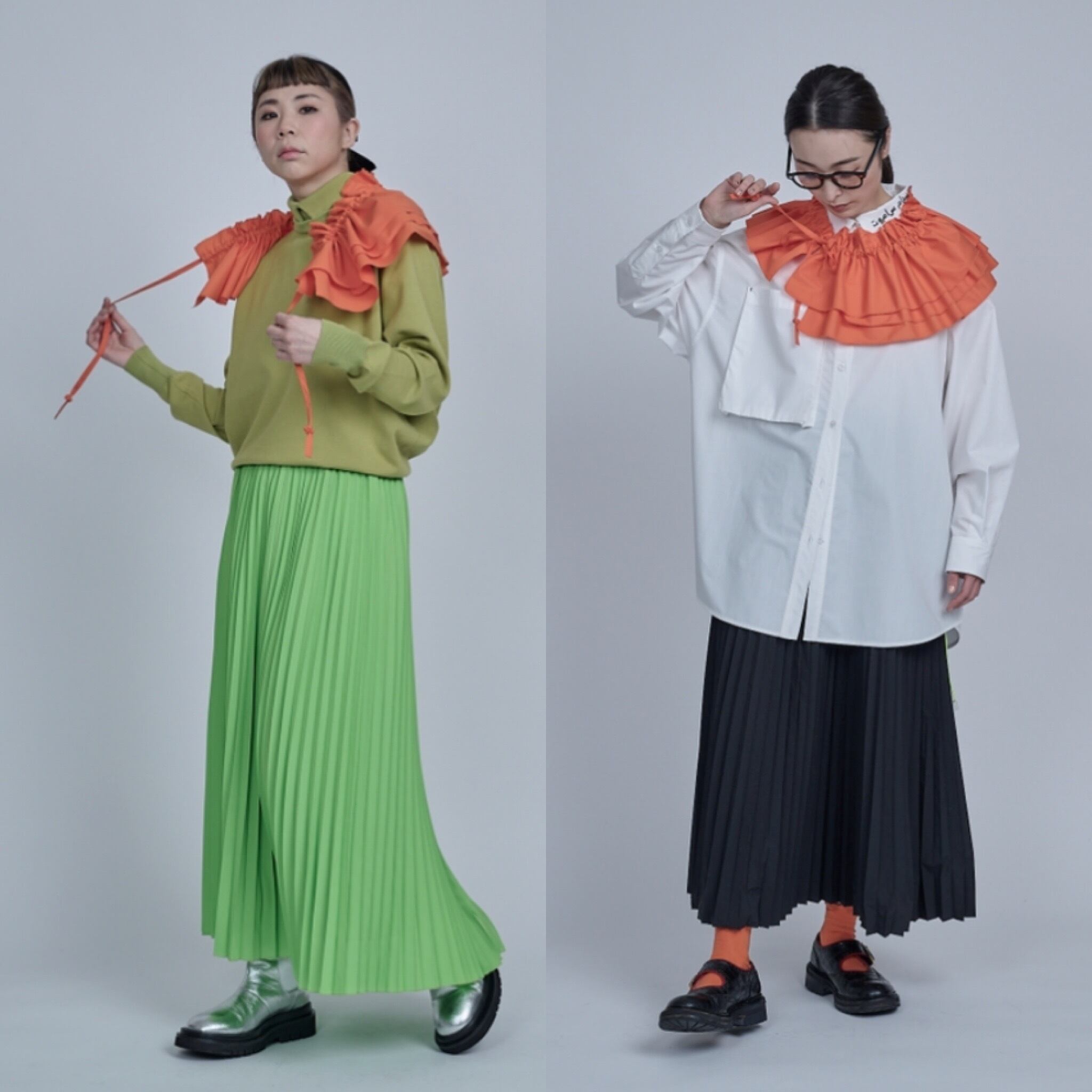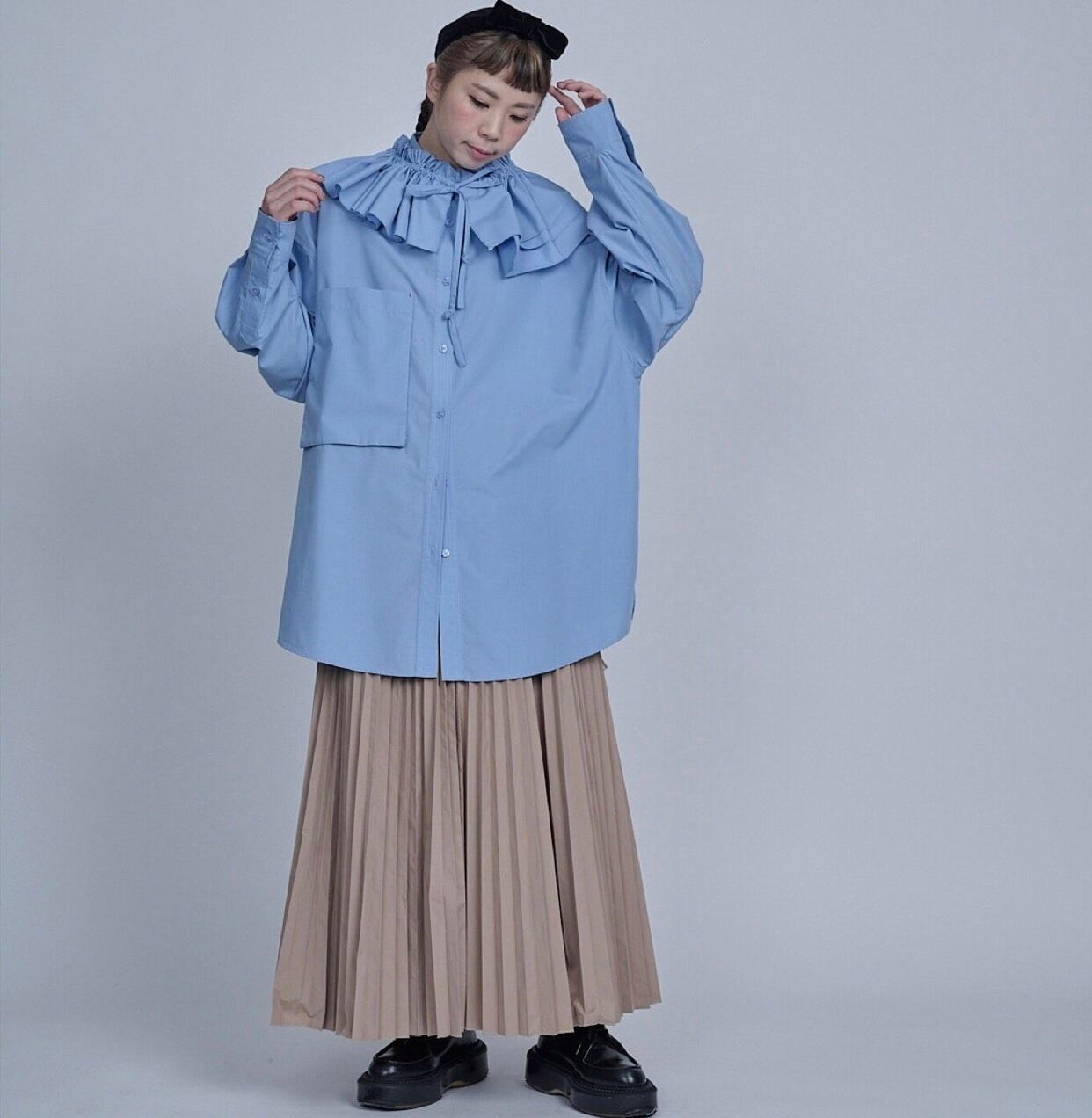 お勧めは、同じく予約販売しているビッグシャツ、白、またブルーのシャツに合わせてもらいたい。定番的に出しているプリーツスカートにビッグシャツを合わせてこのアタッチドカラーで彩りをつけてコーディネートを提案しています。またニットやブルゾンなど何にでも合わせてみてください。1つあるだけで、とてもユースフルなアイテムになります。