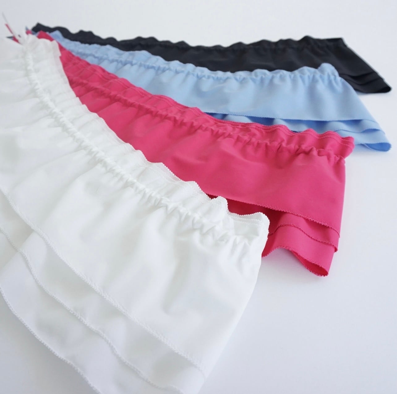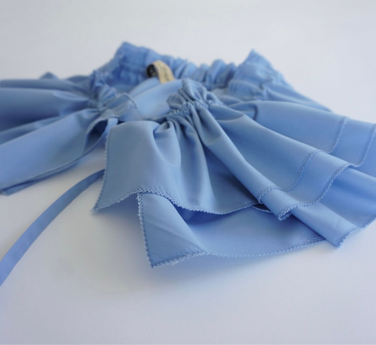段差をつけて、フリルを重ねています。単純なフリルではなく段違いに生地の長さを変化させたアシメなフリルの感じのこだわりもポイントです。
