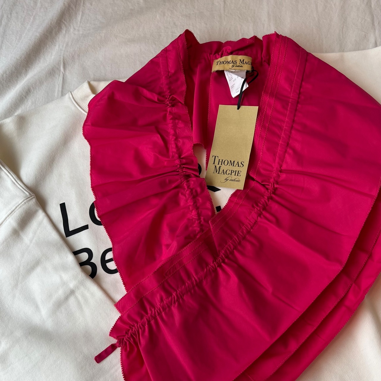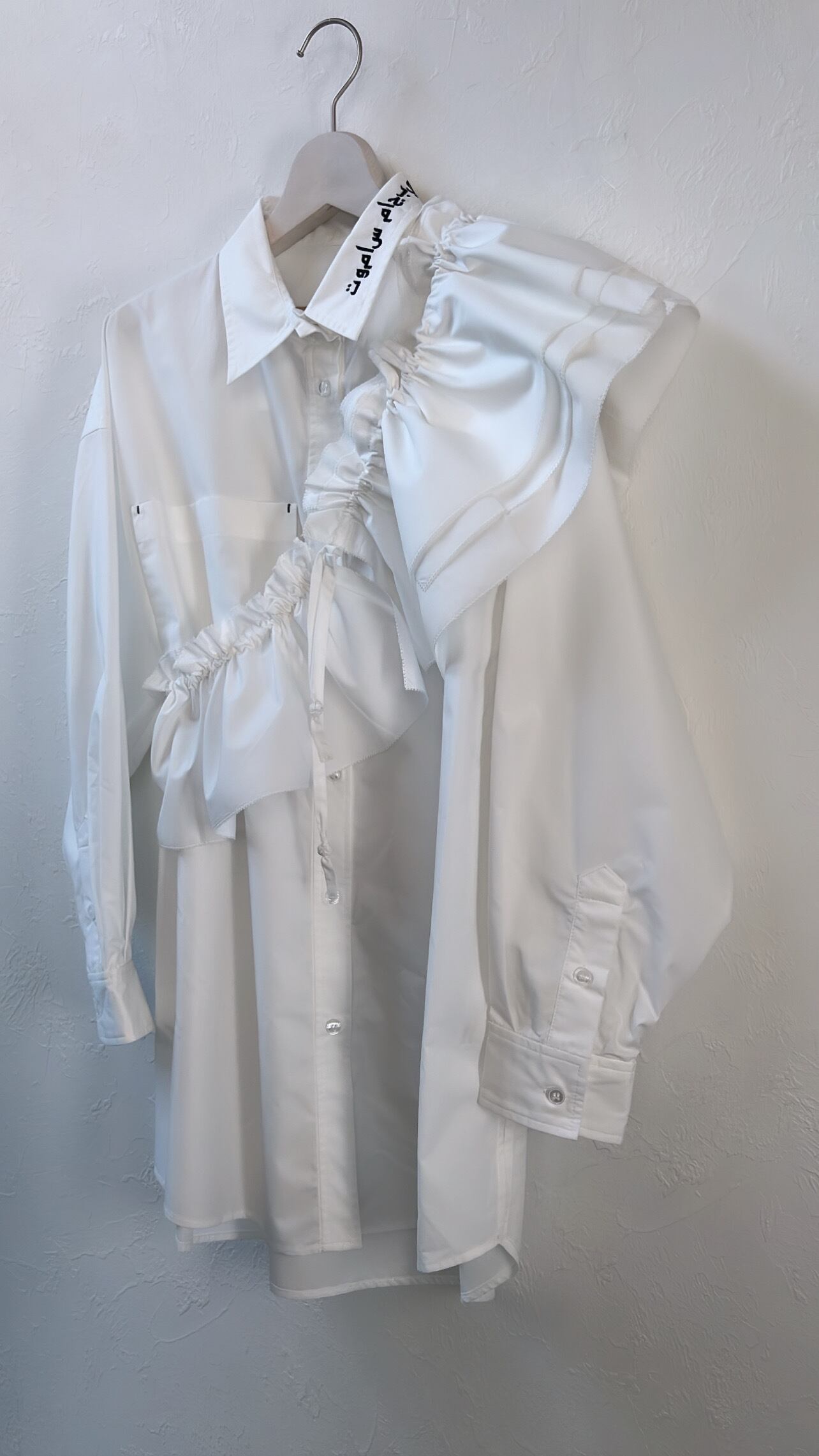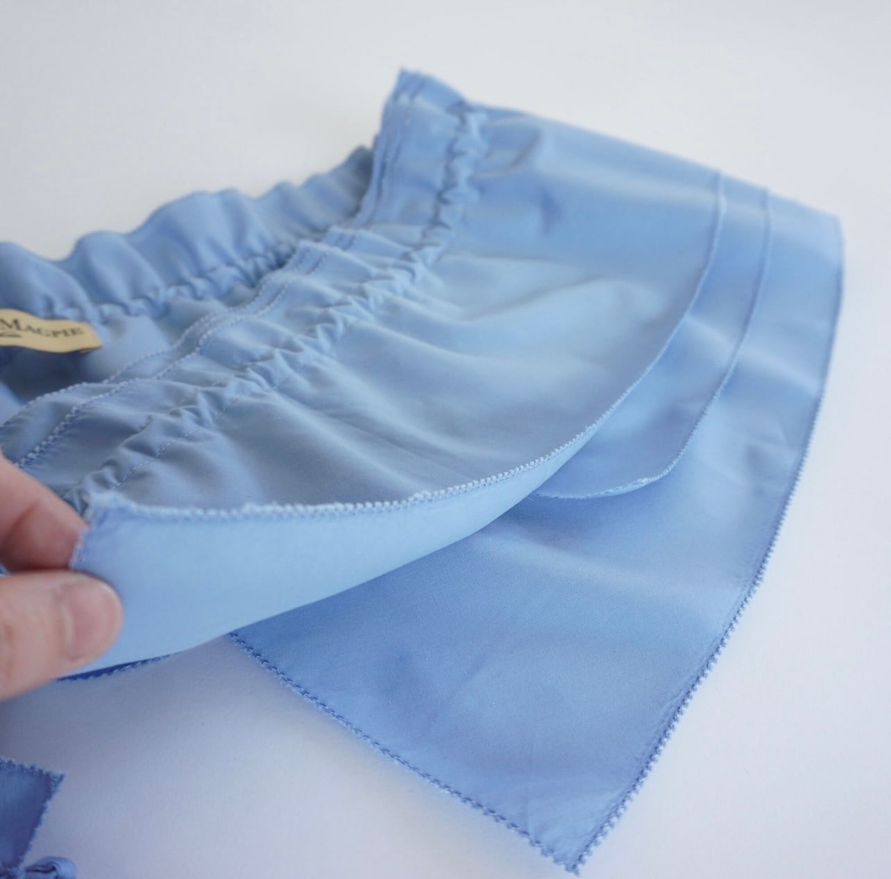 今回、一番のお勧めのアイテムです。共布の紐で絞るタイプの付け襟です。ドローストリングで絞ってフリルを寄せる為、変幻自在の長さが作れます。普通のつけ襟にしたり、ウエストにつけてみたり、斜めにクロスしたりする事もできます。いつもマグパイでは着こなしを楽しめるものはなんだろう、と考えながらデザインを進めていますが、今回はこの付け襟が着こなしに変化を付けるエッセンスにしています。いつものお洋服にプラスするだけで、真新しい雰囲気が作れる。これまで持っているお洋服も大切に着て欲しいと思っています。少し飽きていた、2軍落ちのお洋服もこの付け襟をプラスすることで楽しくなるといいなと思います。フリルアイテムは最近大好きなアイテムです。真夏は真っ白なTシャツにも良いと思います。