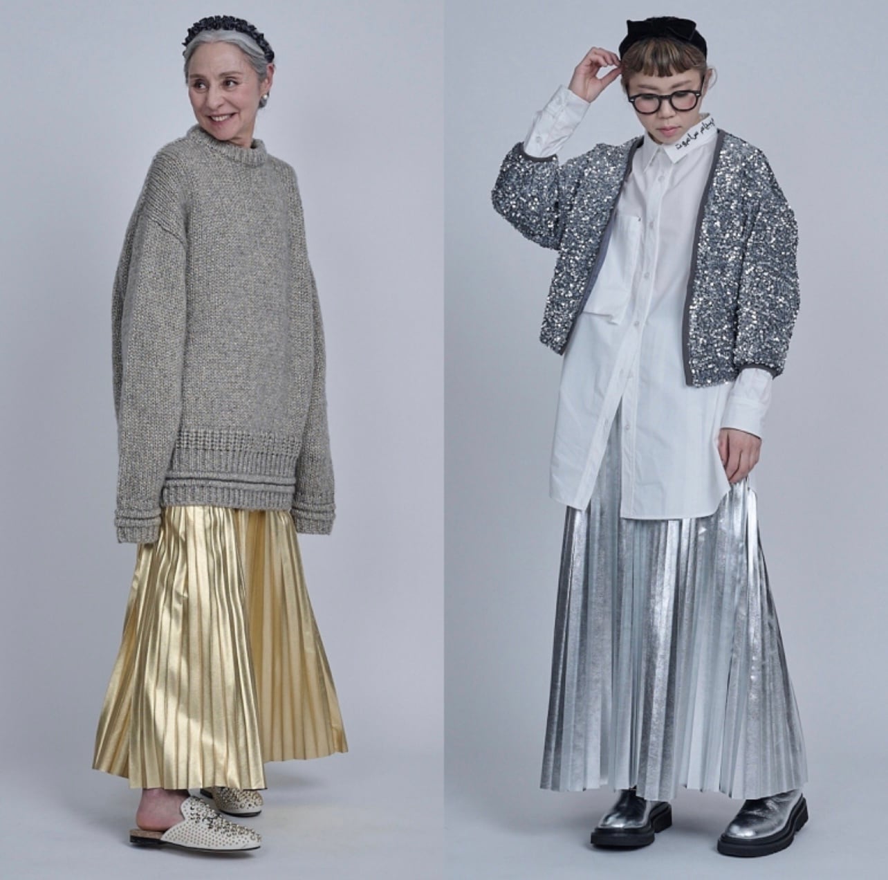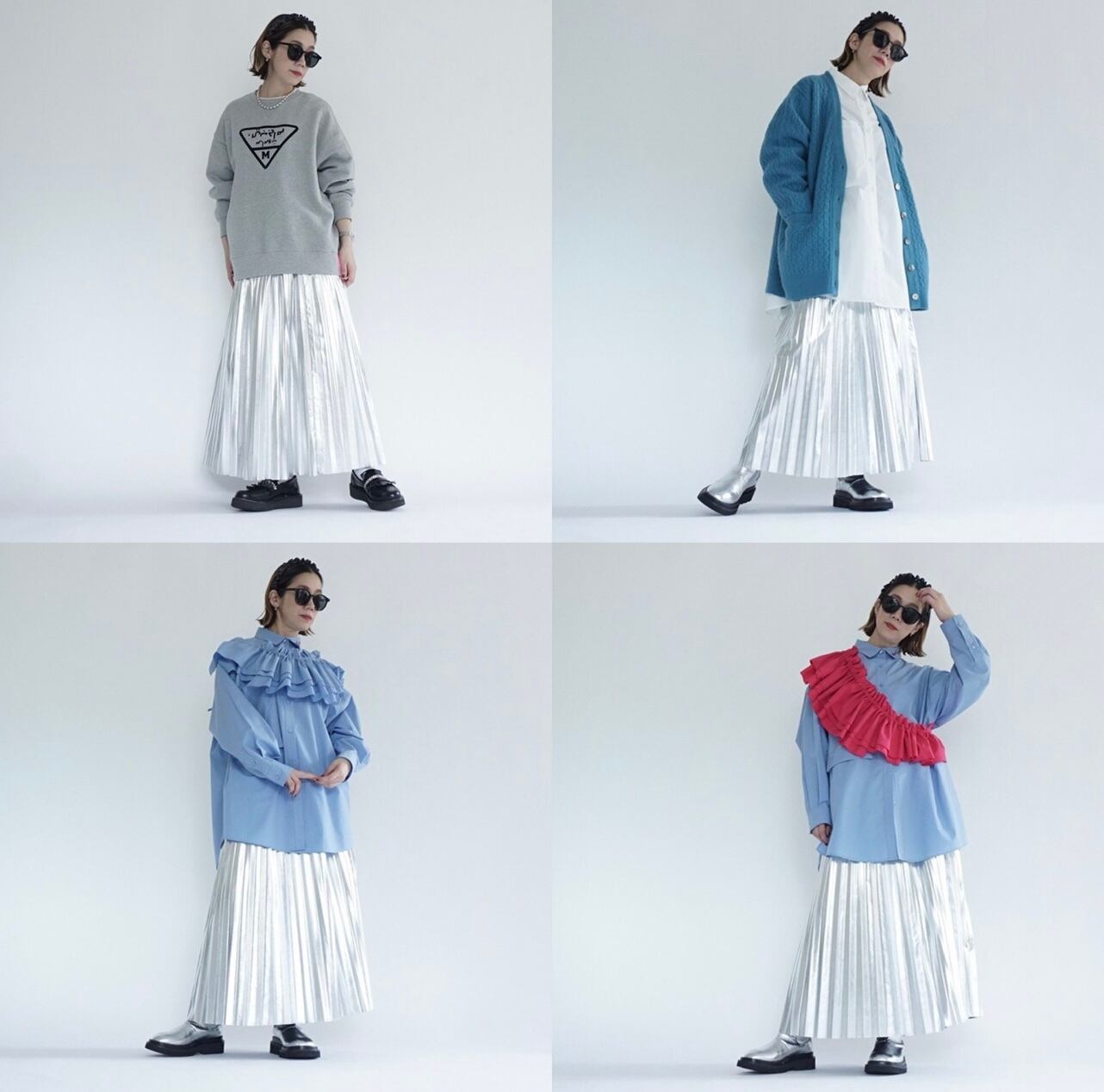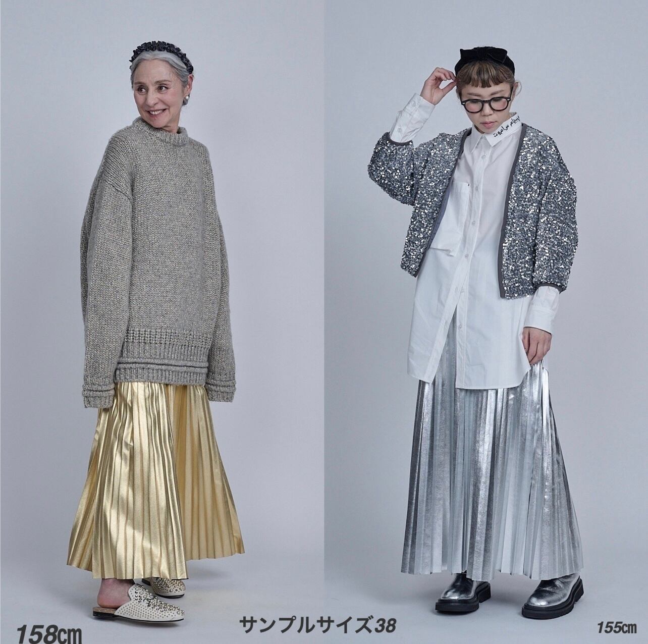 今回一番のお勧めボトム。メタリックのプリーツスカートです。細く見えてサイバー感を表現したくてメタリックに初めて挑戦してみました。またテーマカラーのシルバーとサックスブルーの組み合わせに外せないアイテムです。ウエストはもたつかないようにゴムベルトの直付けでゴワゴワ感が有りません。すっきりとしていてとても良いものができたのではないかなと思います。シルバーはとにかく合わせやすくて便利でした。ゴールドはファッション性が高いカラーだと思います。今年の冬は、他のブランドや秋冬市場と少し違った寒色を多く作りました。ポリエステル100%で汚れにくく扱いがしやすい素材です。(プリーツの為、クリーニング推奨)ほとんどのトップスにこのシルバーのスカートは合うと感じました。万能なボトムだと言えると思います。また白っぽいカラーのトップス、明るいカラーのトップスが十二分に映えるのでとても便利でした。今回のトーマスマグパイ のコレクションの中心にこのスカートがあると思います。この冬にチャレンジしたいメタリック素材は、ボトムから取り入れるとエントリーしやすいかなと思いました。この明るいシルバーはどんなカラーのウエアにも合わせ易いので、作ってよかったなと思っています。今回、どれにしようかな?と購入を悩む方に必須アイテムとしてお勧めしたいのがこのスカートです。またこちらにホワイトのビッグシャツ、アタッチドマルチカラーを合わせて着て欲しいと思います。スカートの熱い思いが止まりません。自信を持ってお勧めです。