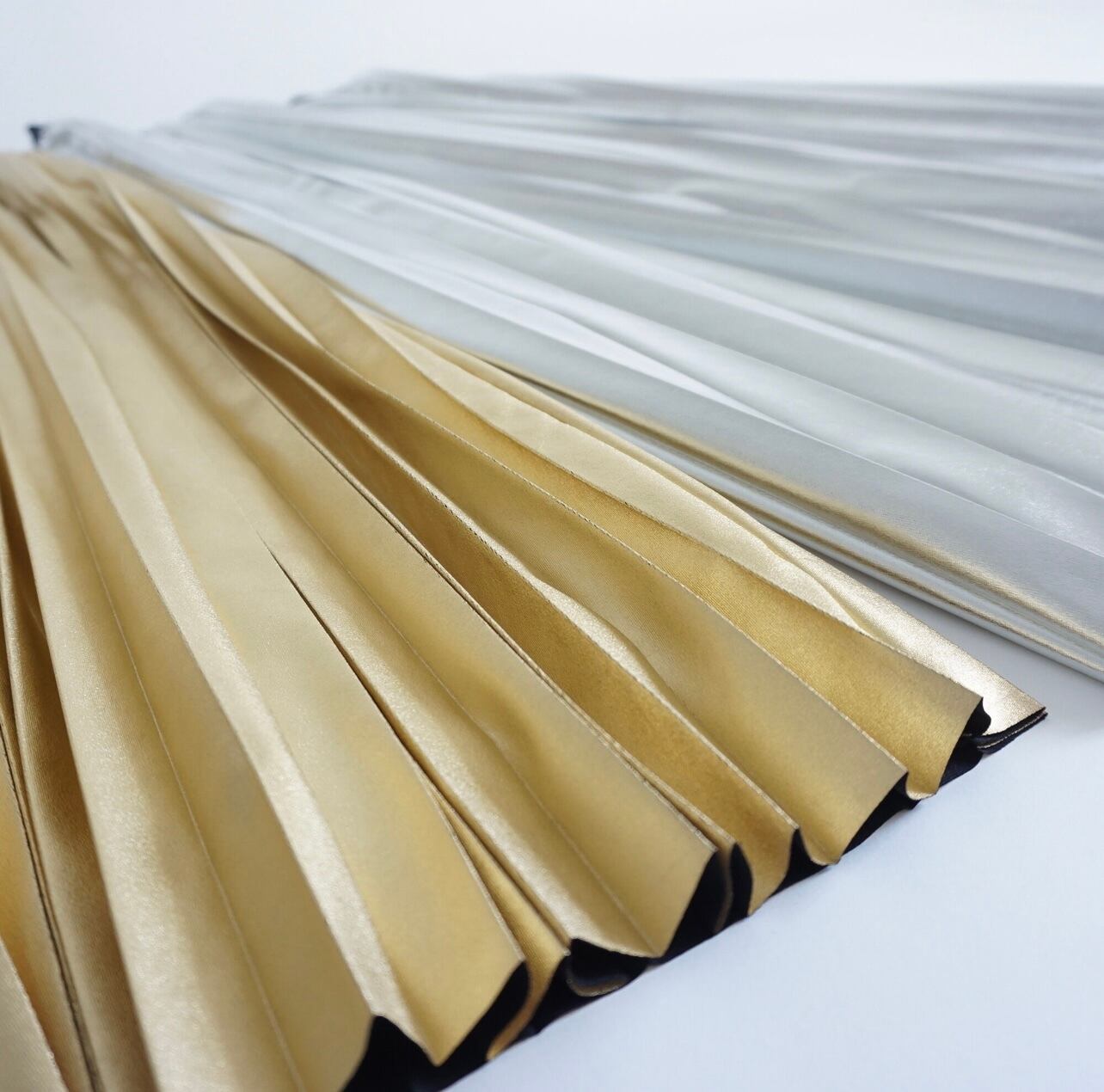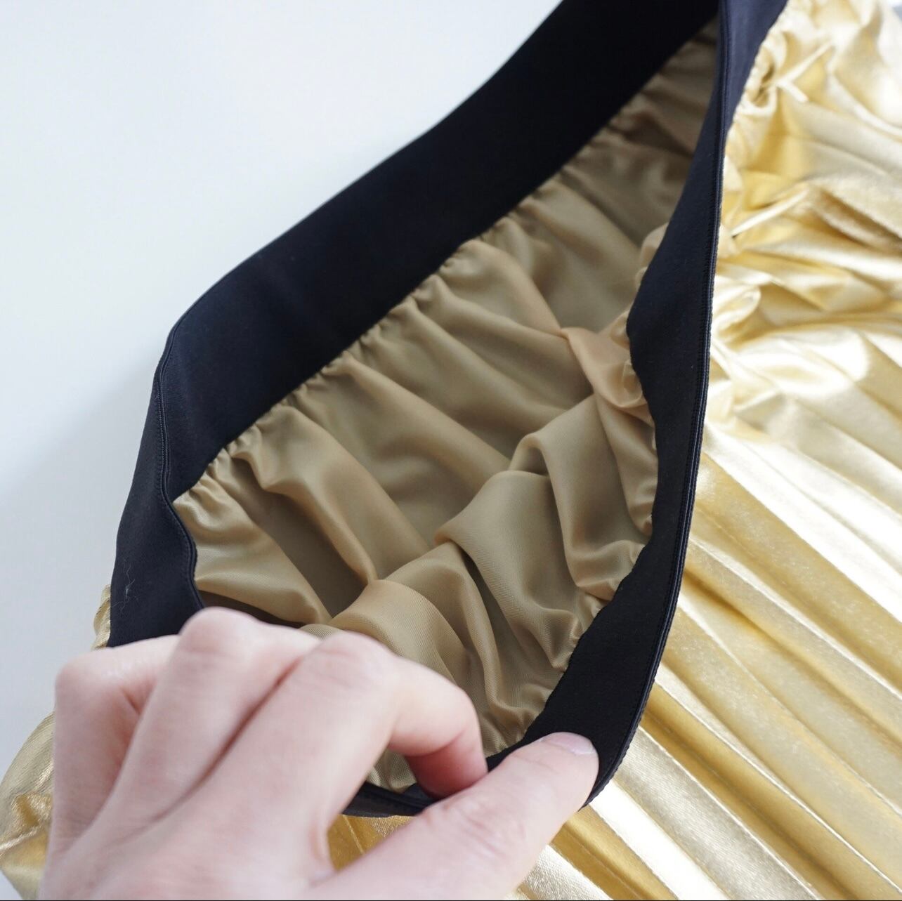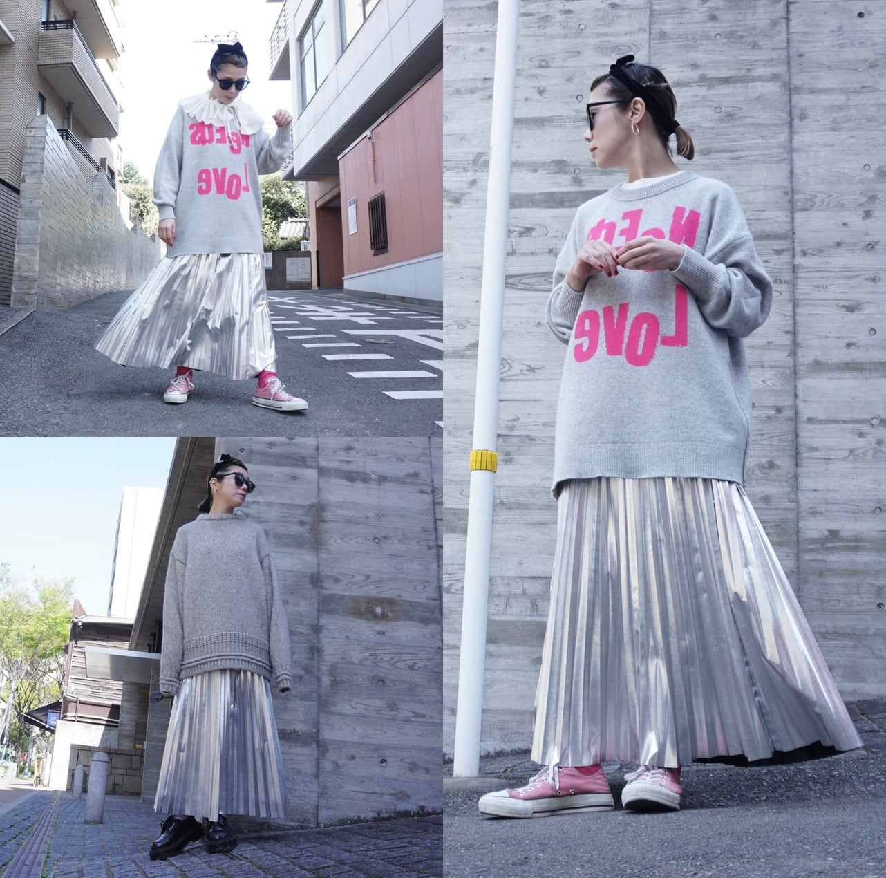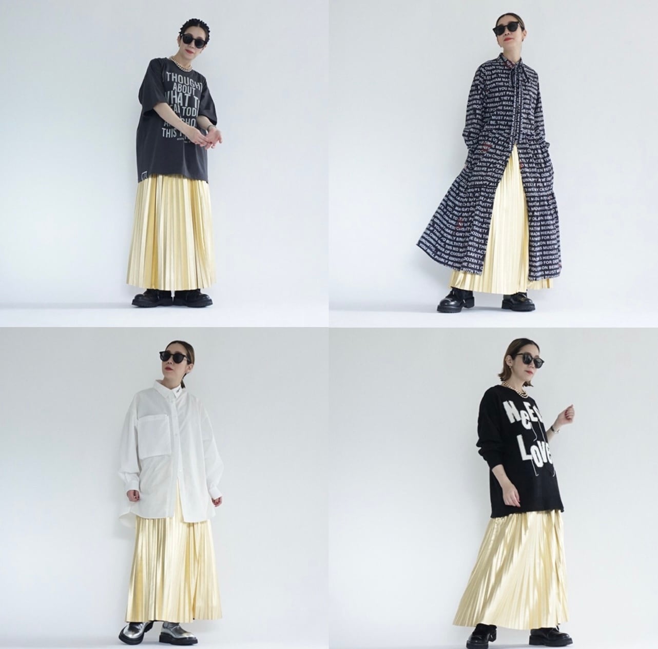 今回一番のお勧めボトム。メタリックのプリーツスカートです。細く見えてサイバー感を表現したくてメタリックに初めて挑戦してみました。またテーマカラーのシルバーとサックスブルーの組み合わせに外せないアイテムです。ウエストはもたつかないようにゴムベルトの直付けでゴワゴワ感が有りません。すっきりとしていてとても良いものができたのではないかなと思います。シルバーはとにかく合わせやすくて便利でした。ゴールドはファッション性が高いカラーだと思います。今年の冬は、他のブランドや秋冬市場と少し違った寒色を多く作りました。ポリエステル100%で汚れにくく扱いがしやすい素材です。(プリーツの為、クリーニング推奨)ほとんどのトップスにこのシルバーのスカートは合うと感じました。万能なボトムだと言えると思います。また白っぽいカラーのトップス、明るいカラーのトップスが十二分に映えるのでとても便利でした。今回のトーマスマグパイ のコレクションの中心にこのスカートがあると思います。この冬にチャレンジしたいメタリック素材は、ボトムから取り入れるとエントリーしやすいかなと思いました。この明るいシルバーはどんなカラーのウエアにも合わせ易いので、作ってよかったなと思っています。今回、どれにしようかな?と購入を悩む方に必須アイテムとしてお勧めしたいのがこのスカートです。またこちらにホワイトのビッグシャツ、アタッチドマルチカラーを合わせて着て欲しいと思います。スカートの熱い思いが止まりません。自信を持ってお勧めです。