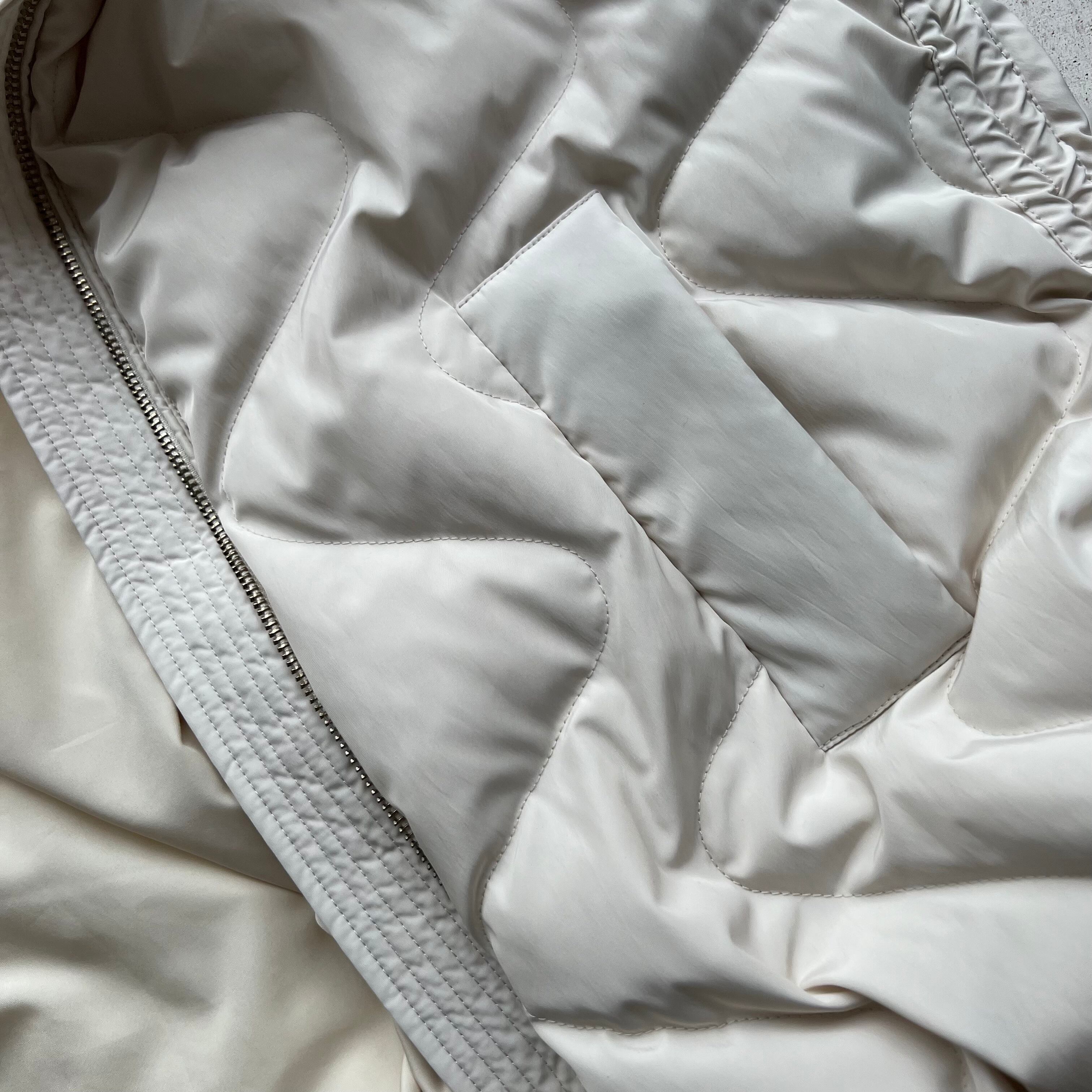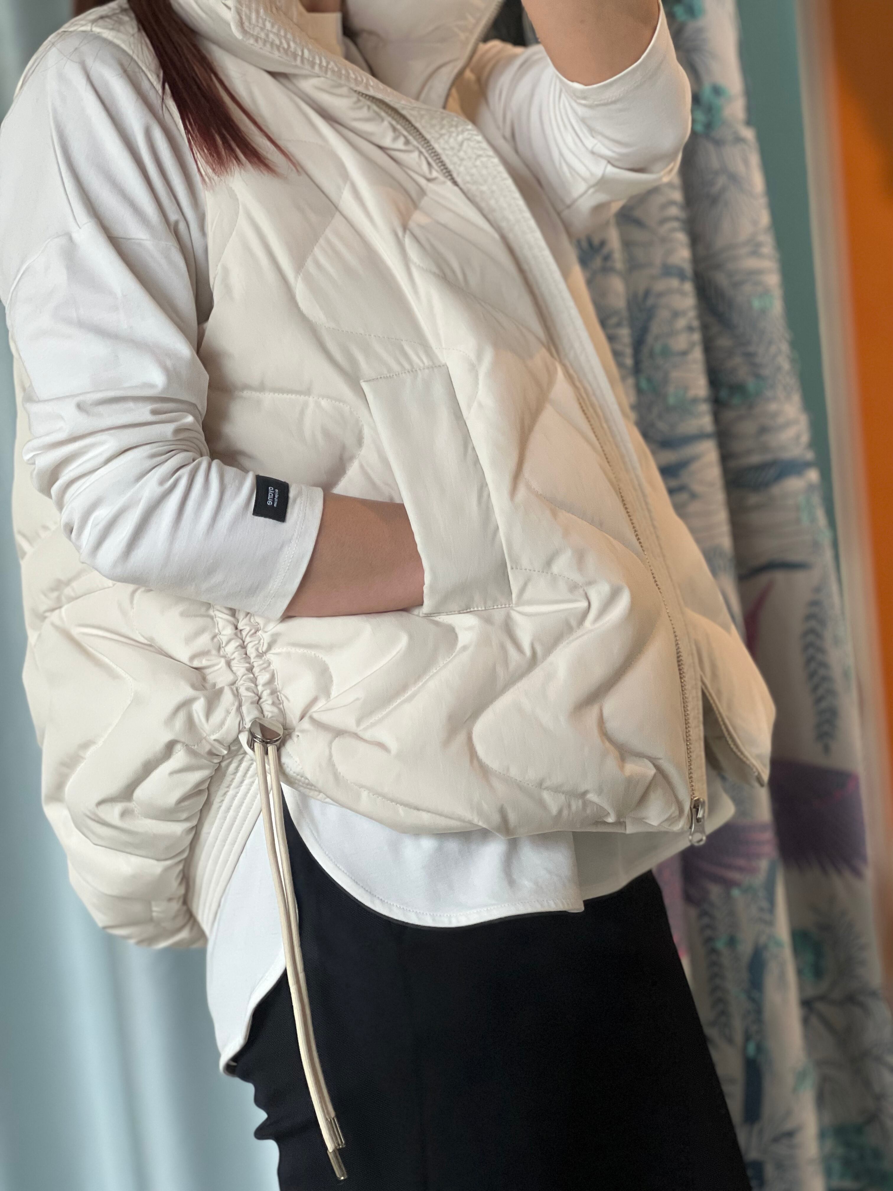 フードは無く、衿部分にはフードが内蔵されているかのようなボリュームを持たせています。