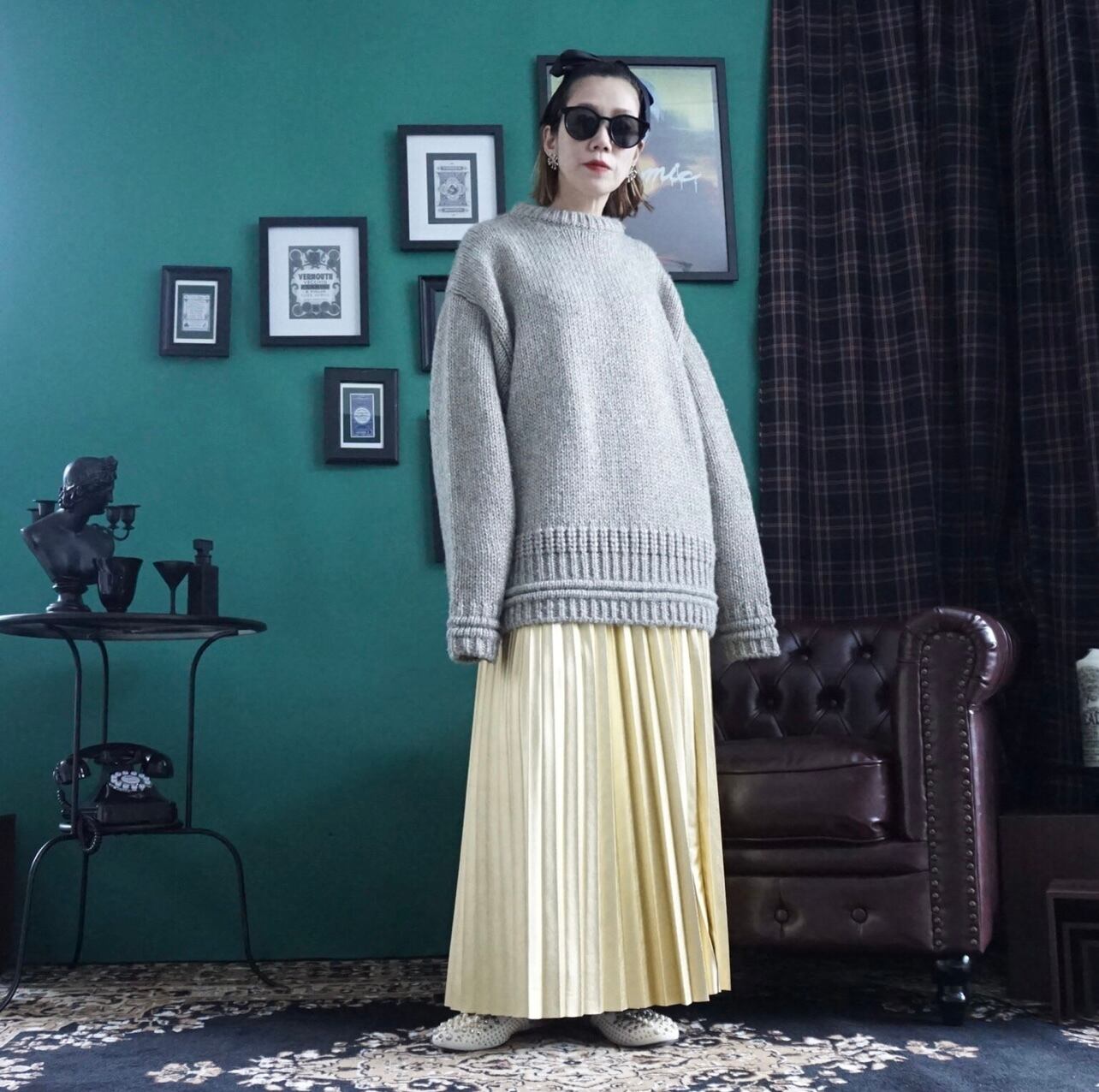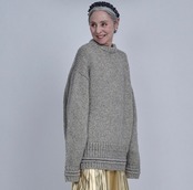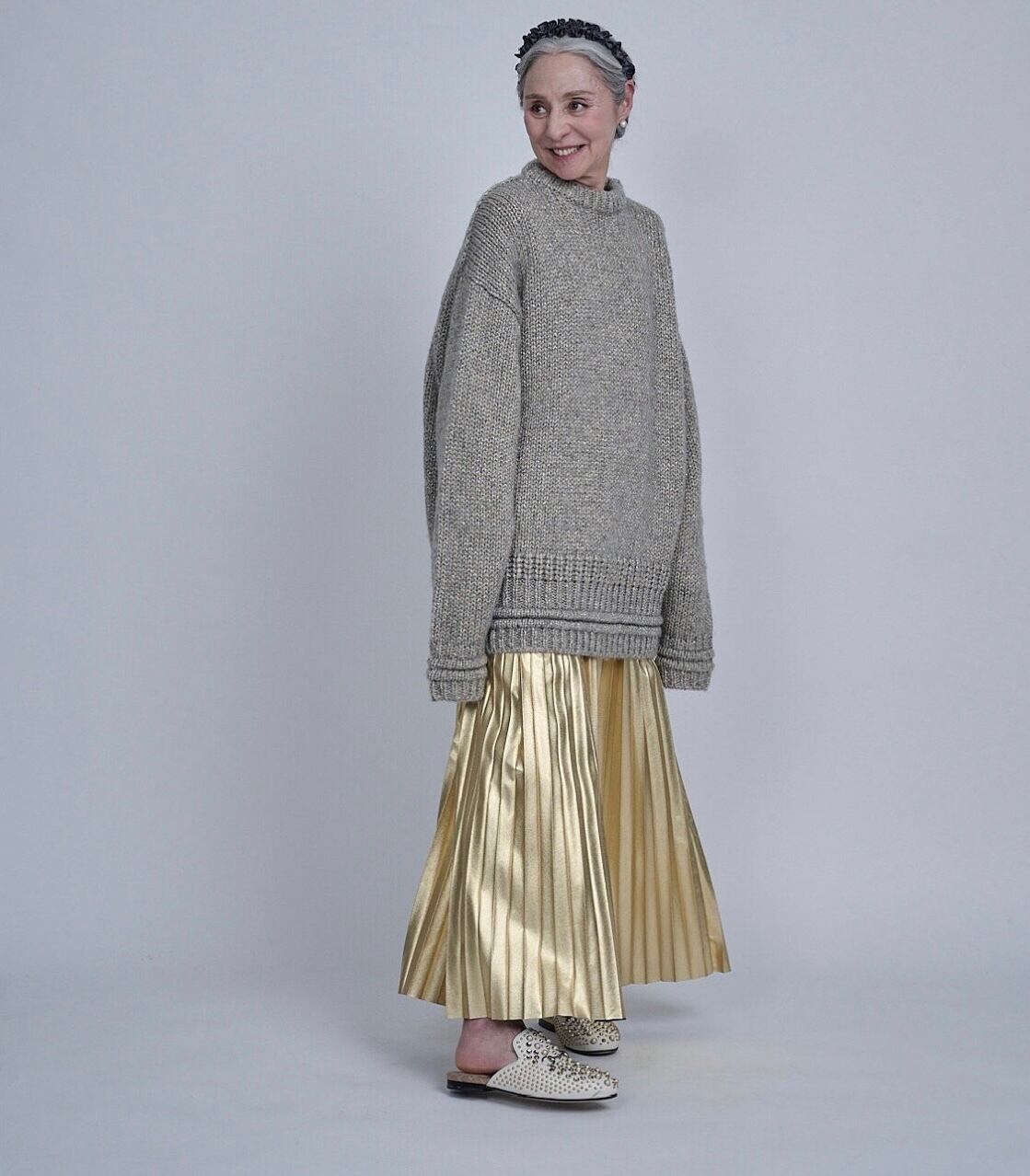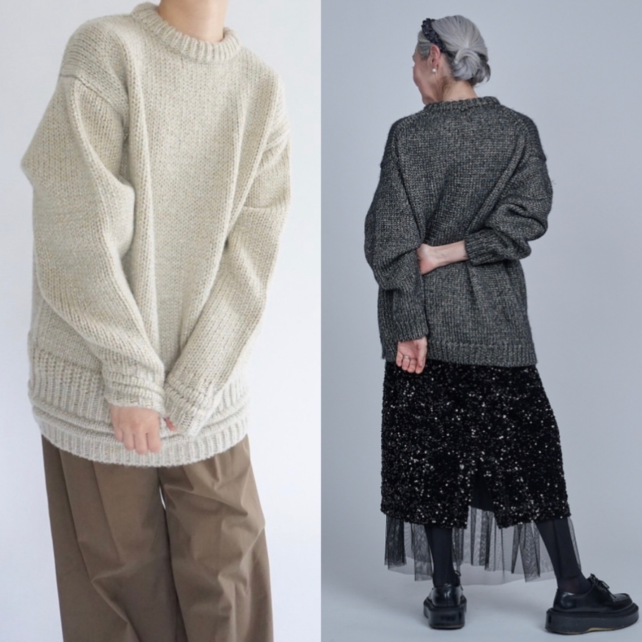 オーバーサイズニット。金糸が入っていてラメ感が強いニットです。首回りは膨らみを持たせてダブルにしています。身頃、袖も長めにしています。今回はメタリック、ラメ、スパンコールなどグリッターアイテムをデザインしています。シルバーと表記されていますが、ややゴールドの糸が混ざっています。シンプルだけどラメ感で今年の流行を意識して作っています。サイズは大きめなのでどんな体型の方もOK。大きめに着てとても可愛いと思います。このニットにプリーツスカート。単純な組み合わせでもちょっと大人感があって良いと思います。組み合わせとしては、予約受付中のアタッチドマルチカラーを斜めにつけるコーディネートがおすすめです。ウールとポリエステルの混紡で暖かく過ごせます。少しだけ重みがあるので上半身がほっそりと見えます。真冬に一つあると楽しいかなと思います。シルバーかゴールドのメタリックスカートを合わせたいと思ってルックからデザインをしています。