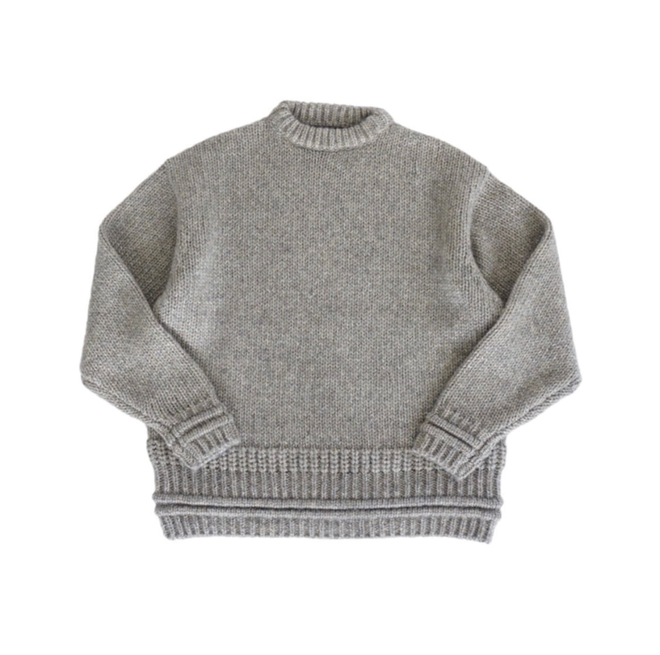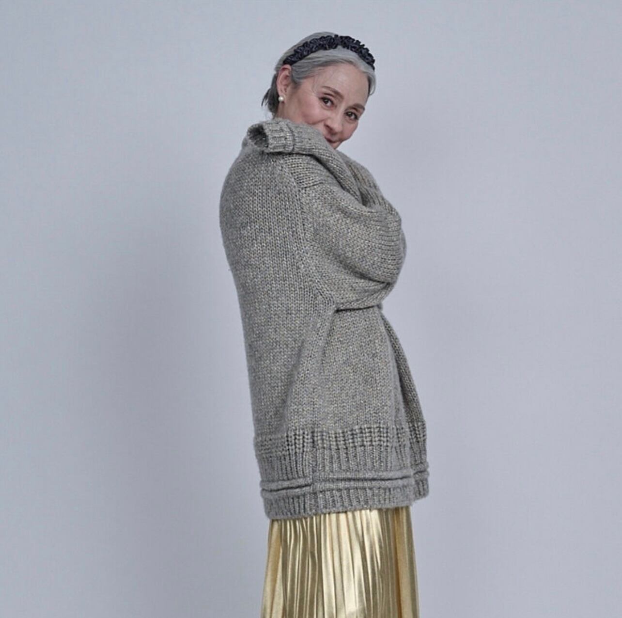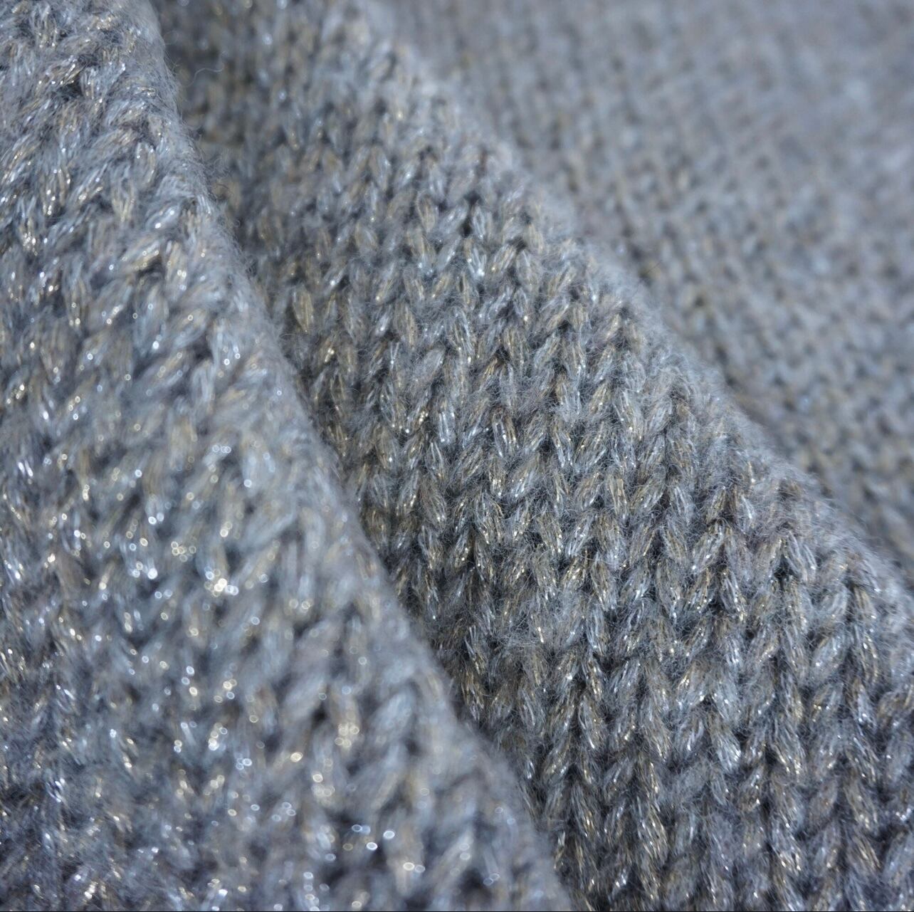 オーバーサイズニット。金糸が入っていてラメ感が強いニットです。首回りは膨らみを持たせてダブルにしています。身頃、袖も長めにしています。今回はメタリック、ラメ、スパンコールなどグリッターアイテムをデザインしています。シルバーと表記されていますが、ややゴールドの糸が混ざっています。シンプルだけどラメ感で今年の流行を意識して作っています。サイズは大きめなのでどんな体型の方もOK。大きめに着てとても可愛いと思います。このニットにプリーツスカート。単純な組み合わせでもちょっと大人感があって良いと思います。組み合わせとしては、予約受付中のアタッチドマルチカラーを斜めにつけるコーディネートがおすすめです。ウールとポリエステルの混紡で暖かく過ごせます。少しだけ重みがあるので上半身がほっそりと見えます。真冬に一つあると楽しいかなと思います。シルバーかゴールドのメタリックスカートを合わせたいと思ってルックからデザインをしています。