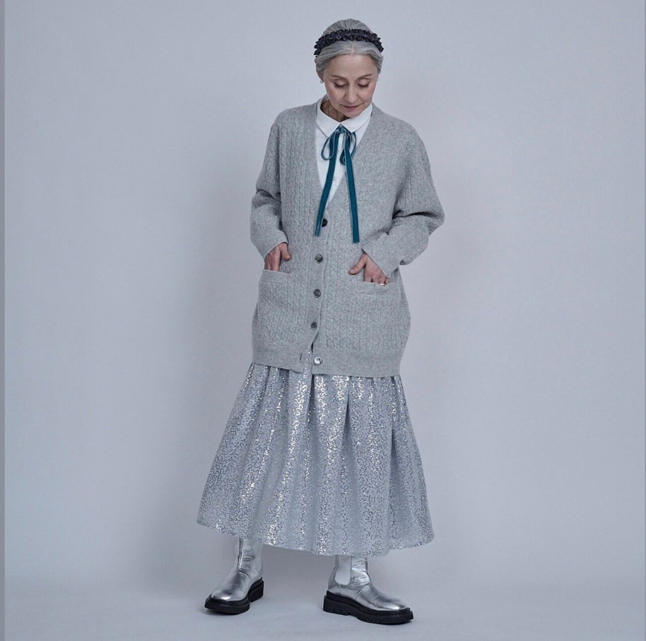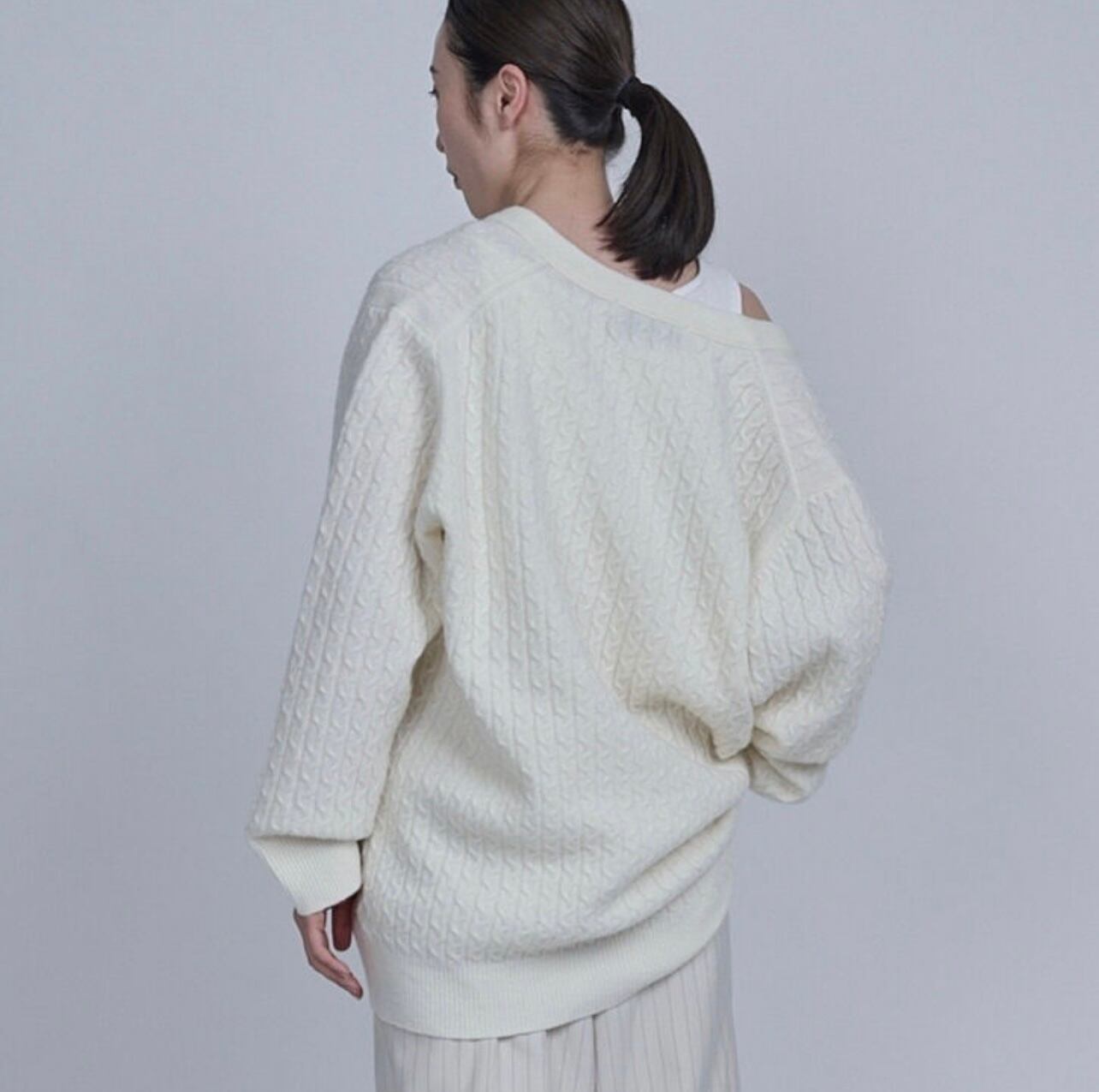 定番的に作っているこのVネックのカーディガンが人気なのは、身頃のサイズ感です。ヒップにかかる身頃が大きめでヒップに乗ってこないのが良い、と購入された方は言われます。ヒップに乗らず、体から離れているので、体型を拾わず痩せて見えると言われていました。また着丈が長すぎることもないので、スカートでもパンツでもバランスが取りやすくなっています。またウール100%の混ぜ物無しですが、プライスが魅力です。私はグレーとホワイトで悩んでいます。クセはありませんが、多分寒い日に、シルバーのメタリックのスカートに合わせて、きっと着ているだろうな、、と思います。