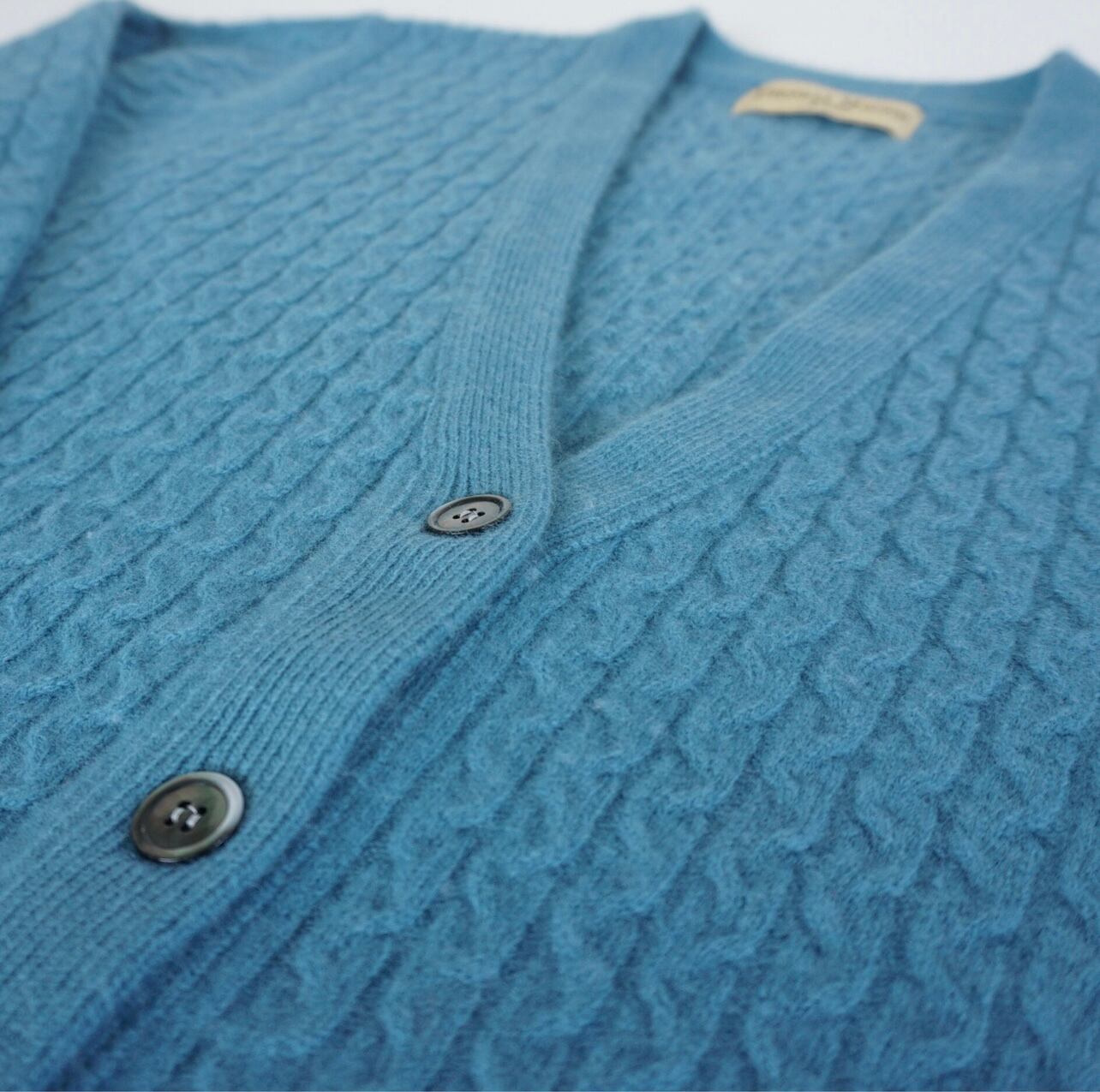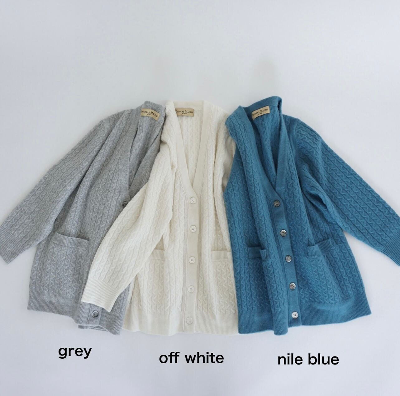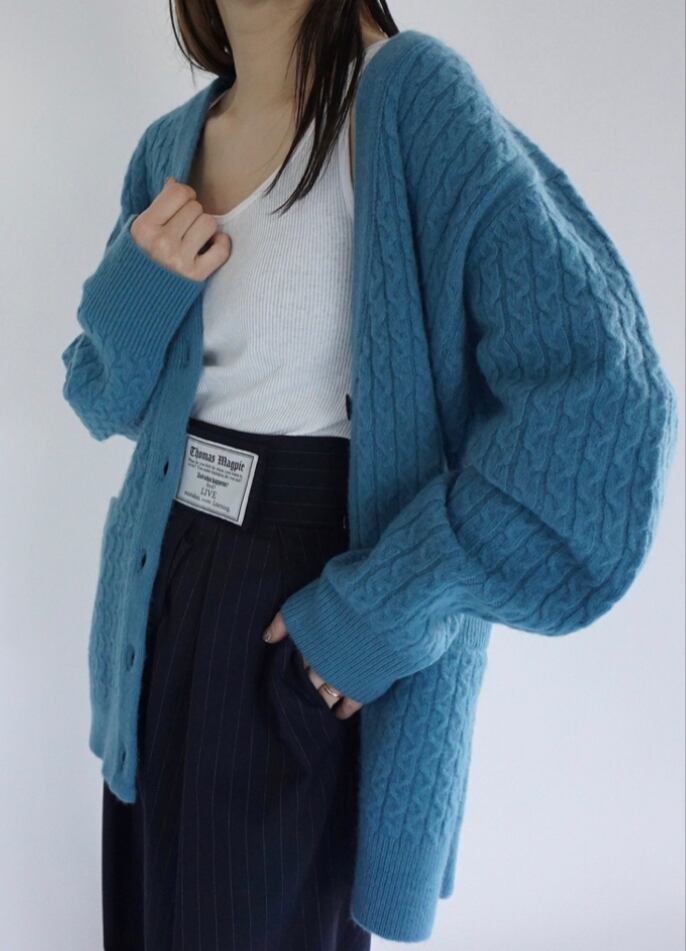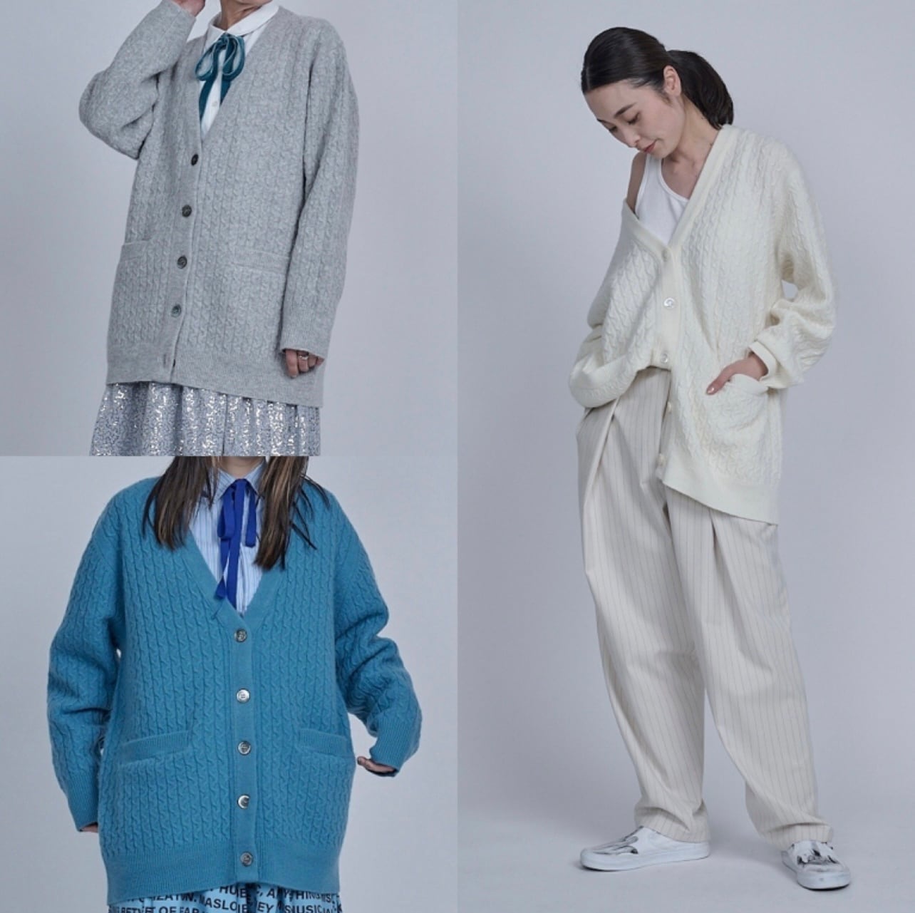 いつものVネックカーディガンを流行のミニケーブルにしてみました。やや厚手でとても暖かなウール100%です。柔らかくて細い糸です。とても心地よい肌触り。寒い真冬に本当に重宝します。いつもは柄で表現していましたが、今回は単色にしました。ですので存在感があり過ぎず毎日着用しても飽きが来ないのではないかなと思います。特に気に入っているのはホワイトです。冬のホワイトコーディネートなども気になります。ナイルブルーも新鮮なカラーです。ややダークな色味なのでブラックなどに合わせやすいと思います。グレーはシルバーとの相性も良く、シルバーやゴールドのメタリックスカートと合わせて欲しいなと思います。