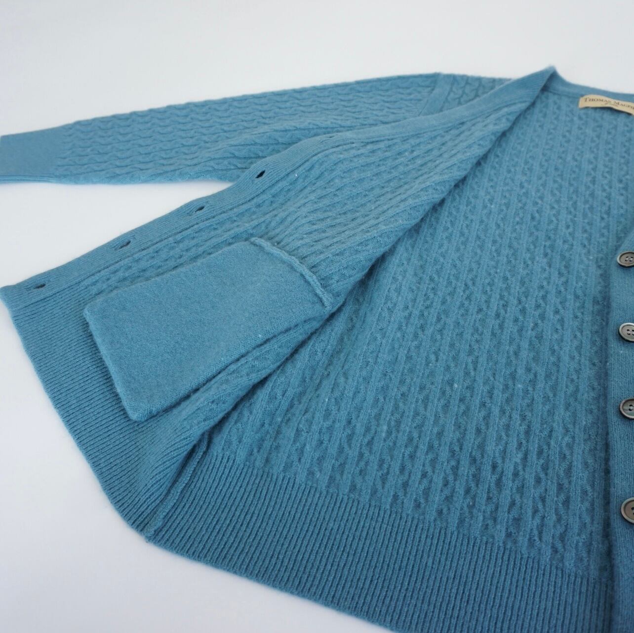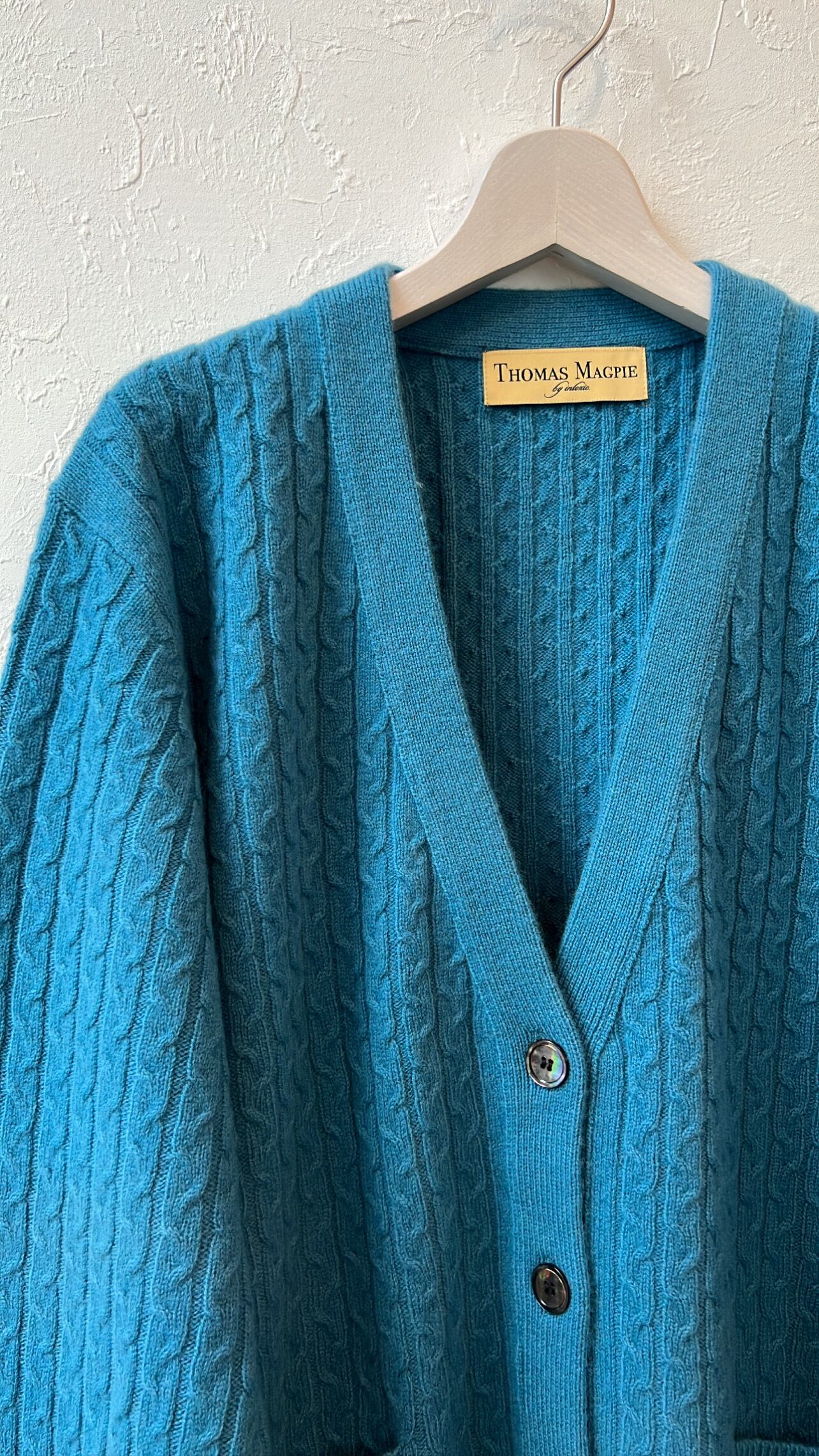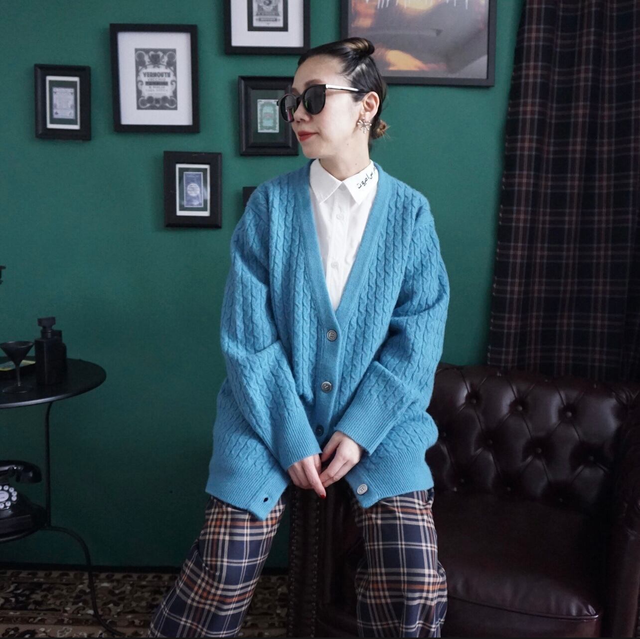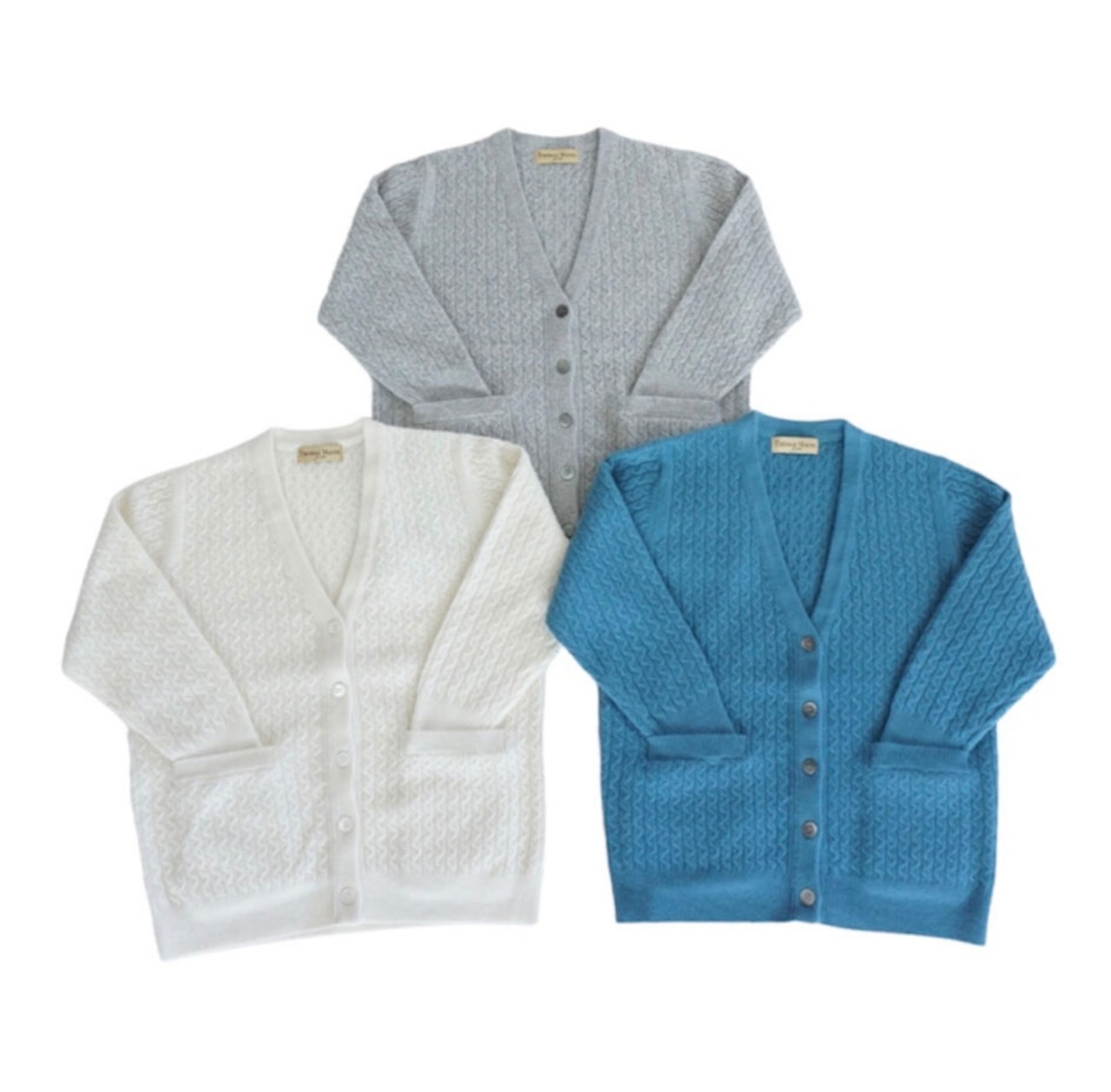 いつものVネックカーディガンを流行のミニケーブルにしてみました。やや厚手でとても暖かなウール100%です。柔らかくて細い糸です。とても心地よい肌触り。寒い真冬に本当に重宝します。いつもは柄で表現していましたが、今回は単色にしました。ですので存在感があり過ぎず毎日着用しても飽きが来ないのではないかなと思います。特に気に入っているのはホワイトです。冬のホワイトコーディネートなども気になります。ナイルブルーも新鮮なカラーです。ややダークな色味なのでブラックなどに合わせやすいと思います。グレーはシルバーとの相性も良く、シルバーやゴールドのメタリックスカートと合わせて欲しいなと思います。