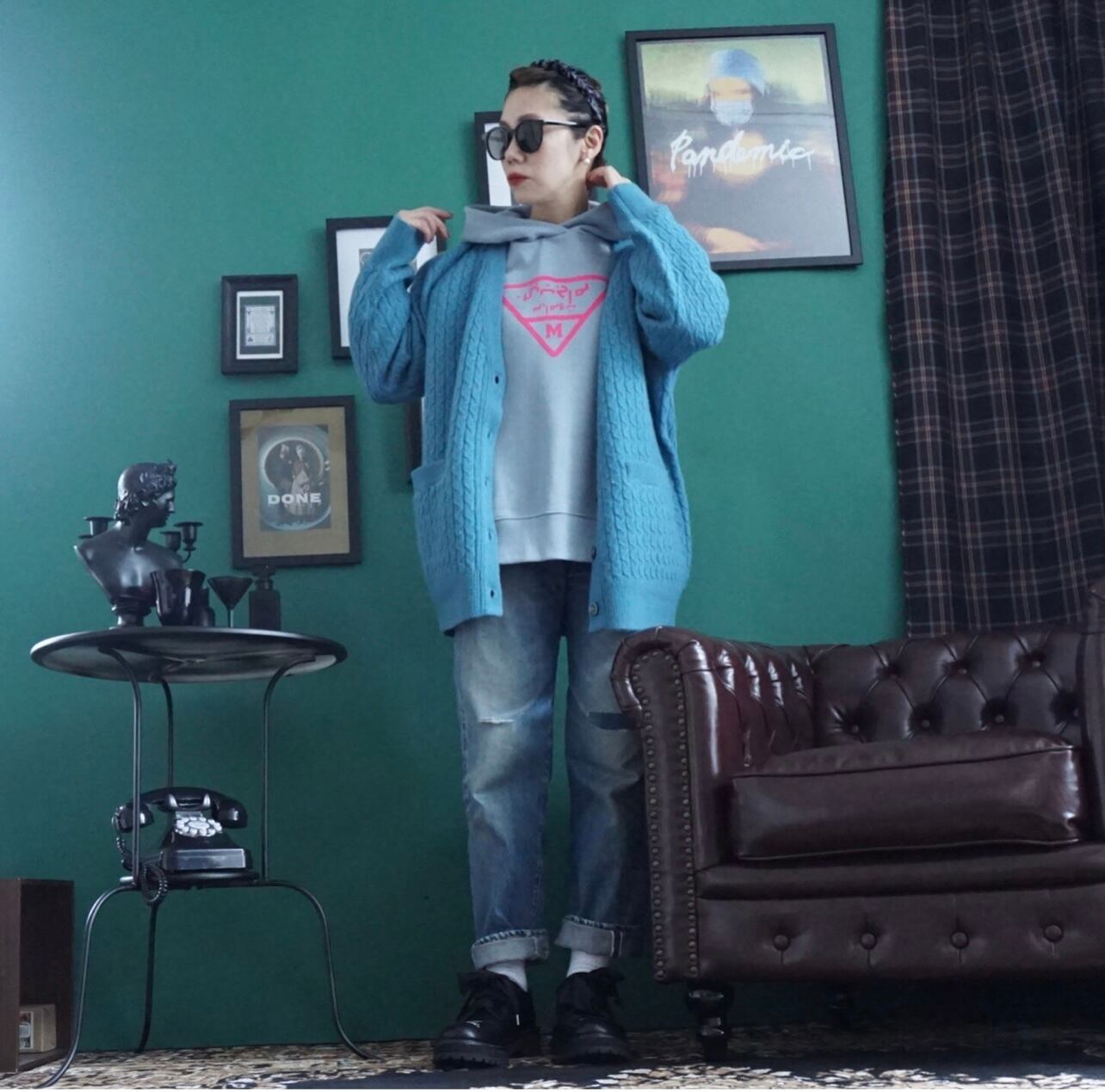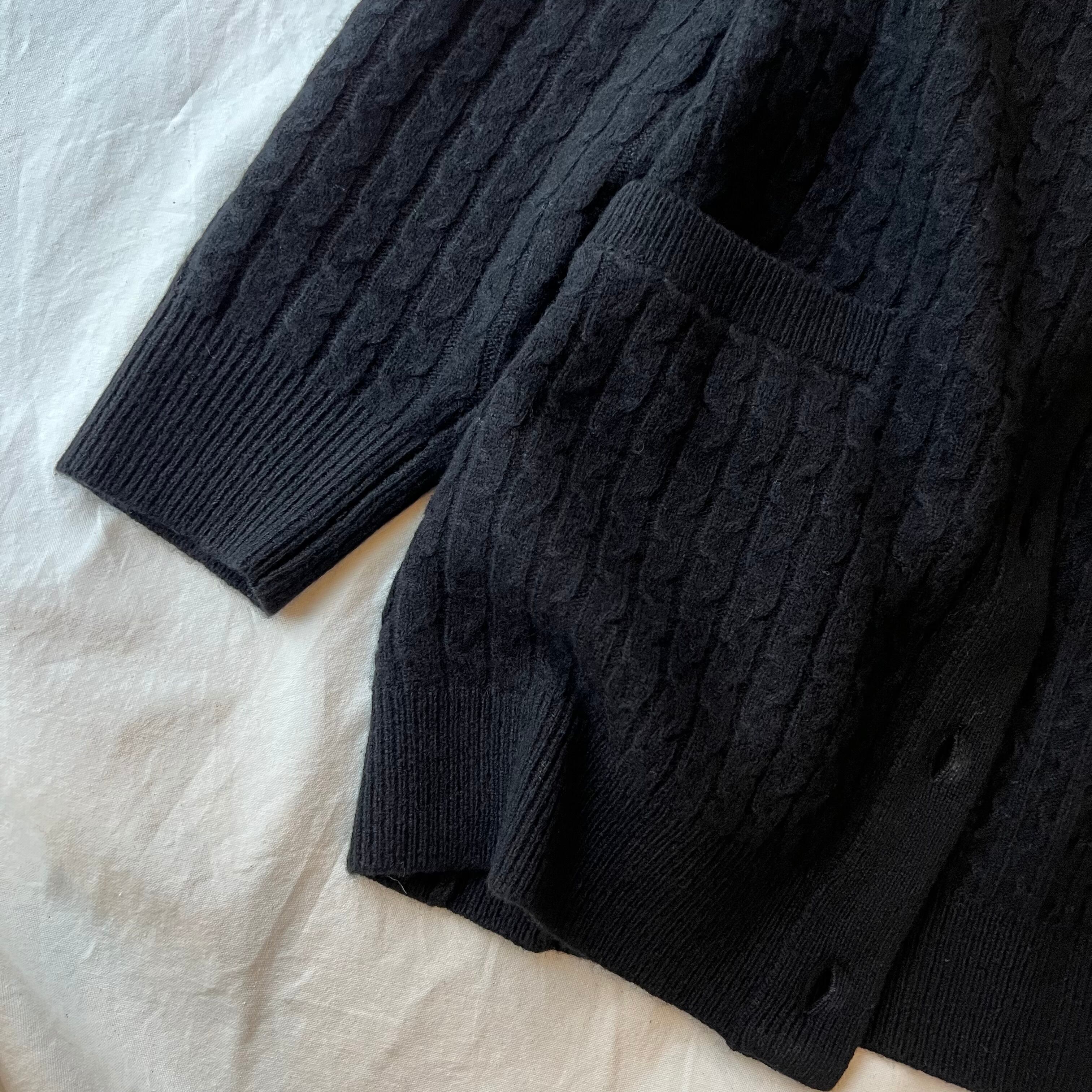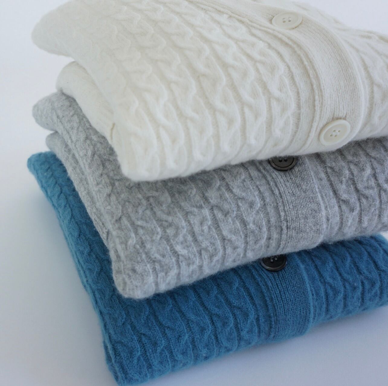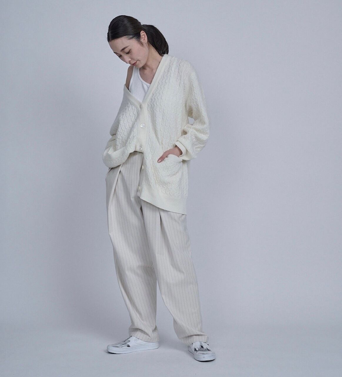 いつものVネックカーディガンを流行のミニケーブルにしてみました。やや厚手でとても暖かなウール100%です。柔らかくて細い糸です。とても心地よい肌触り。寒い真冬に本当に重宝します。いつもは柄で表現していましたが、今回は単色にしました。ですので存在感があり過ぎず毎日着用しても飽きが来ないのではないかなと思います。特に気に入っているのはホワイトです。冬のホワイトコーディネートなども気になります。ナイルブルーも新鮮なカラーです。ややダークな色味なのでブラックなどに合わせやすいと思います。グレーはシルバーとの相性も良く、シルバーやゴールドのメタリックスカートと合わせて欲しいなと思います。