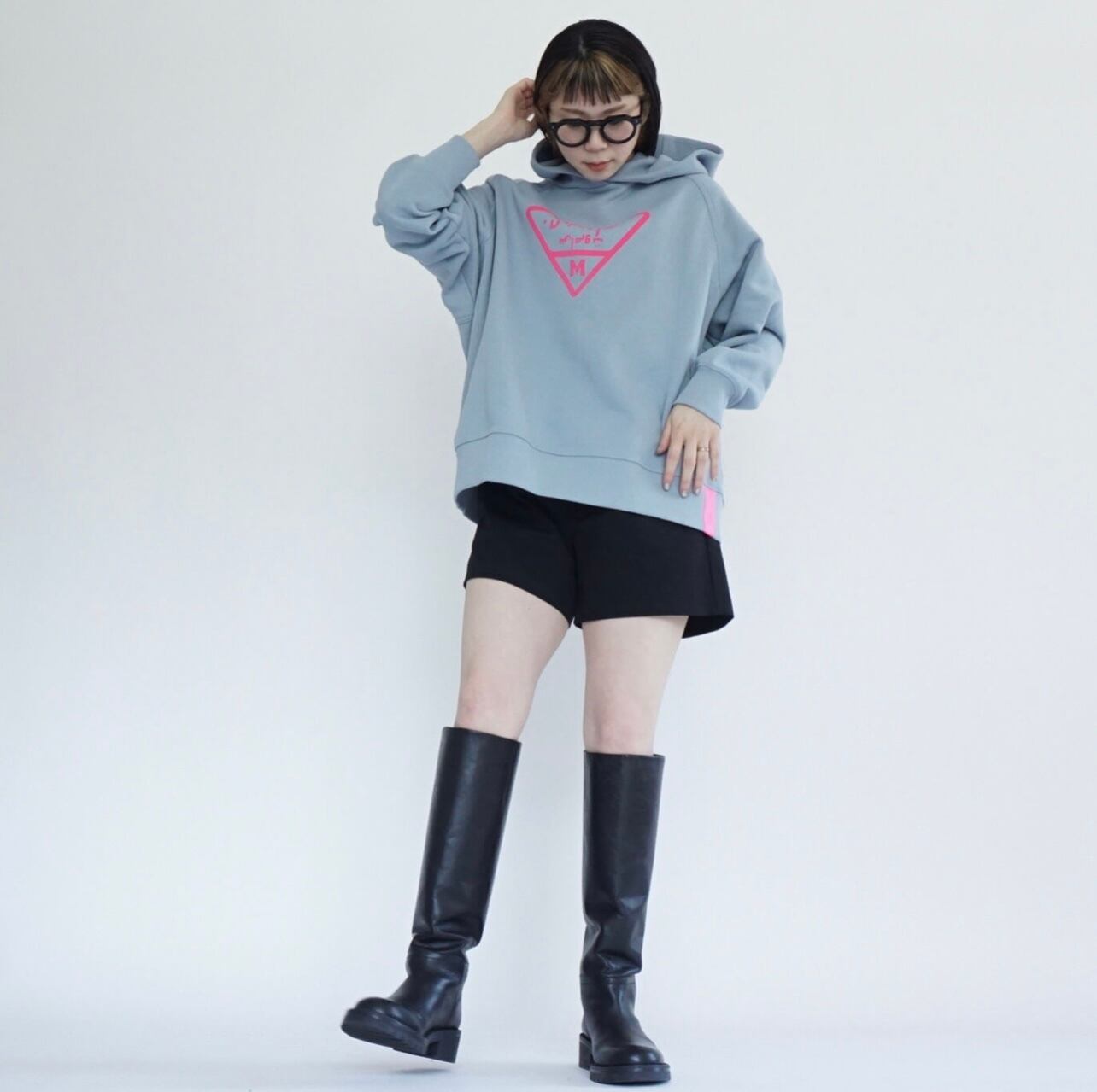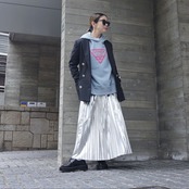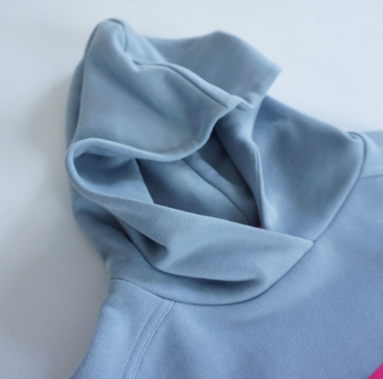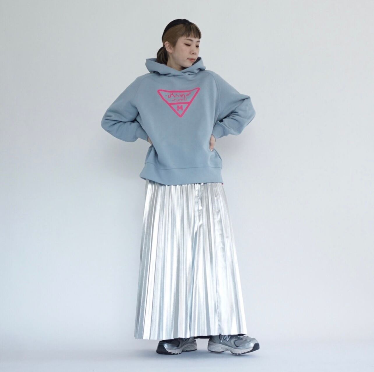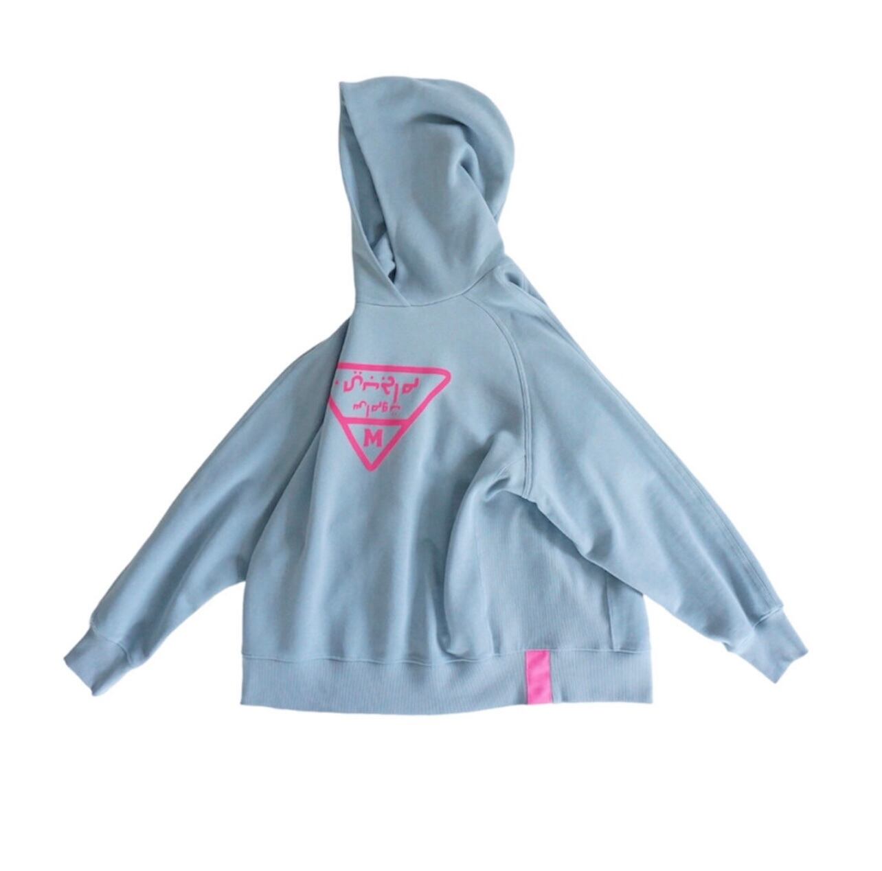 ライトブルーのスウェットパーカーです。オーバーサイズ。フロッキープリントのトキシックピンクのロゴが特徴的でとても気に入っています。しっかりとした作りでいつものスウェットのオーバーサイズと同じ形で大変人気なのでパーカーも作りました。マグパイのスウェットは丈夫なので長く愛用がきでます。また、オリジナルボディで腰回りに浮きができるように広めの身頃のパターンになっています。ヒップが隠れるくらいの長さ。スカートにもパンツにもよく合います。最近はウエストに引っ掛けて少し短めのシルエットにして着ることが増えました。コンパクトなトップスも最近気になりますが、ウエストに引っ掛けて着ることで短めのシルエットができるのでこのサイズ感は相変わらずお勧めです。腰回りが気になる方からの評価が非常に高く、ピッタリせず体から離れているのがストレスがなくて良いと言われます。下にシャツを着てもよし、白Tシャツを入れても良いと思います。今回のテーマカラーは、シルバー×サックスブルー。秋冬にサックスブルーのカラー使いはあまりないのであえて秋冬にブルーなどの寒色を加えてコーディネート提案をしたいと思いました。このパーカーにシルバーのスカート(2種類予約を取っています)スパンコールSKとメタリックシルバープリーツSKとも相性が良くお勧めです。ロゴデザインはマズローのヒエラルキーをイメージして三角形にしました。この中にアラビア文字でブランドネームを入れています。今流行しているデニムとも好相性です。今回デザインはしていませんが、上にデニムジャケット、ボトムにデニムのスカートなどと合わせても良いかなと思います。