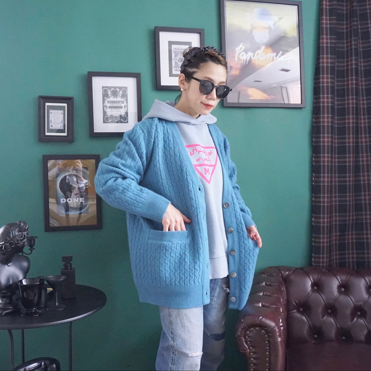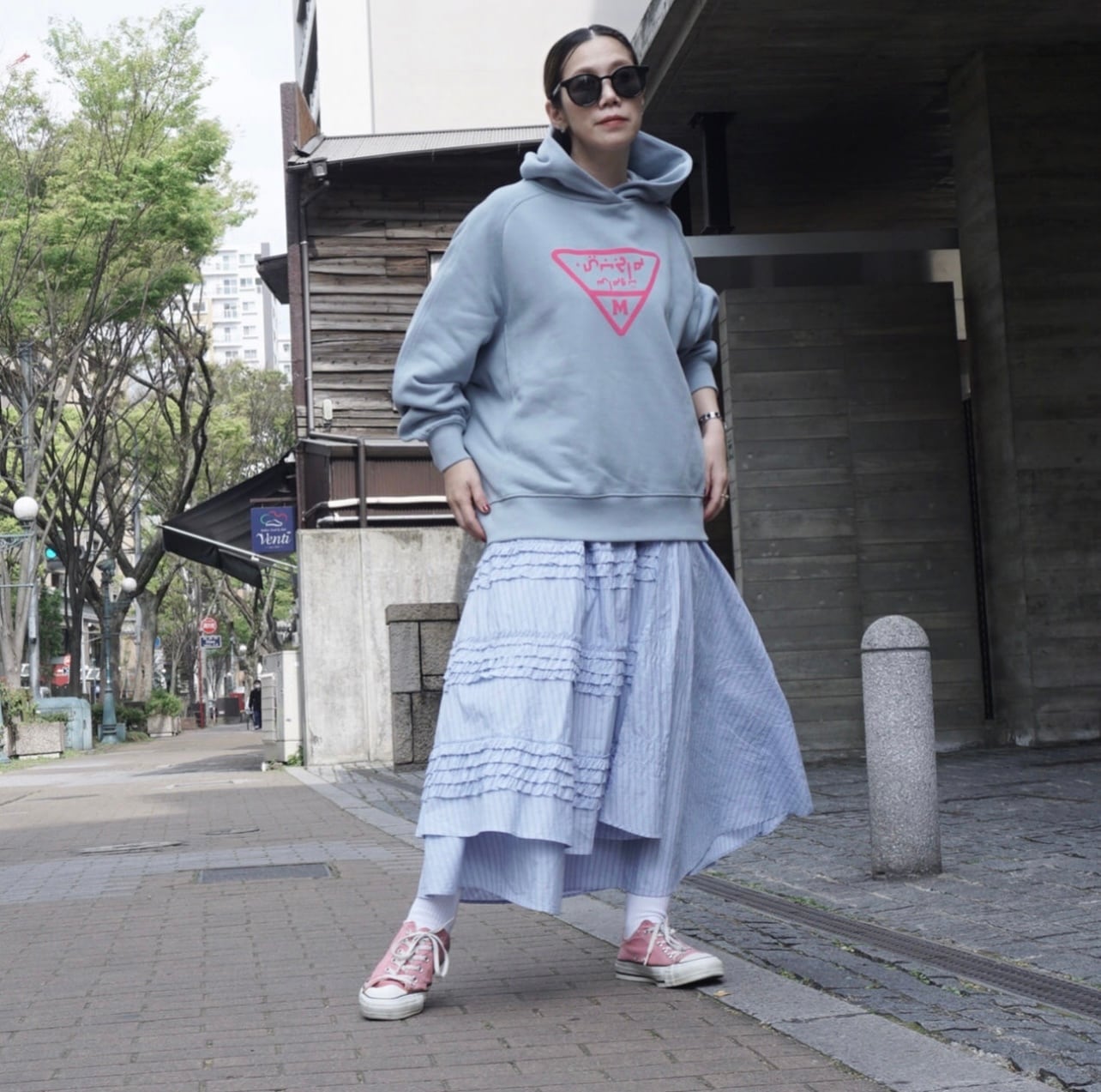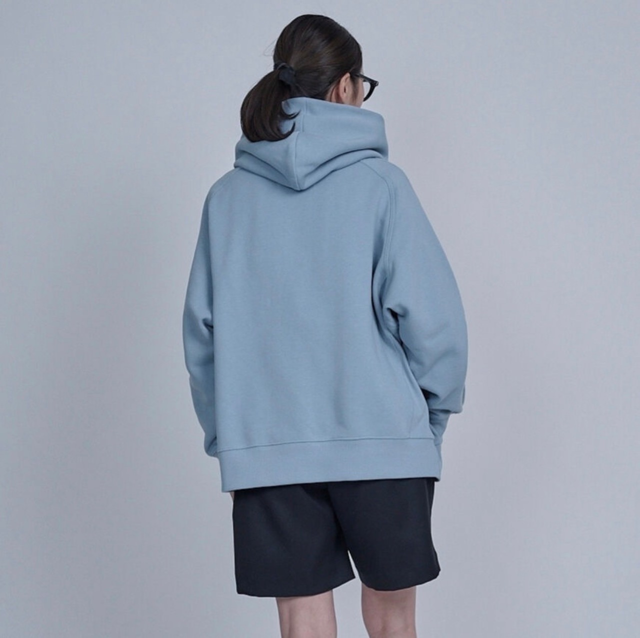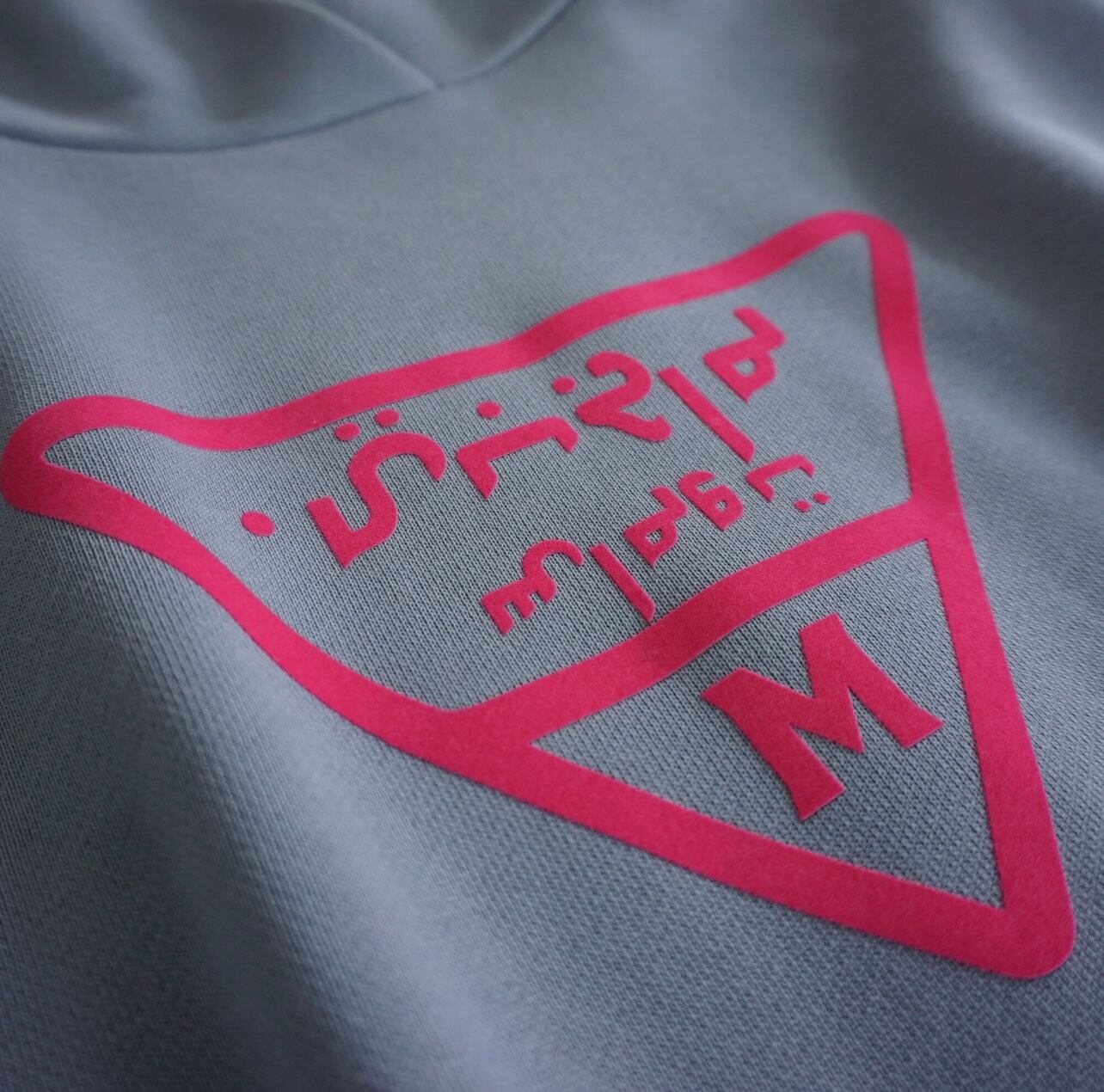 ライトブルーのスウェットパーカーです。オーバーサイズ。フロッキープリントのトキシックピンクのロゴが特徴的でとても気に入っています。しっかりとした作りでいつものスウェットのオーバーサイズと同じ形で大変人気なのでパーカーも作りました。マグパイのスウェットは丈夫なので長く愛用がきでます。また、オリジナルボディで腰回りに浮きができるように広めの身頃のパターンになっています。ヒップが隠れるくらいの長さ。スカートにもパンツにもよく合います。最近はウエストに引っ掛けて少し短めのシルエットにして着ることが増えました。コンパクトなトップスも最近気になりますが、ウエストに引っ掛けて着ることで短めのシルエットができるのでこのサイズ感は相変わらずお勧めです。腰回りが気になる方からの評価が非常に高く、ピッタリせず体から離れているのがストレスがなくて良いと言われます。下にシャツを着てもよし、白Tシャツを入れても良いと思います。今回のテーマカラーは、シルバー×サックスブルー。秋冬にサックスブルーのカラー使いはあまりないのであえて秋冬にブルーなどの寒色を加えてコーディネート提案をしたいと思いました。このパーカーにシルバーのスカート(2種類予約を取っています)スパンコールSKとメタリックシルバープリーツSKとも相性が良くお勧めです。ロゴデザインはマズローのヒエラルキーをイメージして三角形にしました。この中にアラビア文字でブランドネームを入れています。今流行しているデニムとも好相性です。今回デザインはしていませんが、上にデニムジャケット、ボトムにデニムのスカートなどと合わせても良いかなと思います。