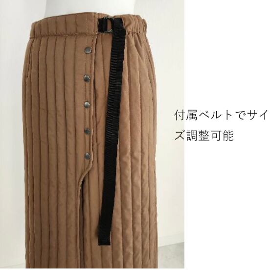 【DESIGN】 キルティング素材を用いたラップ・セミタイトスカートです。すっきりとした印象のセミタイ トなライン、足さばきしやすい後ろスリットは肌が見えない様、マチが付いています。バック はウエストゴム仕様のコンフォータブルな履き心地、フロントの附属ベルトでサイズ調整も可 能、ピタッとタイトになりすぎないのでストレスフリーな着心地です。便利な両サイドポケッ