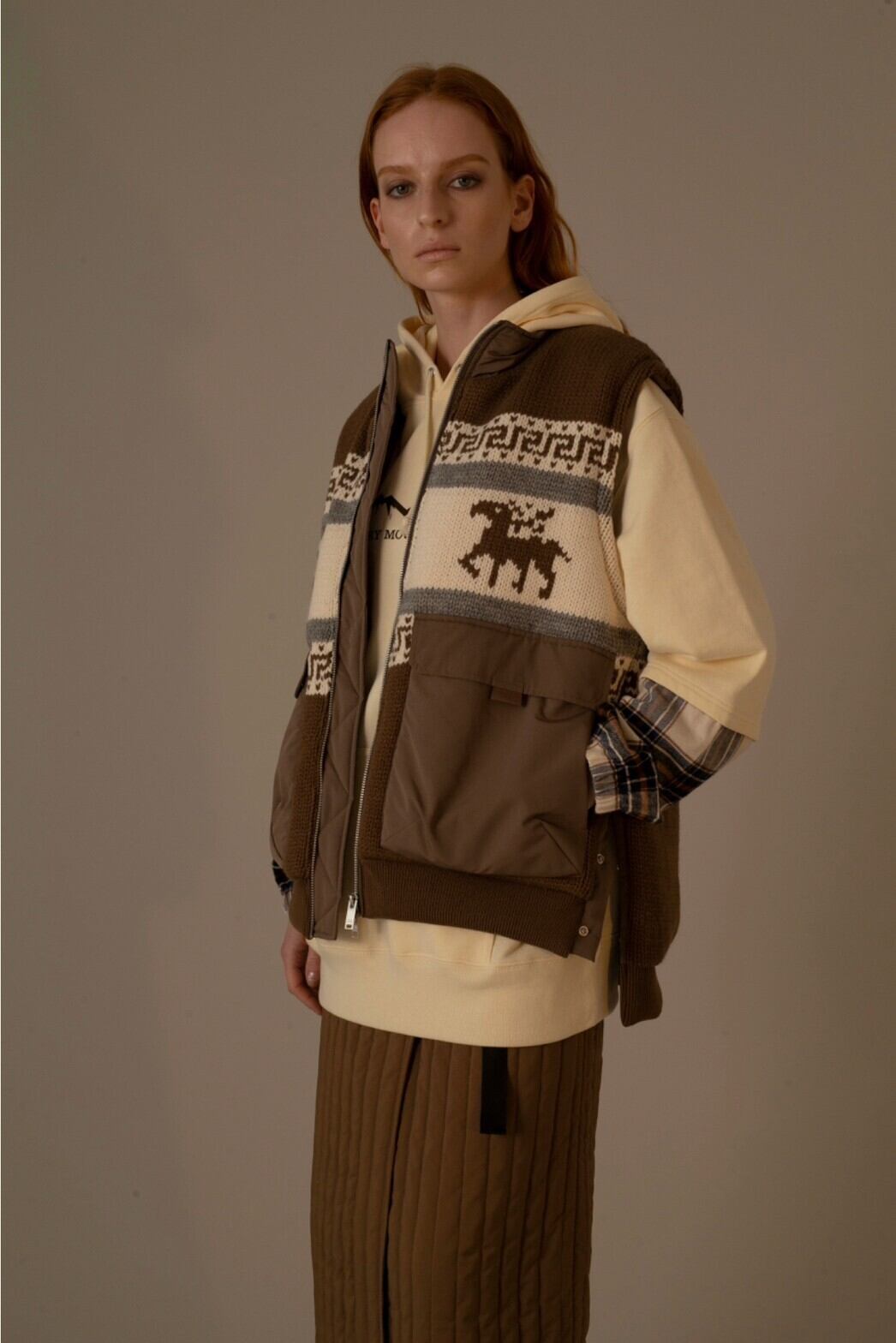 サラっとしたパウダリータッチの軽量ポリエステル素材に薄綿を挟み、サンドイッチ状にキル ト加工を施しています。縦ステッチが縦長を強調し、膨張して見えない様にしています。ゴワ ゴワせず柔らかい肌触り、中綿による保温性で暖かい素材感です。