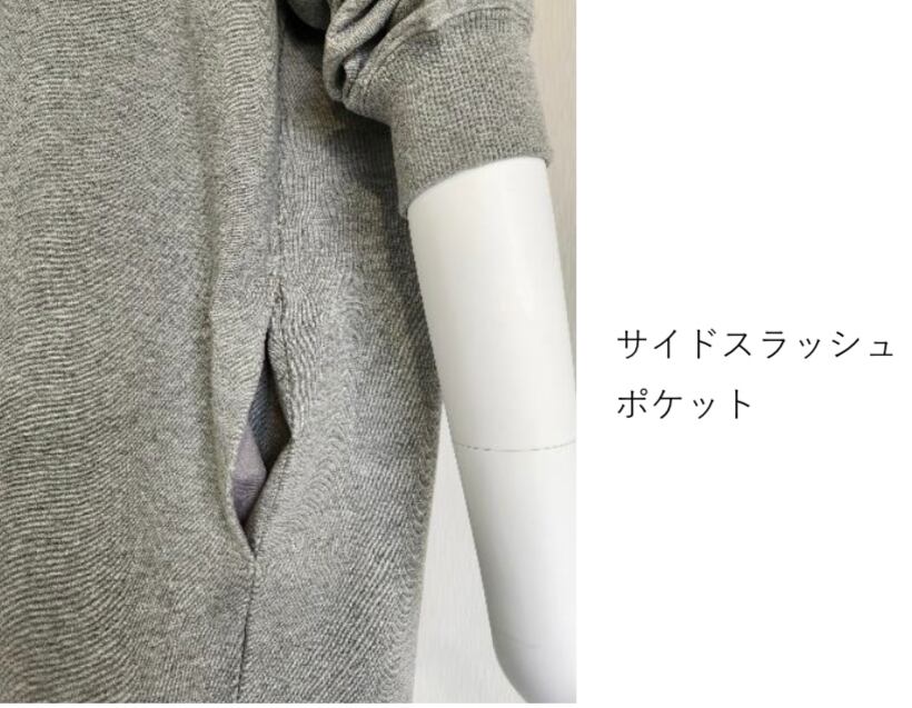 スウエットパーカーをロング丈にして着流しコートの様に仕立てました。変形のフーディで襟 元に立体的なボリューム感をが生まれ、雰囲気のある表情に。フードが後ろに流れず前振りに なることで顔周りをカバー。小顔効果もあります。両サイドにポケット付き、見返しは省き、 裾はオーバーロックで軽く仕上げ、重さを感じず軽やかに羽織れます。ジレやロングコートのインナーとしても合わせやすく、秋~真冬~春先と長く愛用出来るアイテムです。