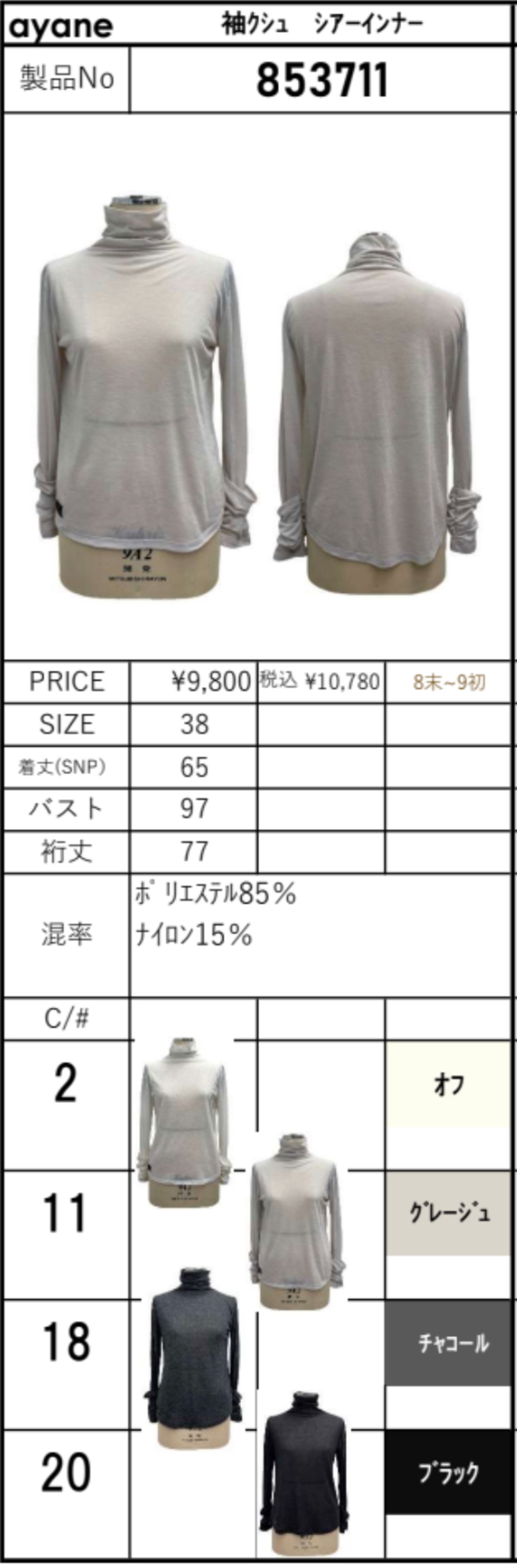 予約販売【 ayane 】袖クシュ シアーインナー(853711)9月上旬お届け