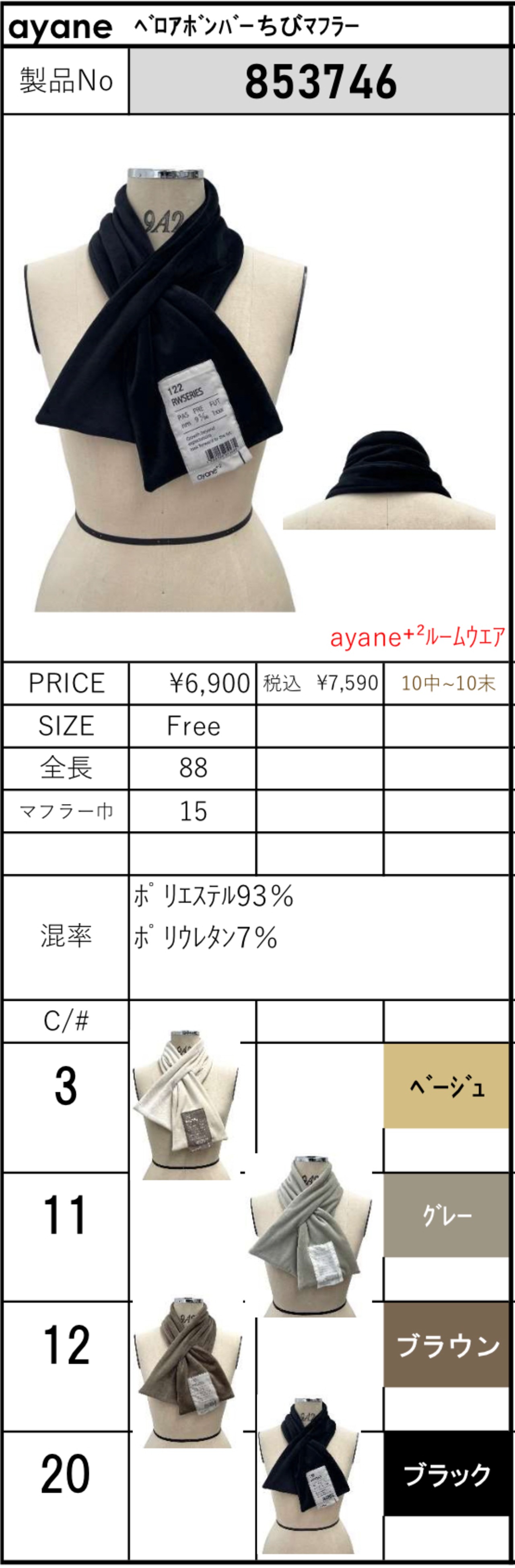 【 ayane 】ベロアボンバーちびマフラー(853746)