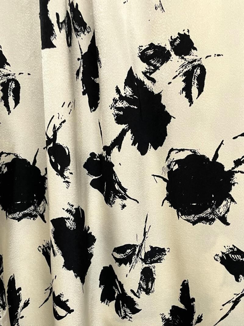 微光沢のサテン地に単色のモードな印象の花柄プリントを使用。