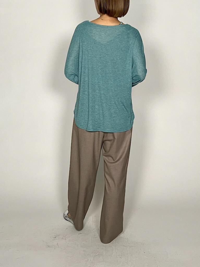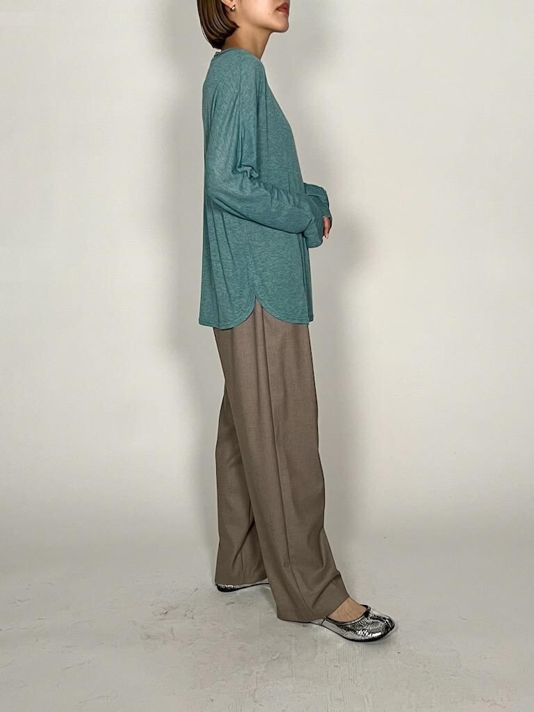 温かみがあり、程よい透け感と落ち感のある薄手フライス素材。