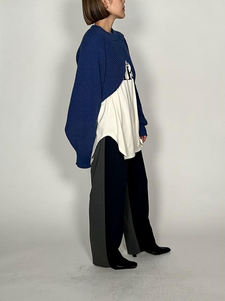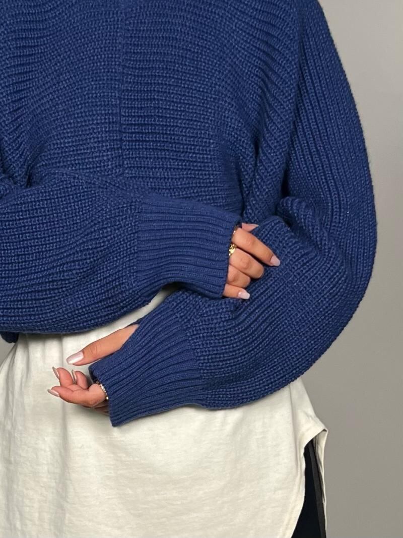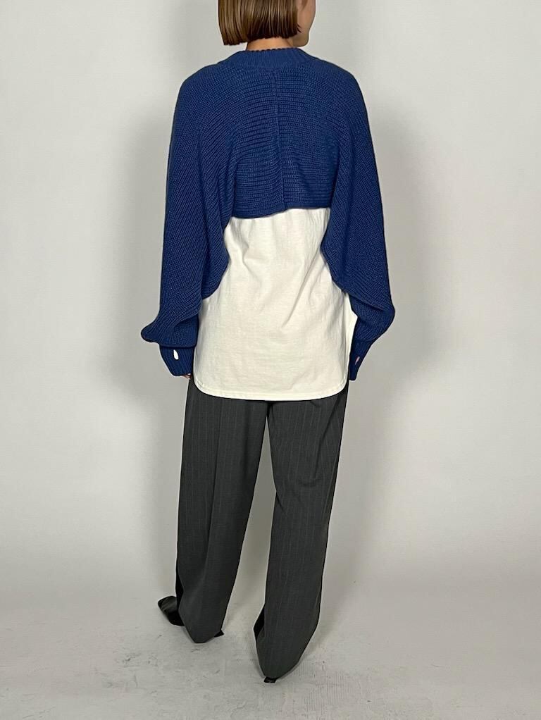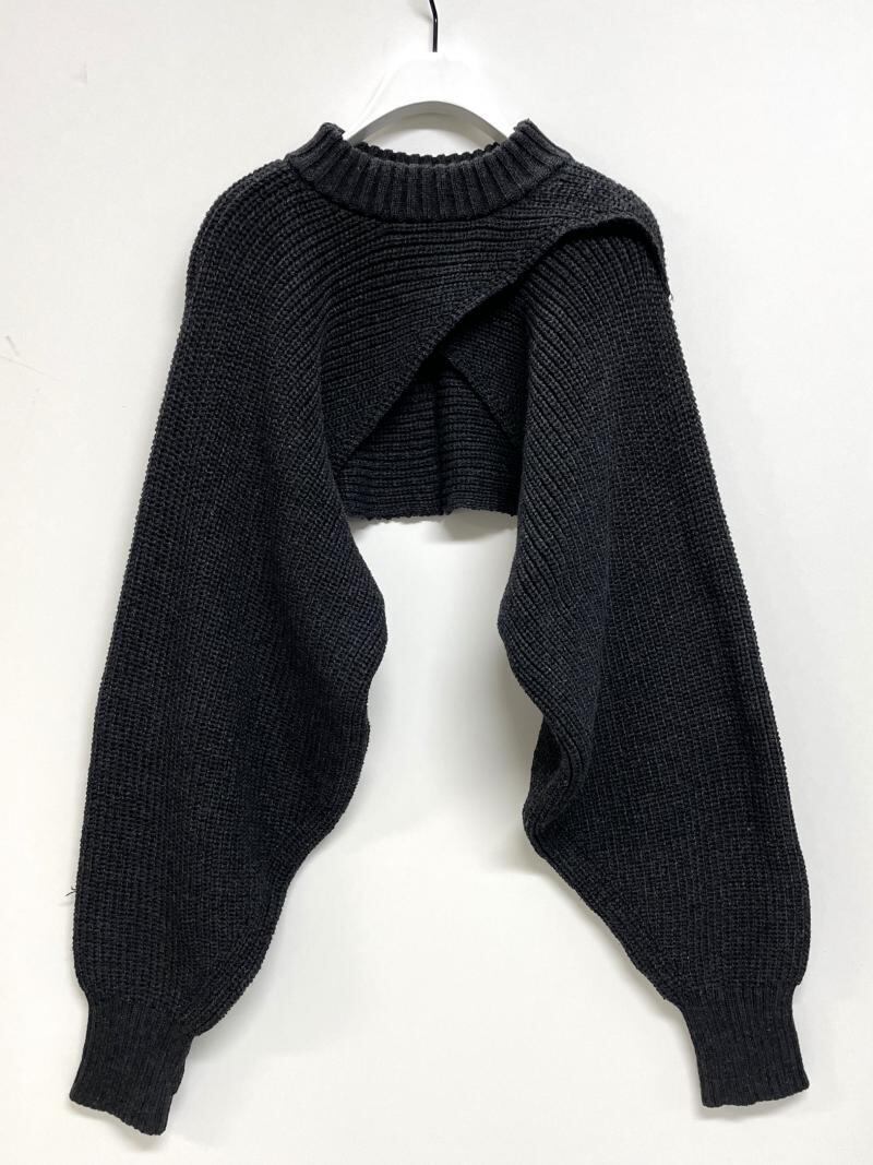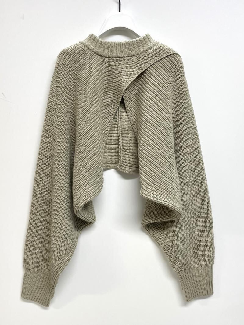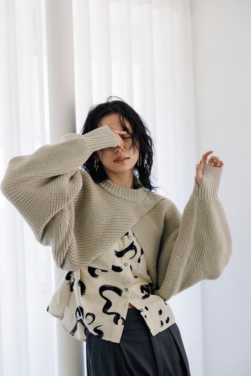 ふくらみのある糸をセレクトし、ボリューム感にこだわりました。袖口にはフォンガーホールが開いており、手元まで暖かくご着用いただけます。ワンピースとのレイヤードや、ハイウエストのボトムでのスタイリングがおすすめです。前後着用できる仕様・サイズ感に設計し、着回し力の高いアイテムに仕上げました。