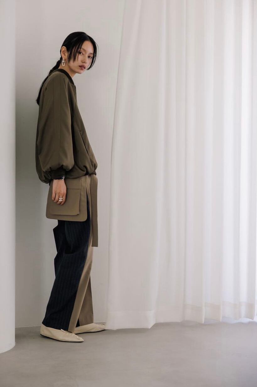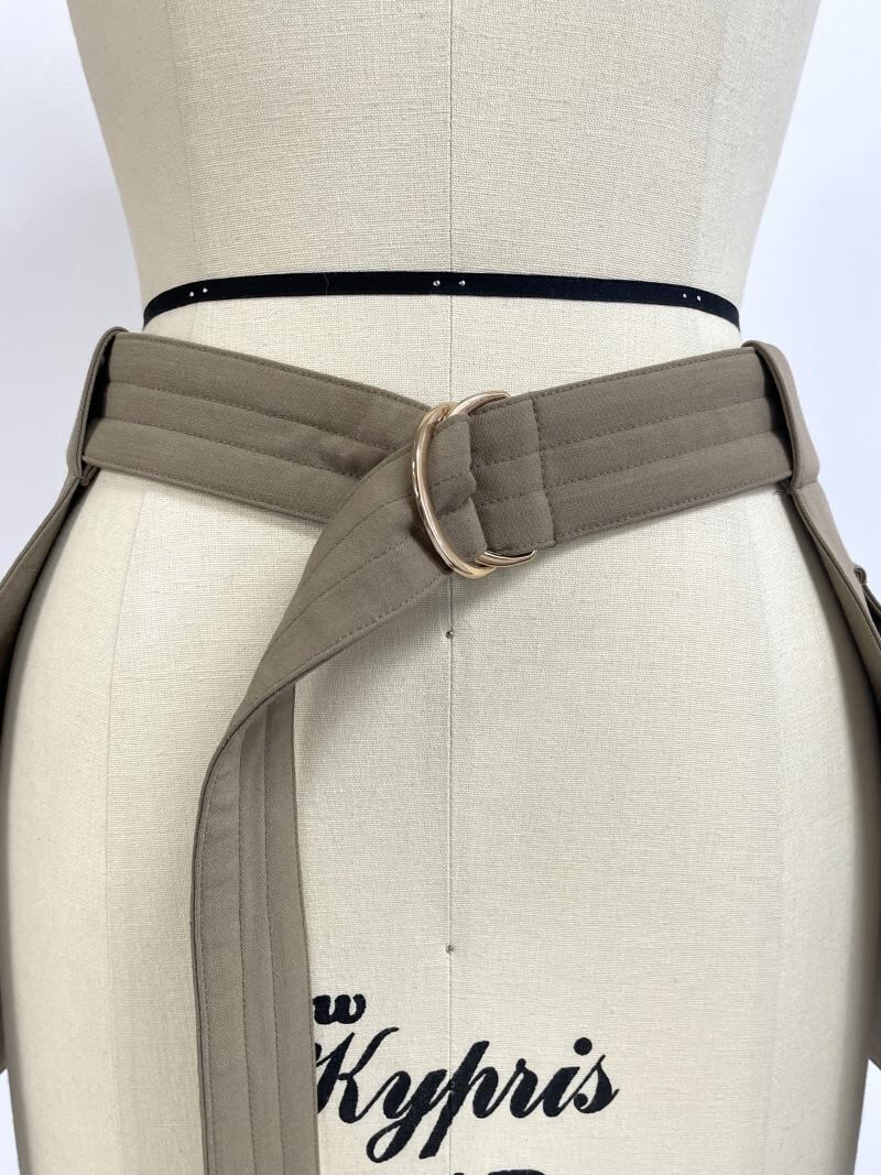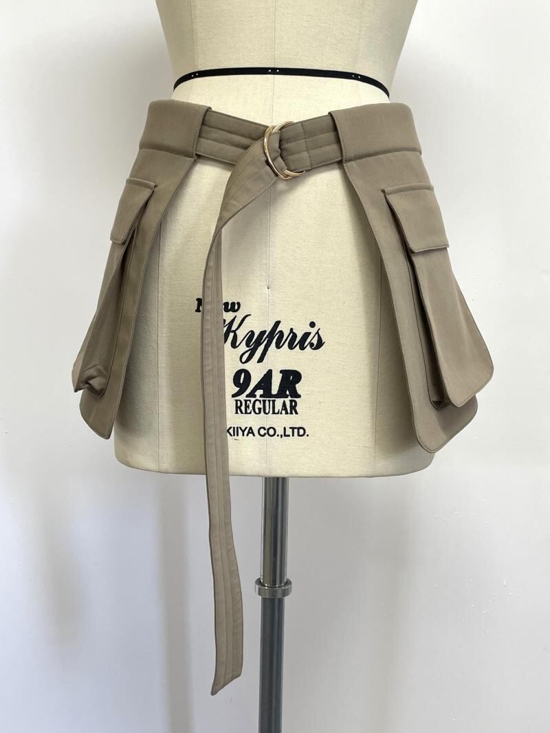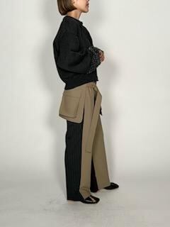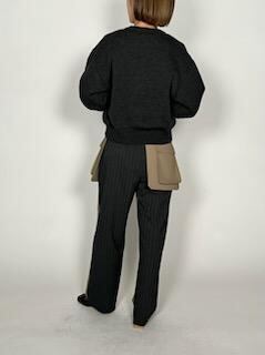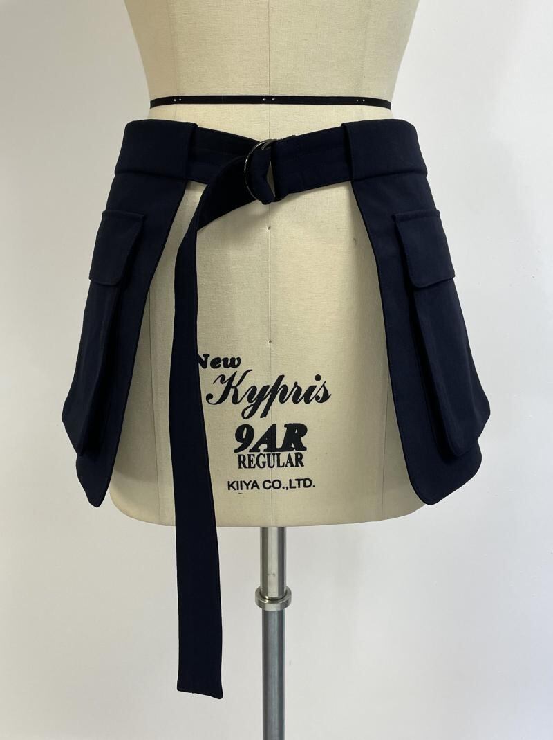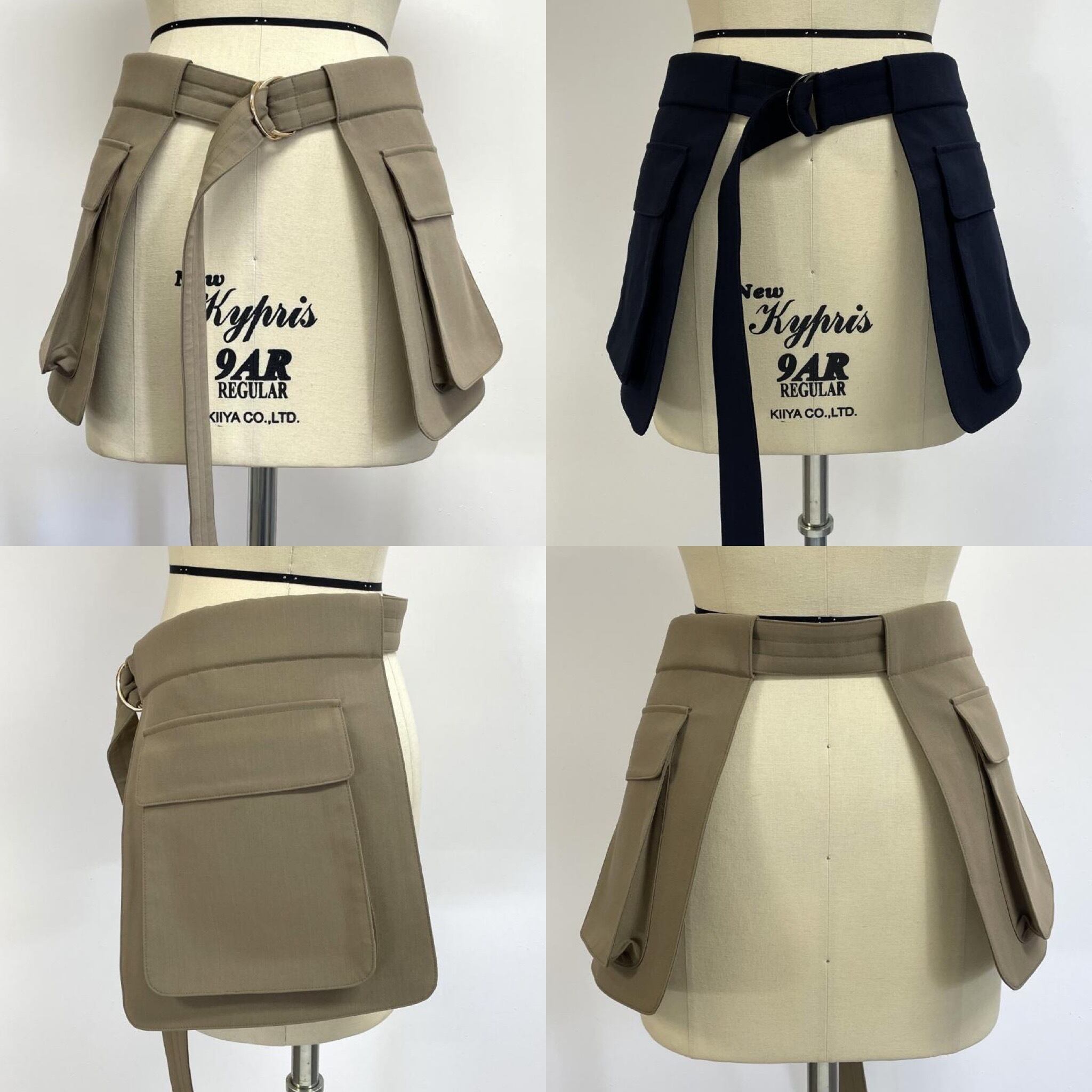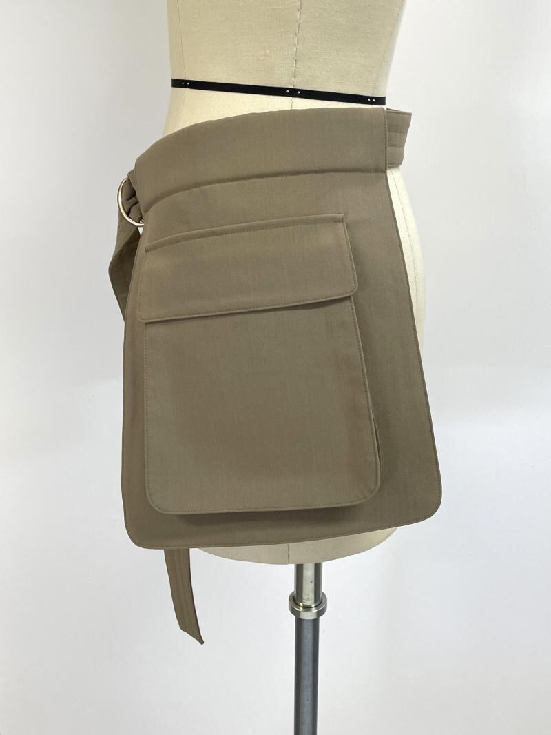 マニッシュな印象のスーツ地で大き目のデザインポケットを付けたユーティリティベルト。