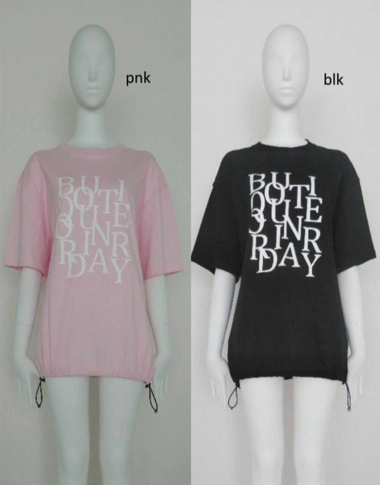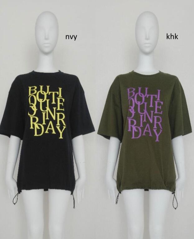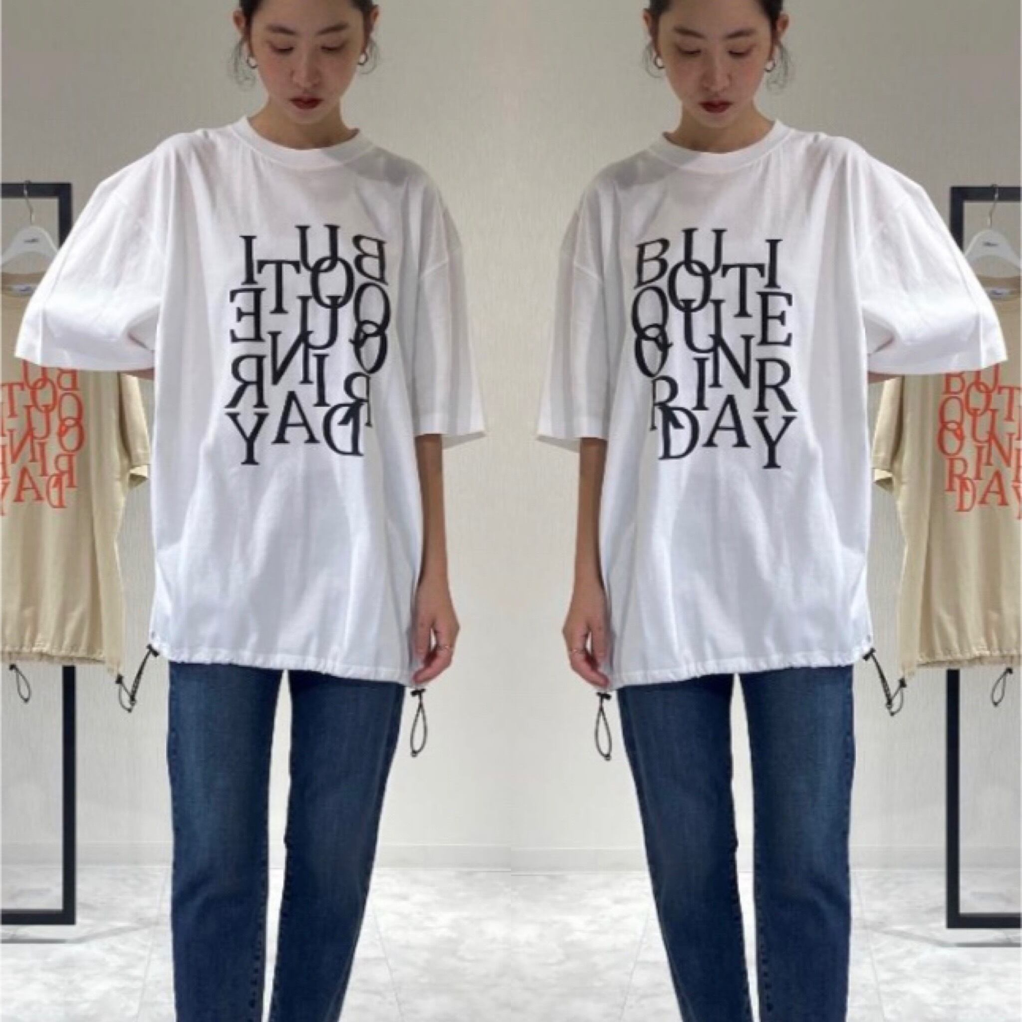 裾にスピンドルを通したXXLの超オーバーサイズのTシャツにBoutique Ordinaryの文字を散