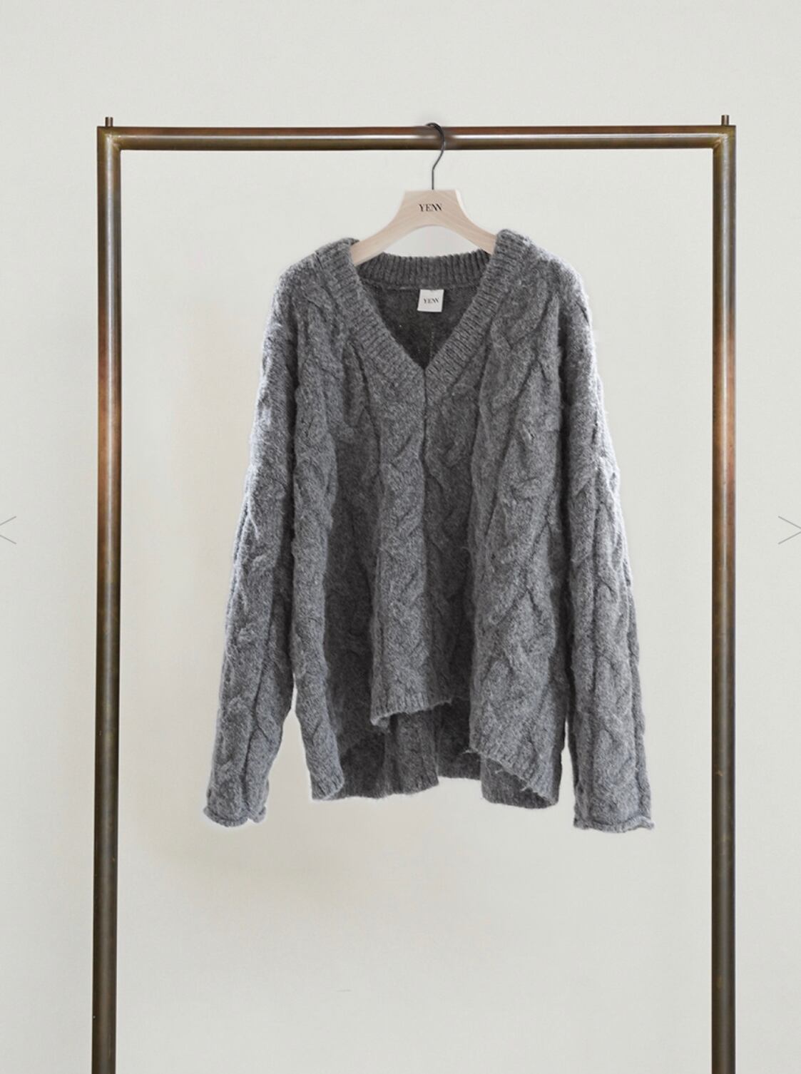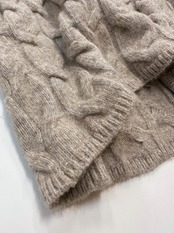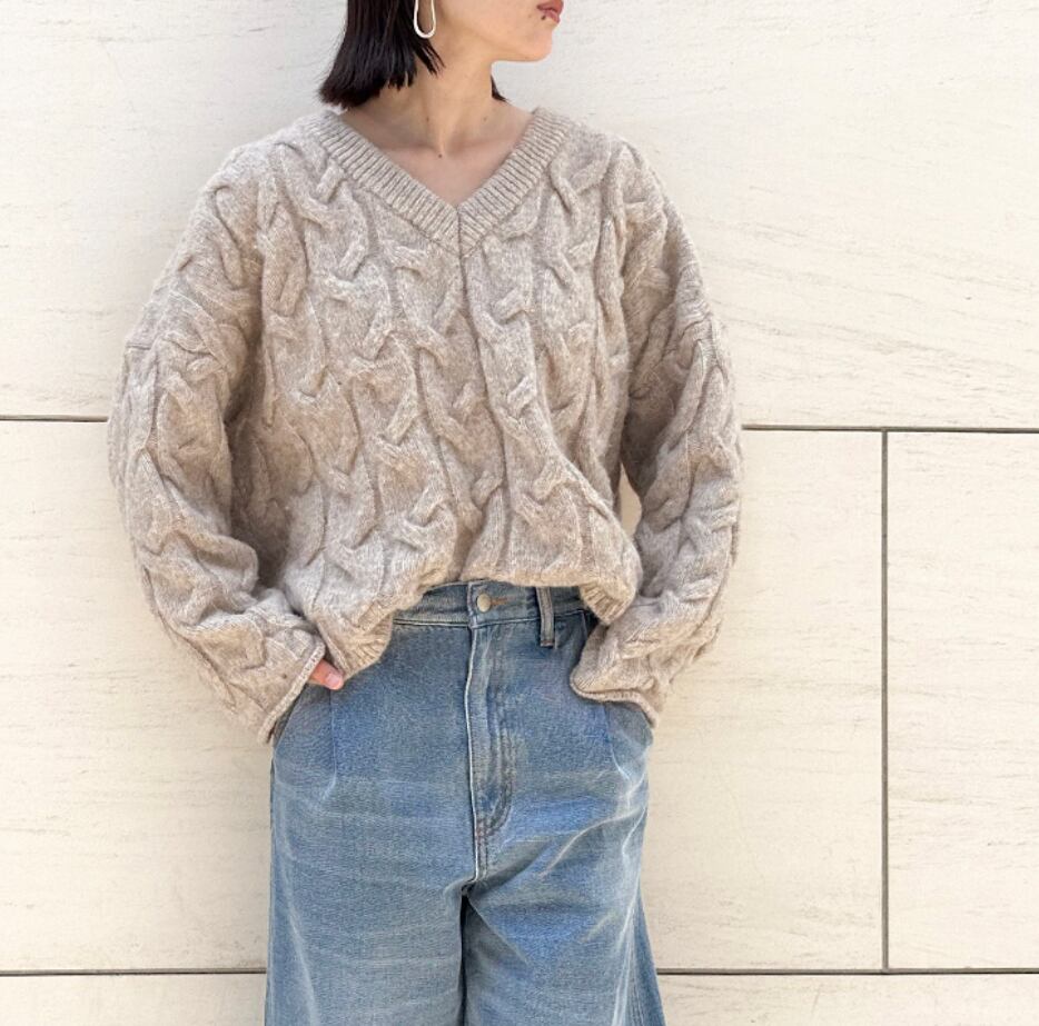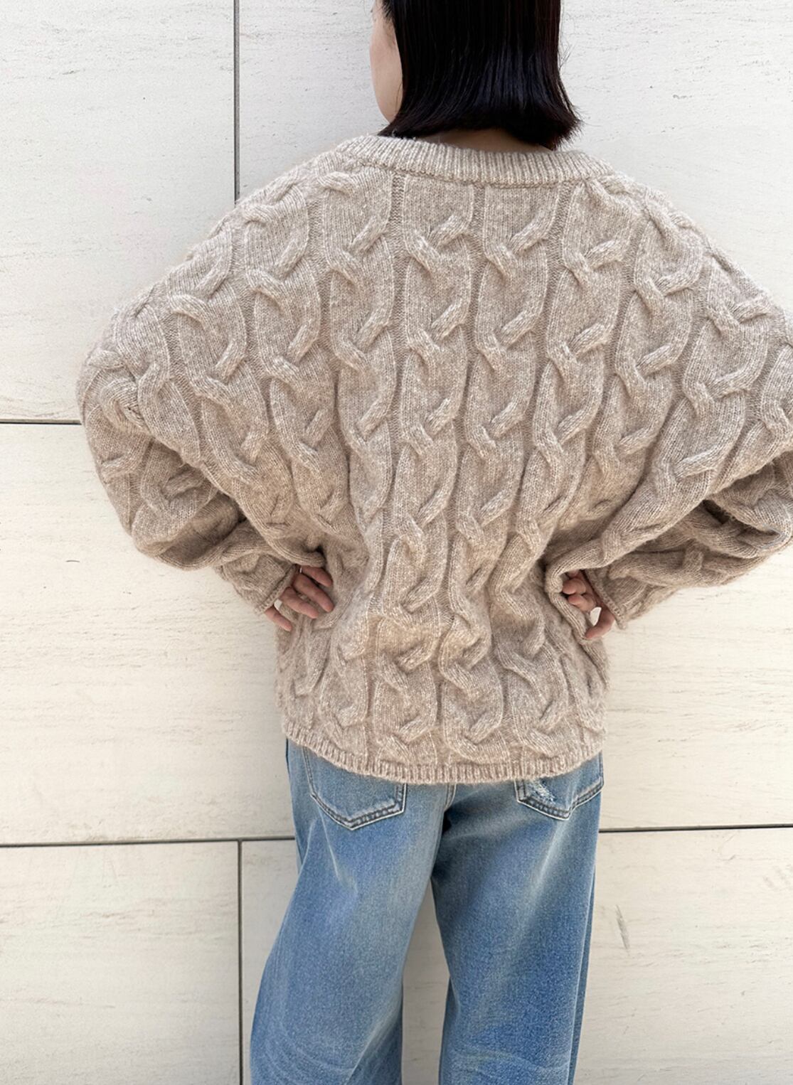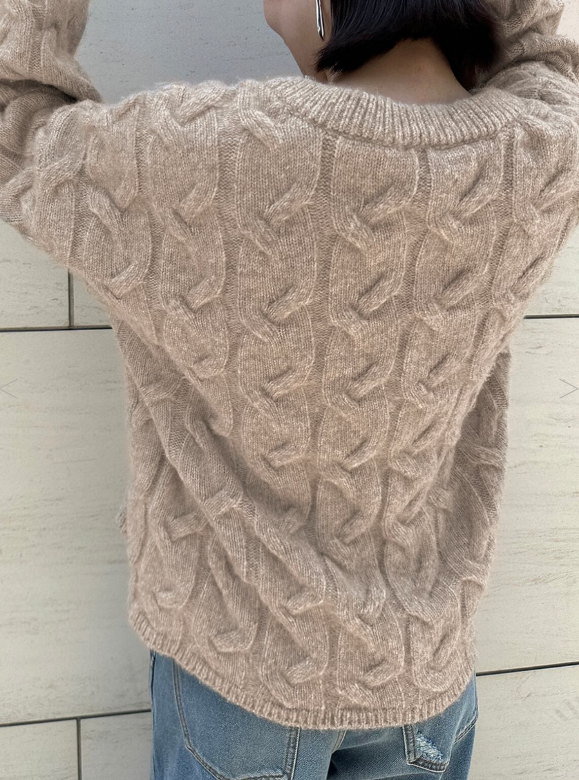 ふんわりした風合いのとても軽くて柔らかい素材で肌触りもなめらかで、ウールが苦手な方にもおすすめのニットトップスです。総柄で入れた大きめのケーブル柄はニットならでわのクラフト感がポイントです。 衿口を前に振って設定してあり、着用した時に後に持っていかれた分がドレープになるパターンになっています。Vネックあきなので、カジュアルになりがちなアイテムも女性らしく着用いただけます。 本当に軽くてストレスフリーで着用いただけるおすすめの1枚です。
