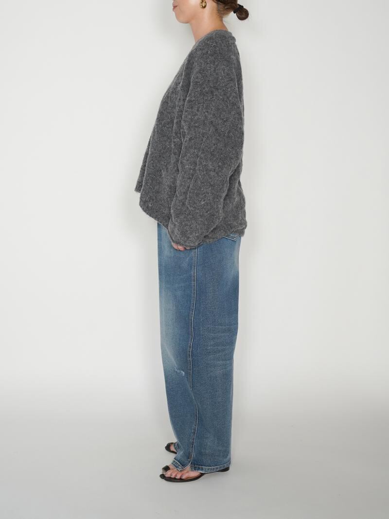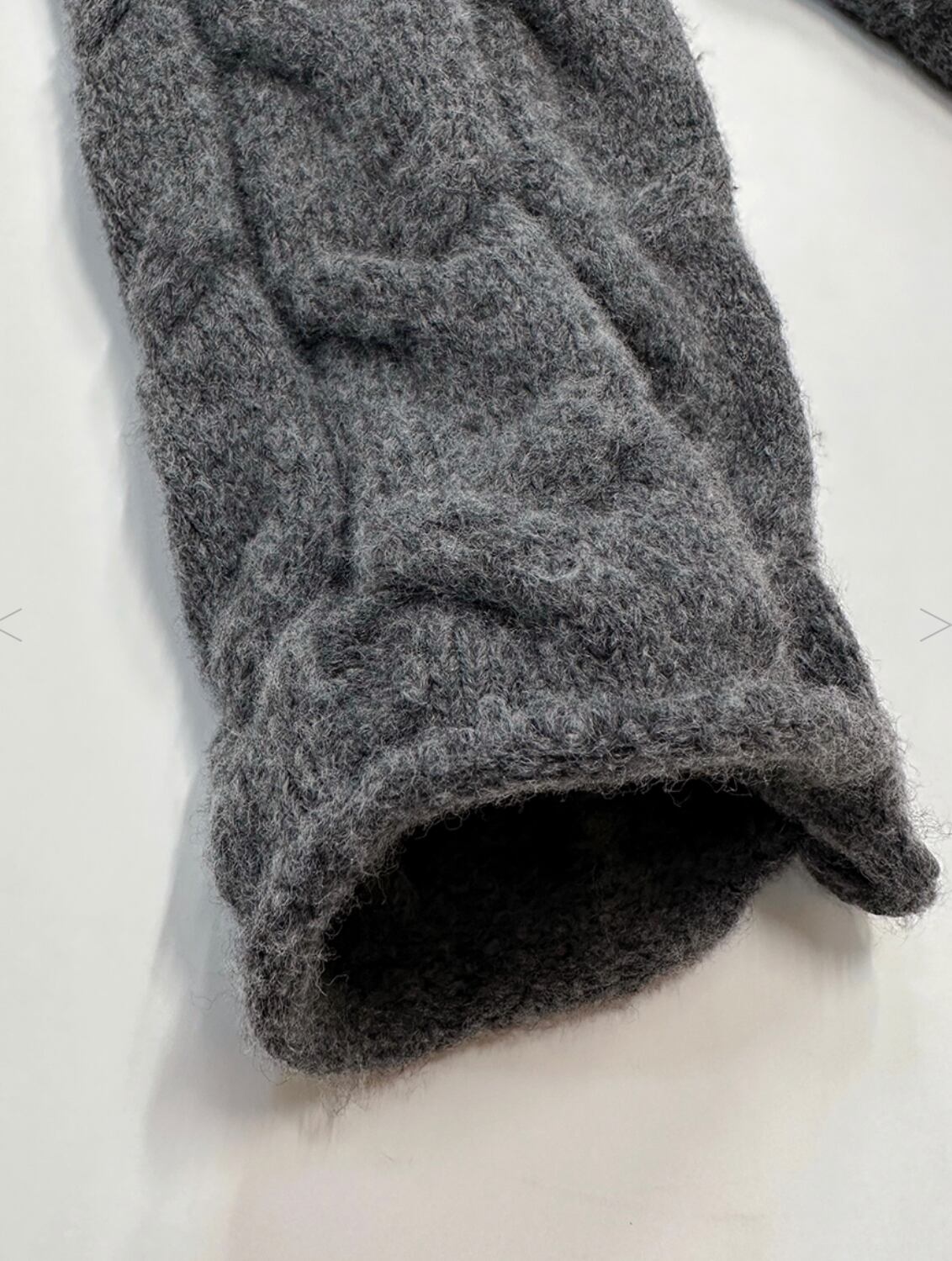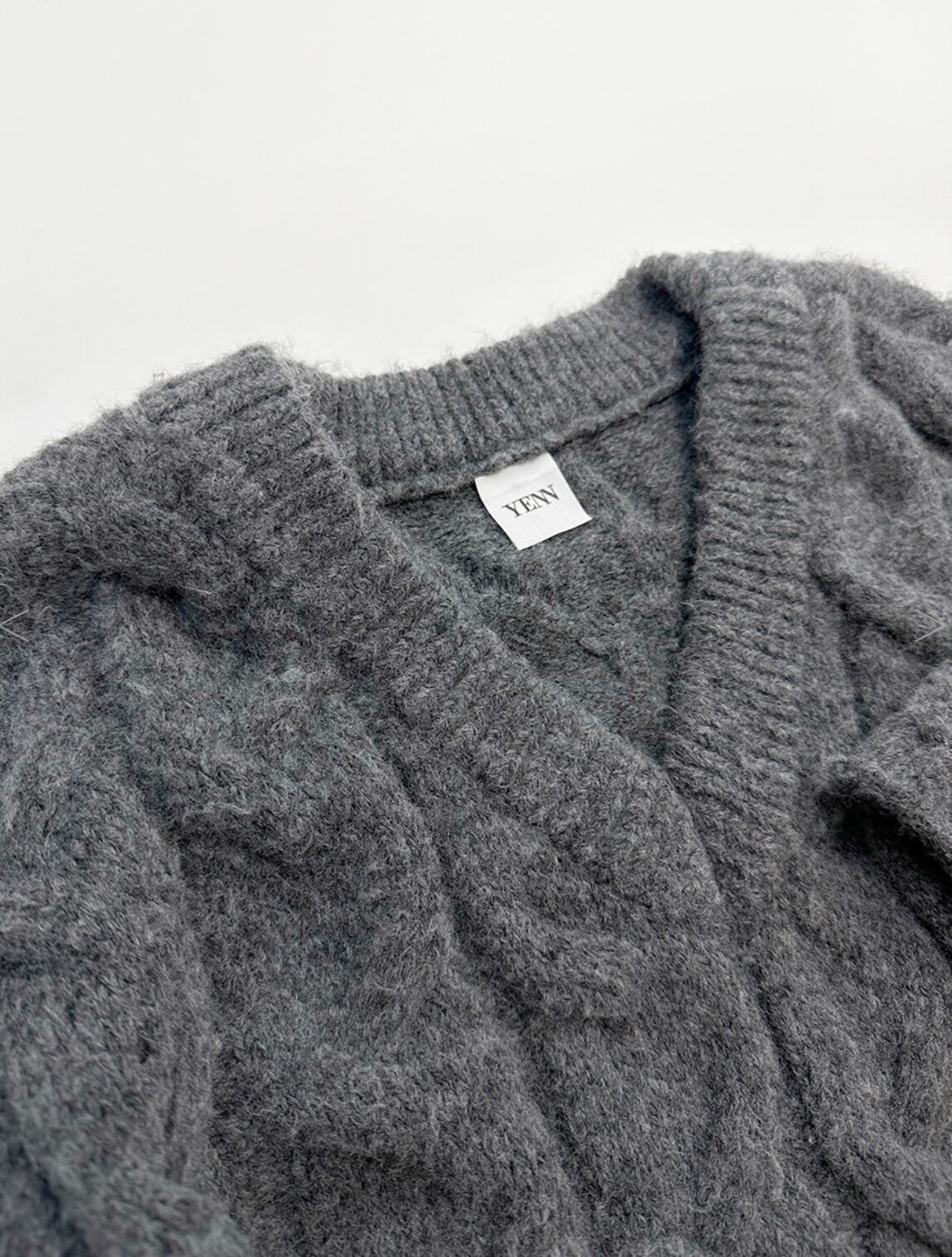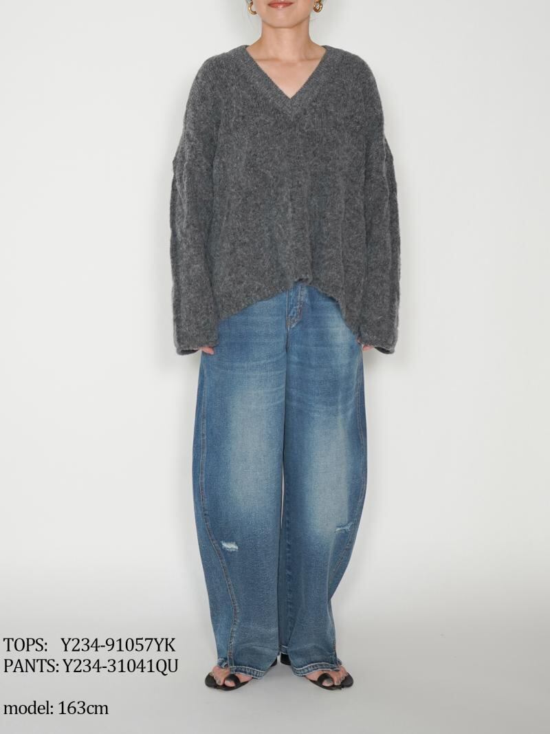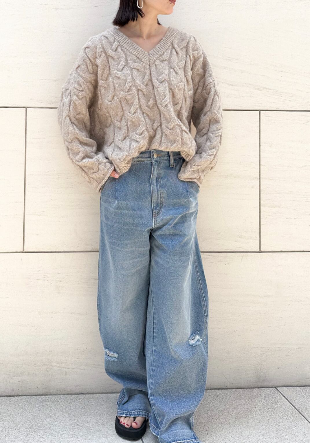 ふんわりした風合いのとても軽くて柔らかい素材で肌触りもなめらかで、ウールが苦手な方にもおすすめのニットトップスです。総柄で入れた大きめのケーブル柄はニットならでわのクラフト感がポイントです。 衿口を前に振って設定してあり、着用した時に後に持っていかれた分がドレープになるパターンになっています。Vネックあきなので、カジュアルになりがちなアイテムも女性らしく着用いただけます。 本当に軽くてストレスフリーで着用いただけるおすすめの1枚です。