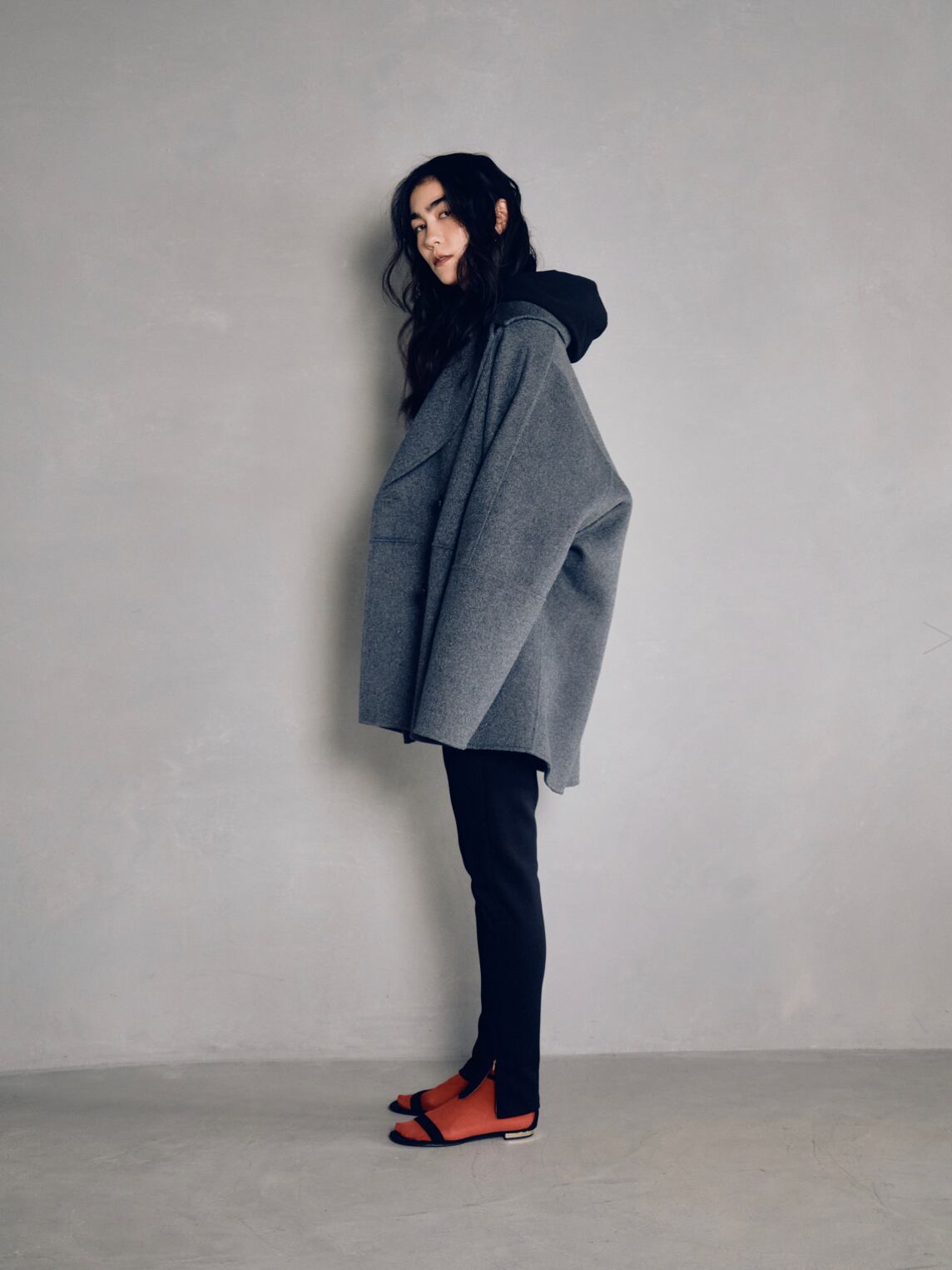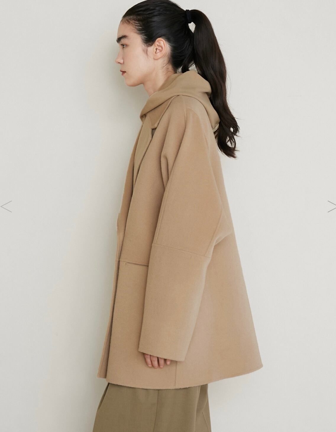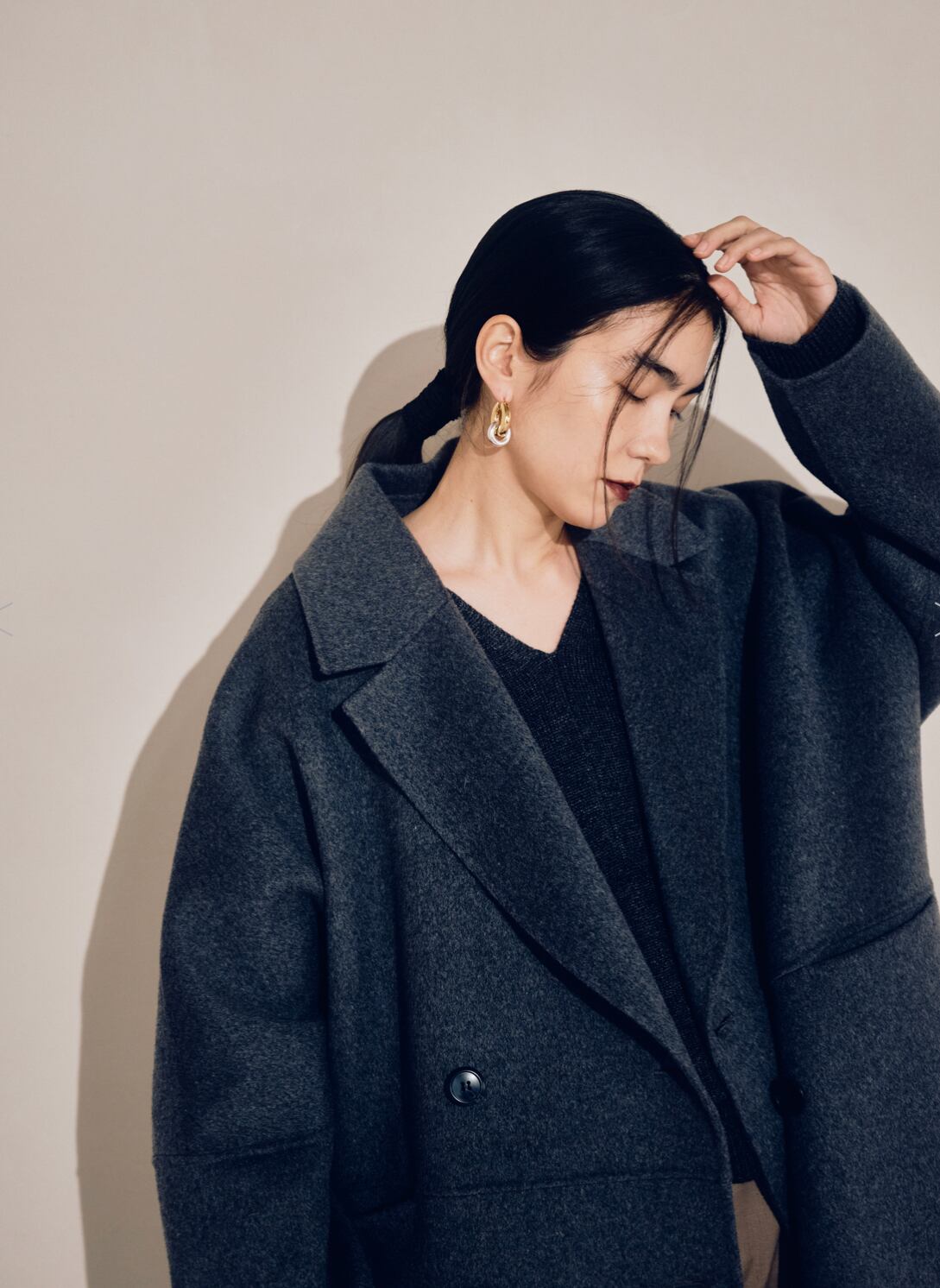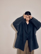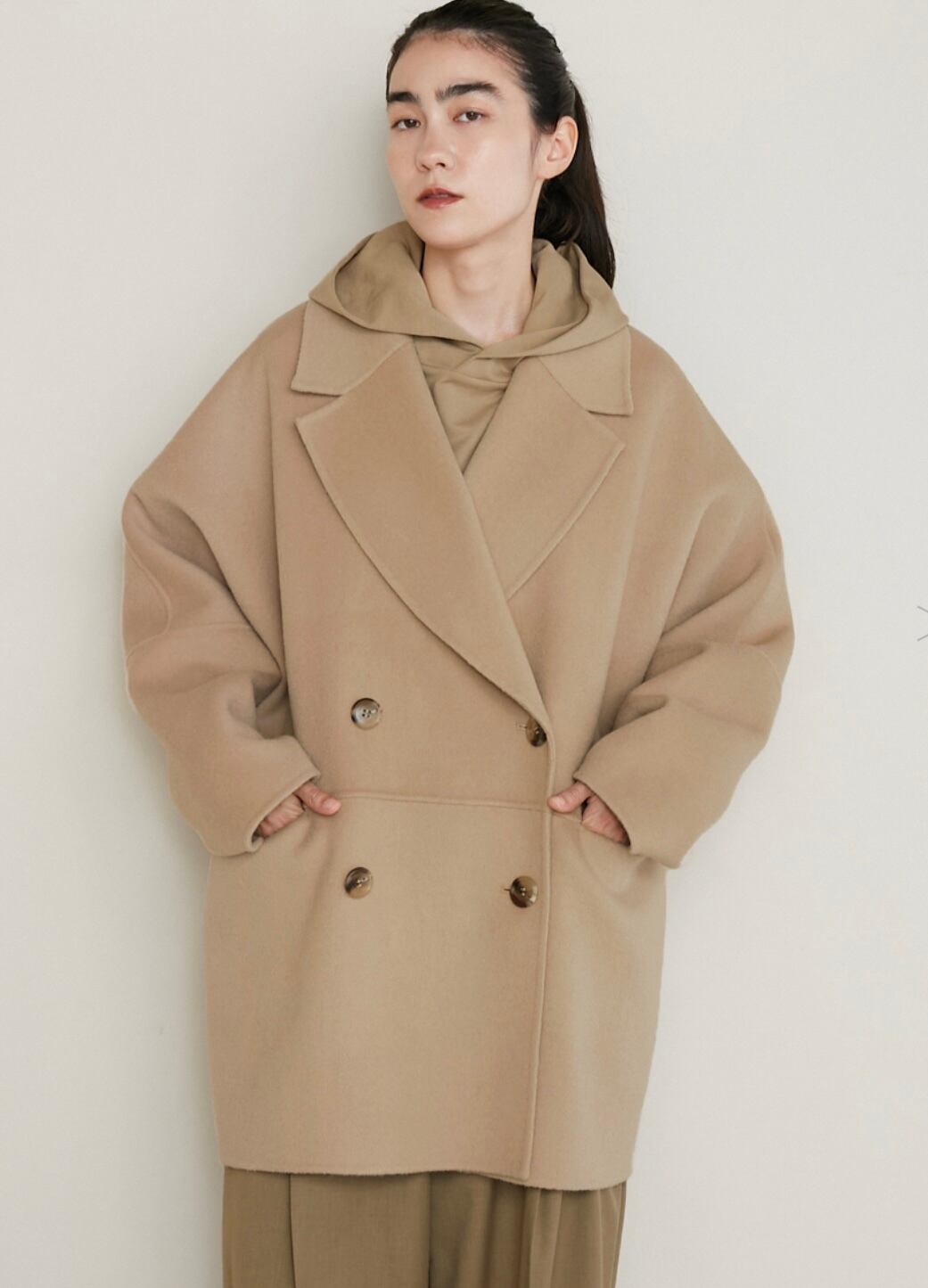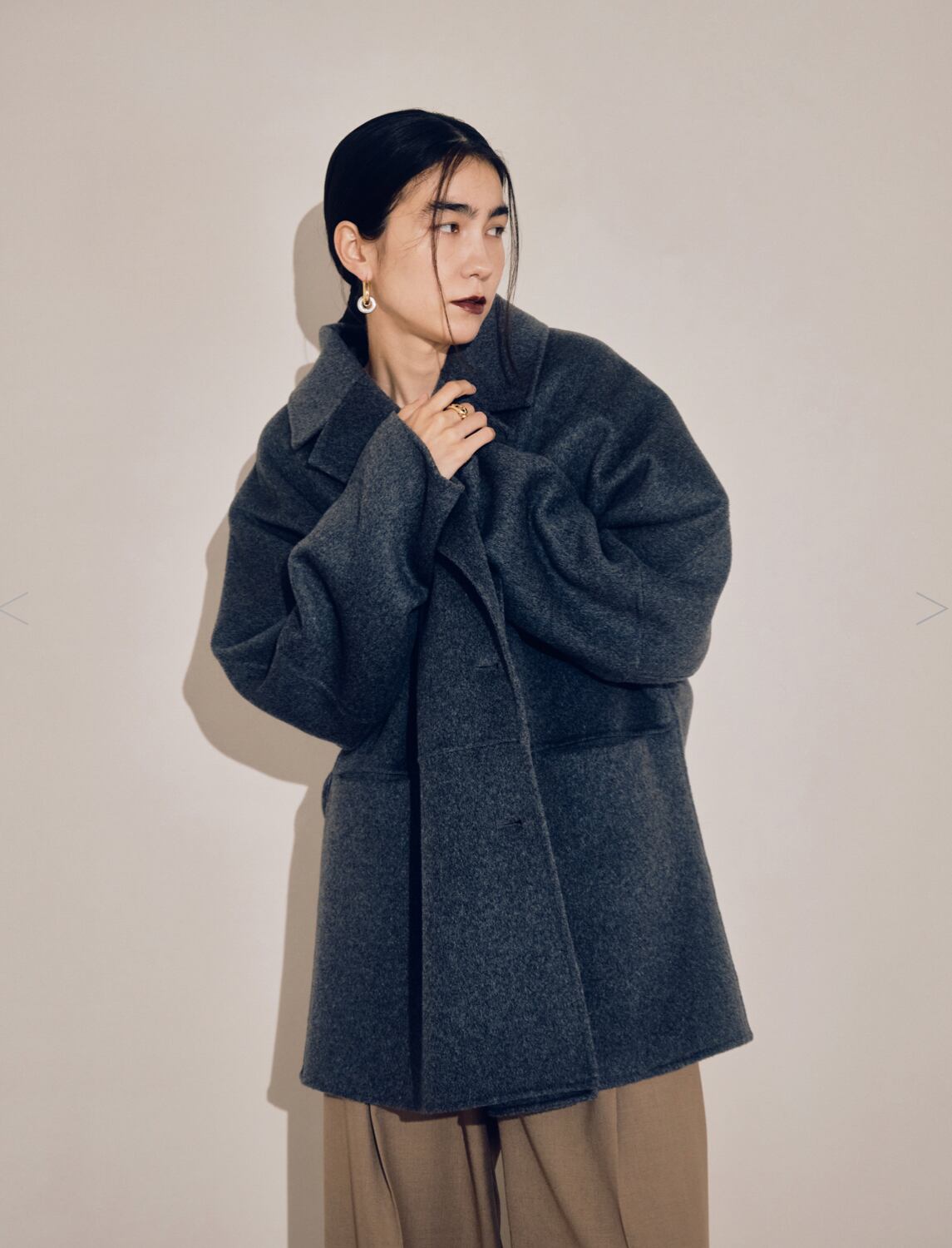 ゆったりとしたドルマンシルエットは中のインナーを選ばず着込むことができます。 丈はミドル丈でボトムも合わせやすくなっています。 カジュアルでカチッとした印象になりがちなピーコートを、リラックス感のある女性らしいアイテムに仕上げました。ボリュームのある袖を下ろした時に横から見えるシルエットは絶妙にかわいいです。とても軽くトレンドにも左右されない定番的なアイテムでワードローブにぜひくわえていただきたい1枚です。