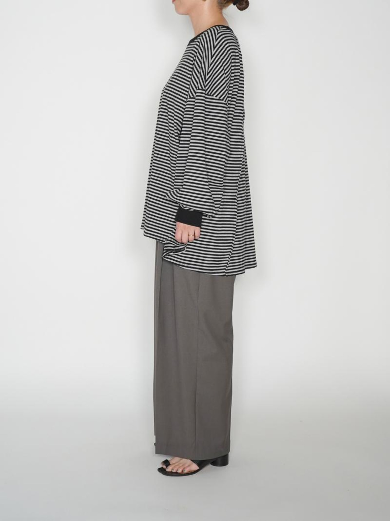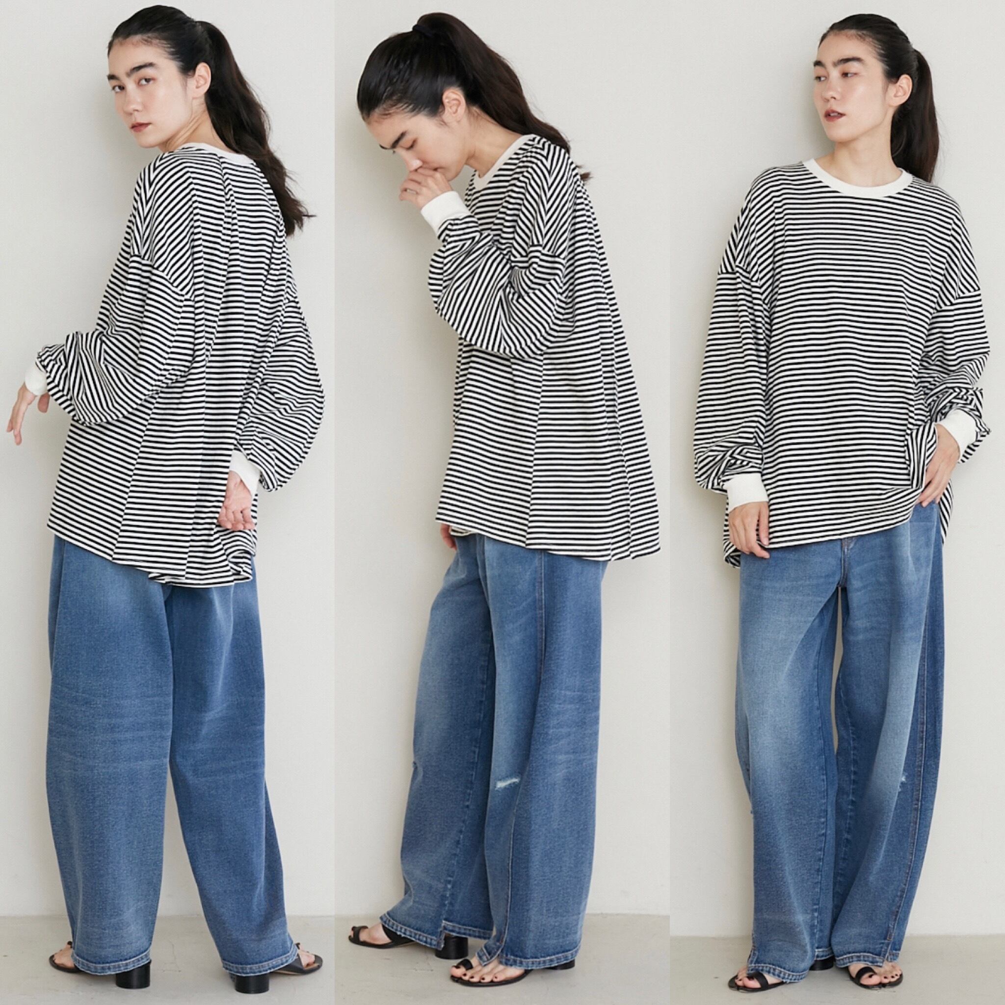 一見シンプルながらもデザインが効いたモードな印象で、季節の変わり目に重宝するロンTのバリエーションとしてぜひ揃えていただきたい1枚です。
