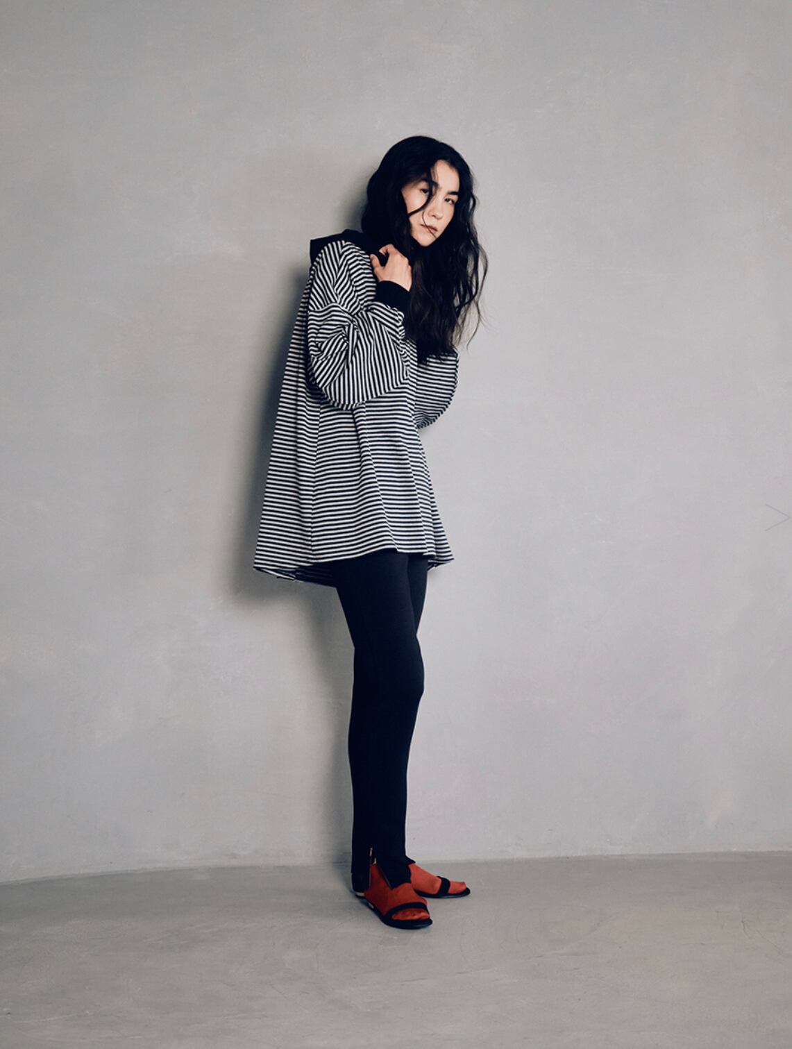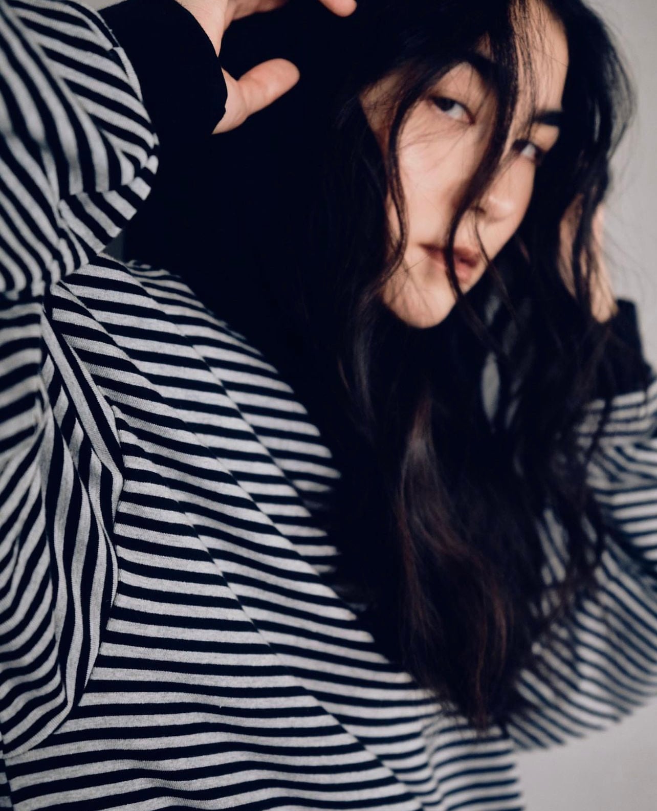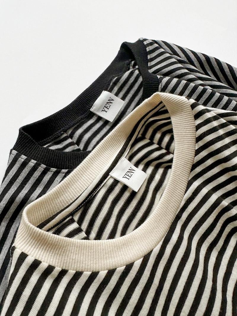 細ピッチのボーダーはカジュアルすぎず、ジャケットやカーディガンの下に着ていただくとトラッド感がプラスできて、秋のスタイリングにおすすめです。