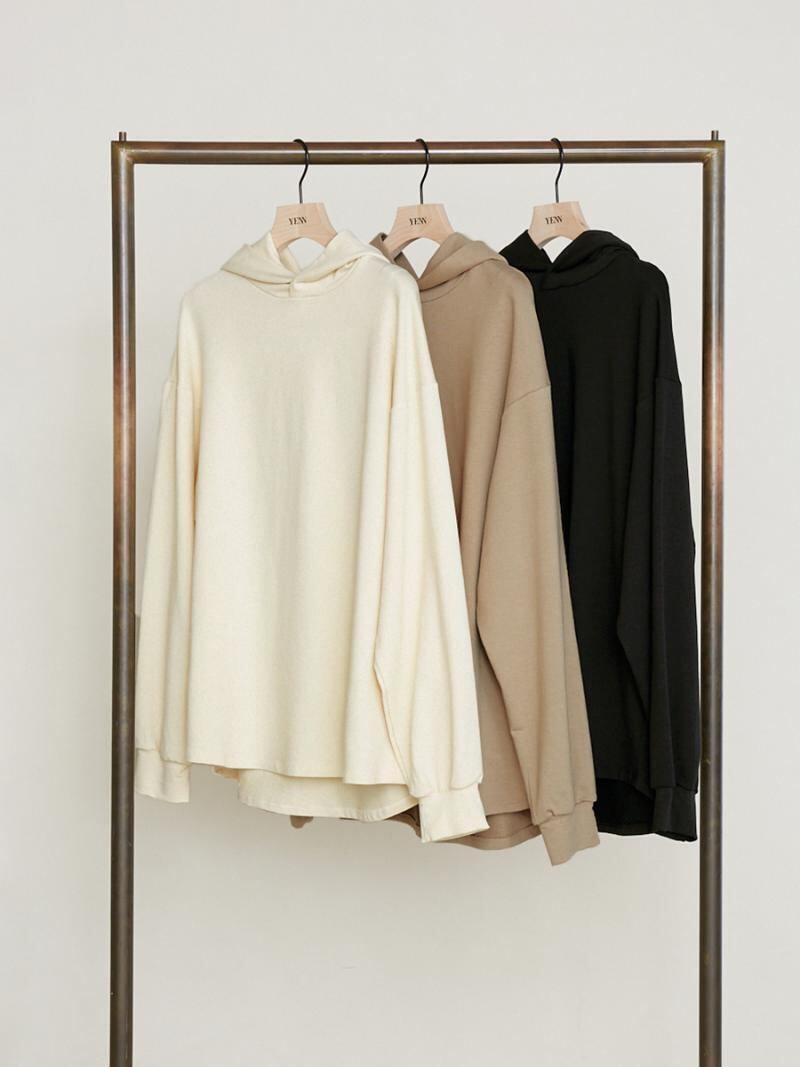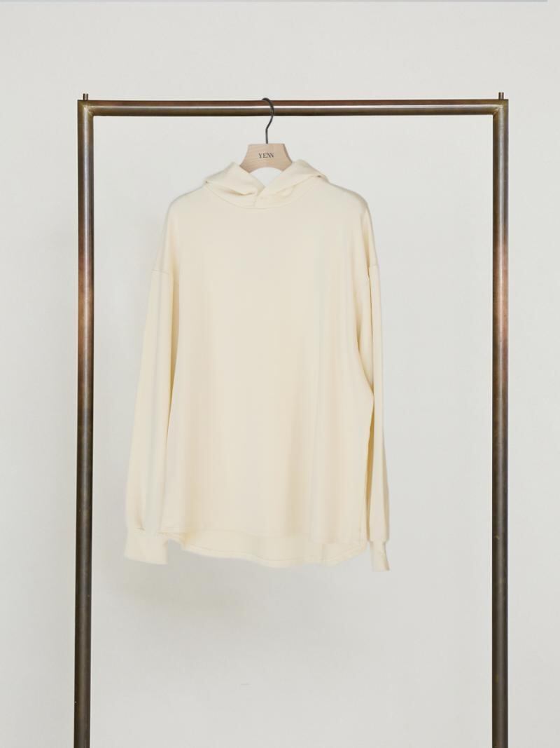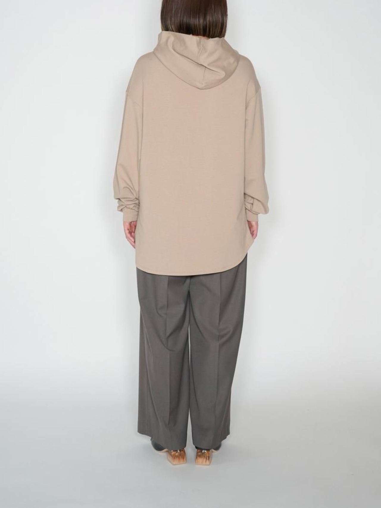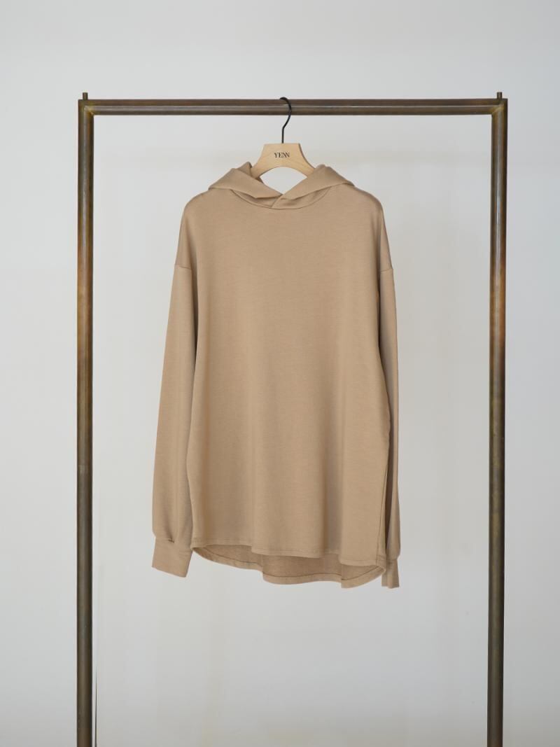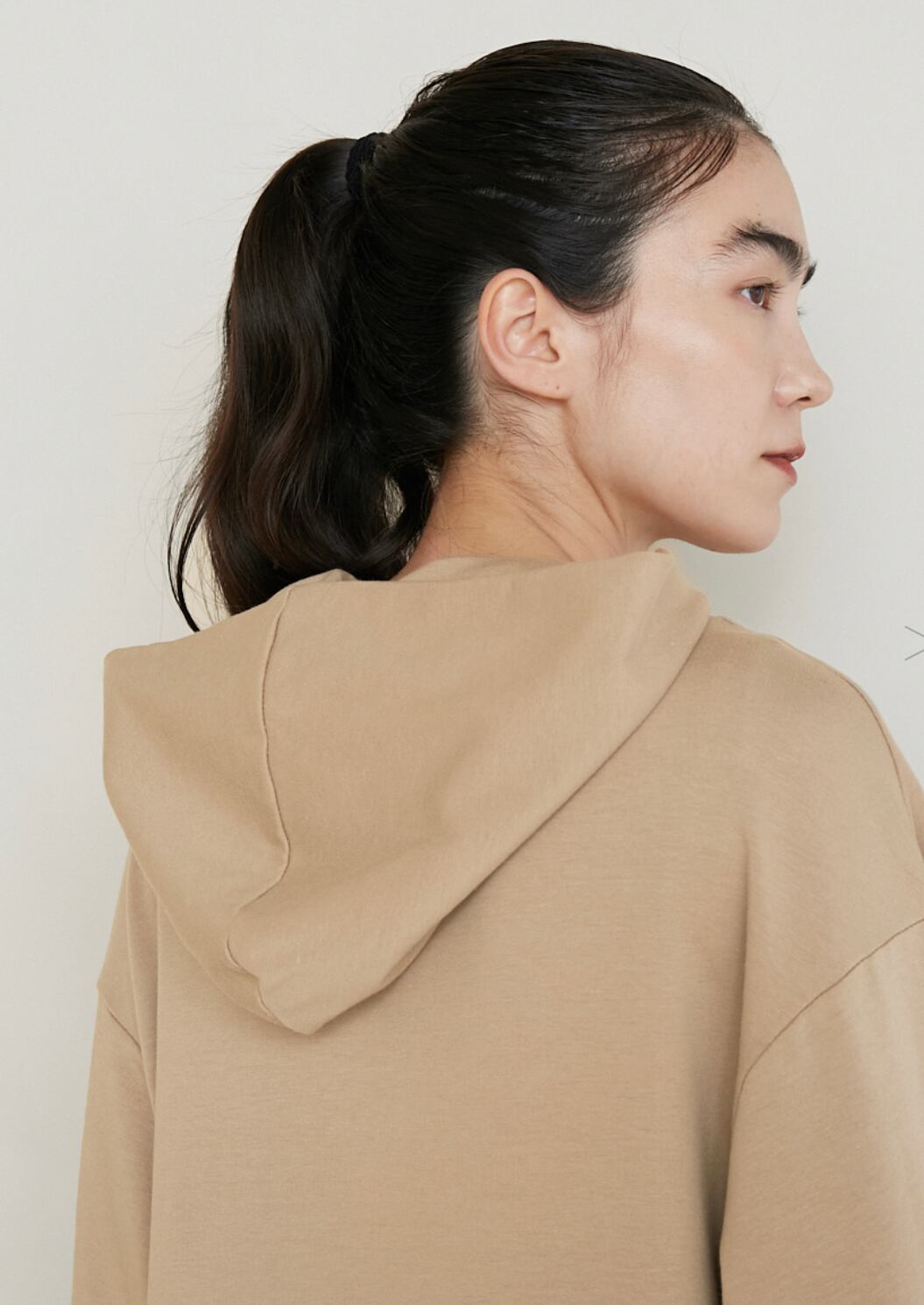 なめらかな肌触りのレーヨン混のミニ裏毛を使用したフードロンTです。 一般的なフーディーとは違い、柔らかくごわつかない素材でよりTシャツに近いデザインなので、1枚着として、またニットやスウェットの下にレイヤードさせたりと、着回しのきく1枚です。 裾がカーブしているので、レイヤードした時に裾から少し出すとこなれて見えておすすめです。フードはしっかりと2枚仕立てになっていて、前の合わせをステッチで固定していますので、きれいに顔周りに収まるように設計されています。 春先や秋口にも活躍する新しいタイプのロンTになります。