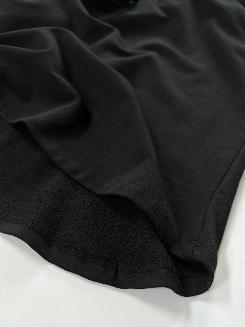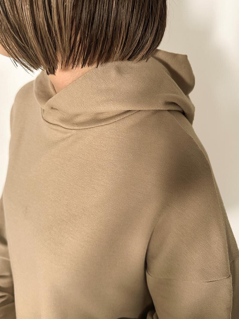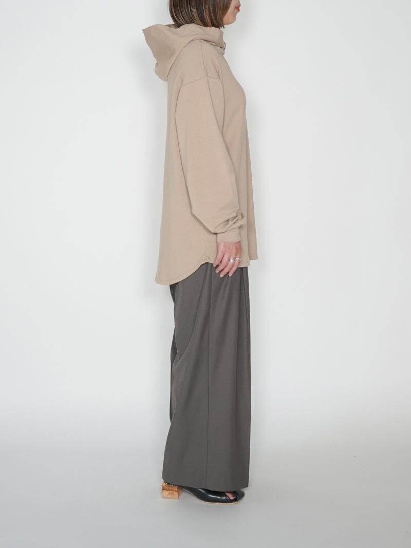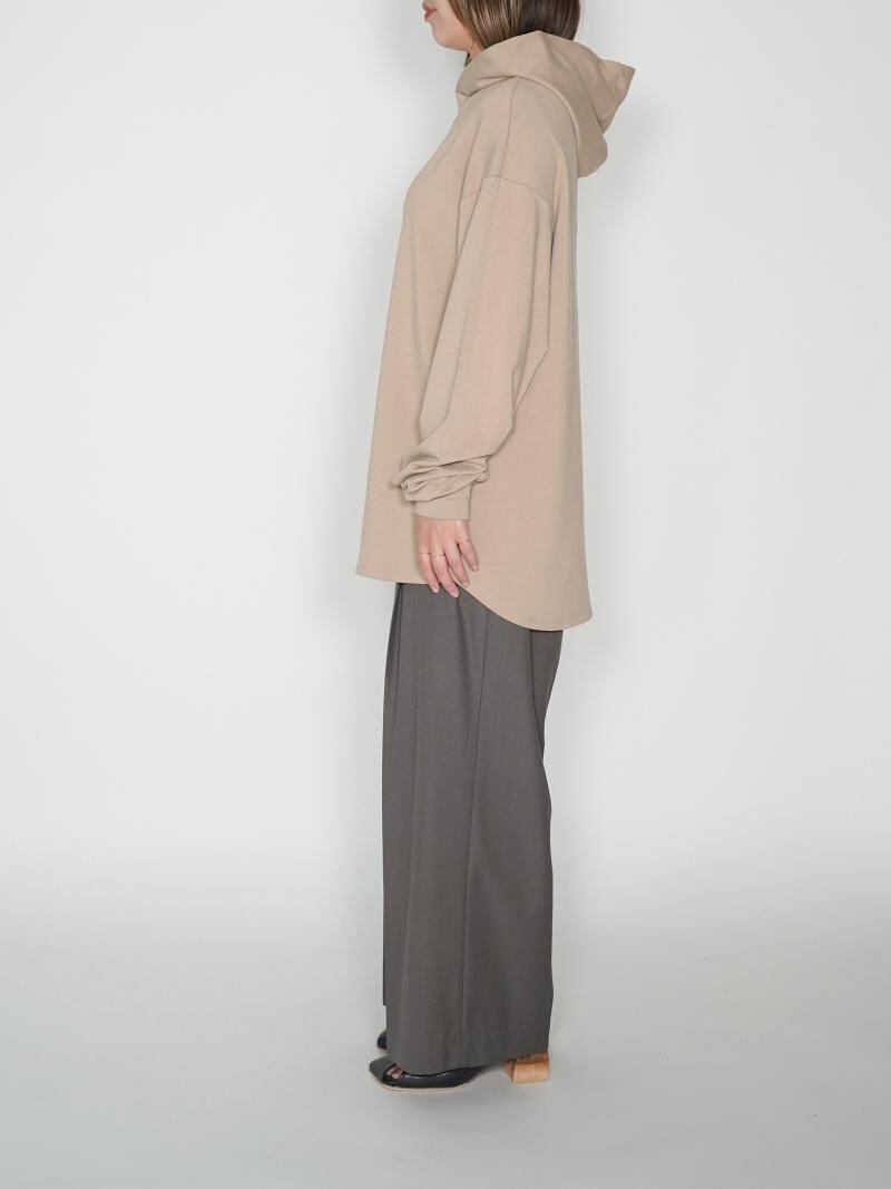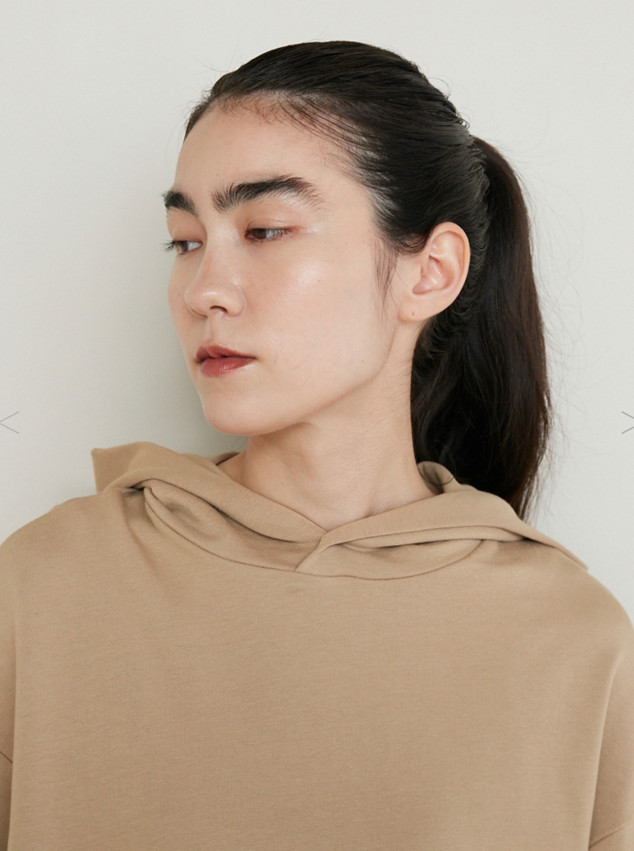 なめらかな肌触りのレーヨン混のミニ裏毛を使用したフードロンTです。 一般的なフーディーとは違い、柔らかくごわつかない素材でよりTシャツに近いデザインなので、1枚着として、またニットやスウェットの下にレイヤードさせたりと、着回しのきく1枚です。 裾がカーブしているので、レイヤードした時に裾から少し出すとこなれて見えておすすめです。フードはしっかりと2枚仕立てになっていて、前の合わせをステッチで固定していますので、きれいに顔周りに収まるように設計されています。 春先や秋口にも活躍する新しいタイプのロンTになります。