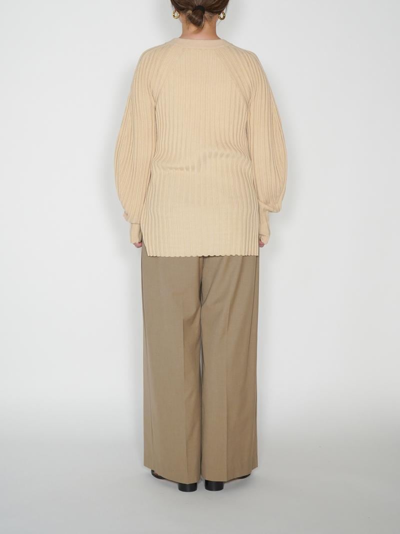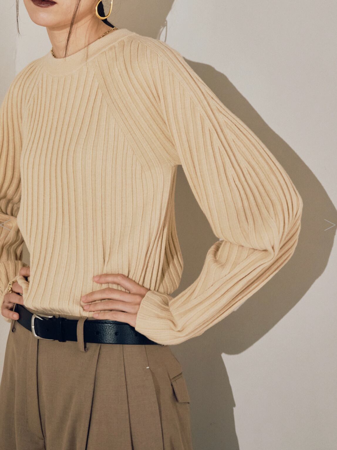 肘の位置で膨らむ袖のフォルムが特徴で、シンプルながらも存在感のある1枚です。なめらかな肌さわりの糸で毛玉もできにくい素材を使用しています。
