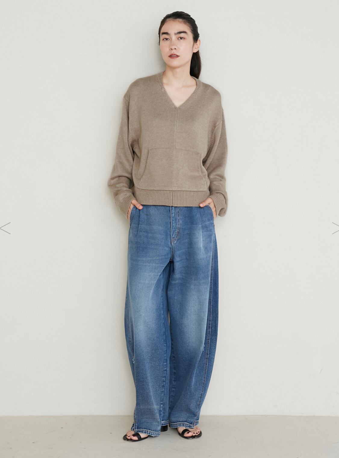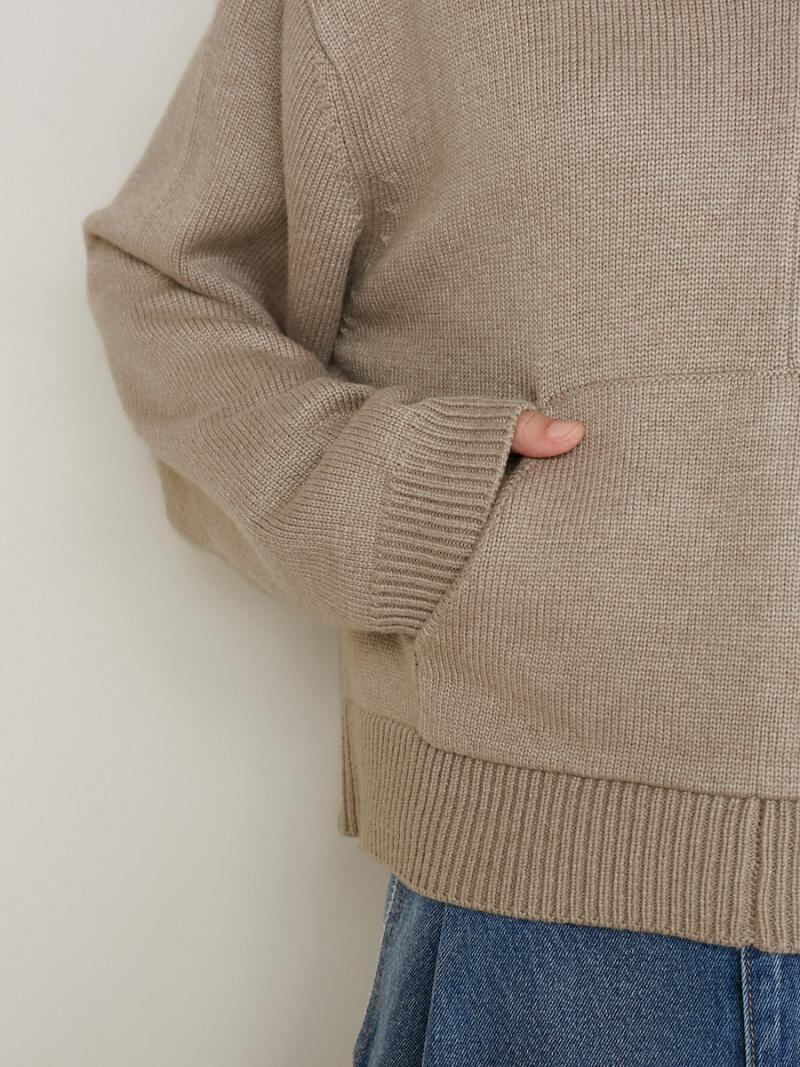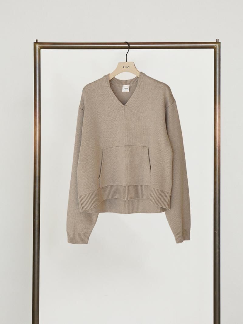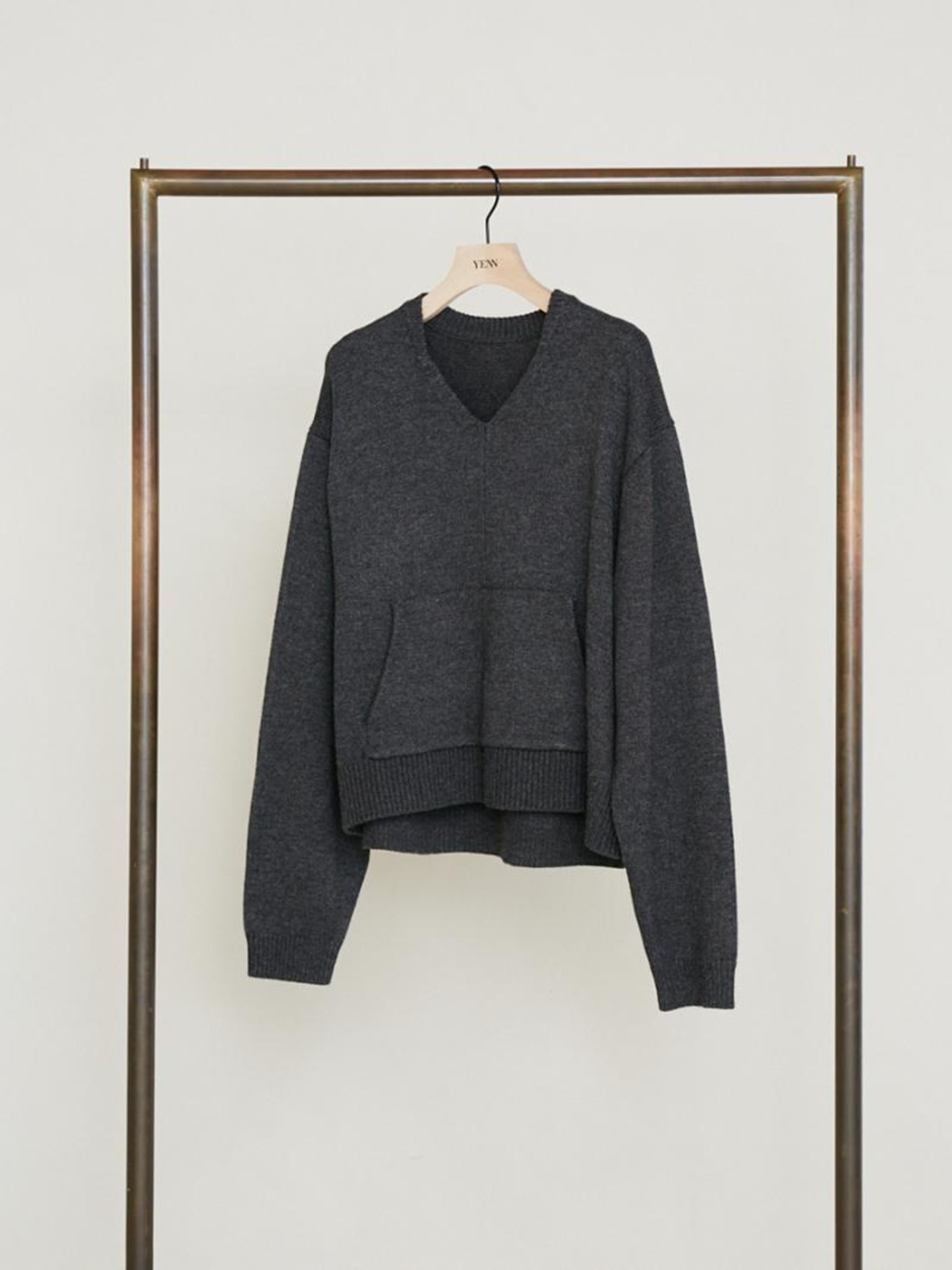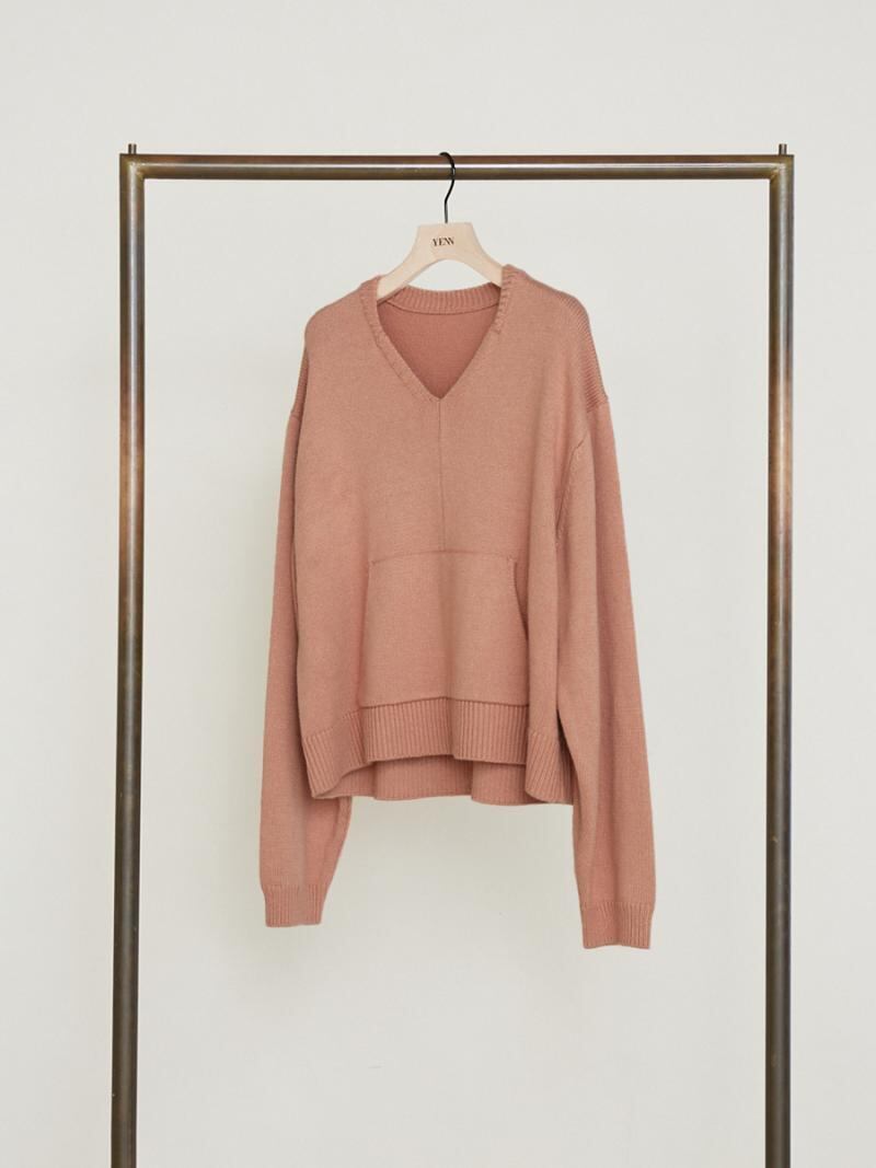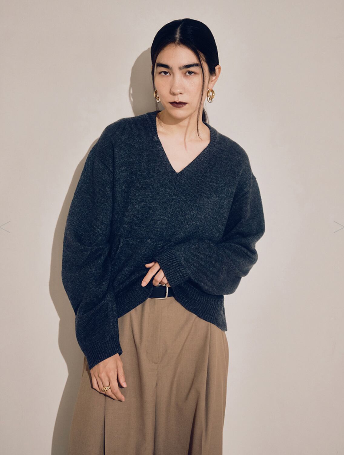 ブルゾンのようなリブ衿とカンガルーポケットがデザインポイントで、大人っぽいVネックのニットにあえてスポーティーの要素をちりばめて遊びをプラスしました。 少し短めの丈で、後ろは若干長くなっています。 衿のVあきは1枚でも着用できるくらいのあきを計算しました。シャツや、フードロンTをレイヤードさせるのもおすすめのスタイリングです。ボリュームのボトムにも合わせやすく、さりげないデザインのきいた大人ニットトップスになります。