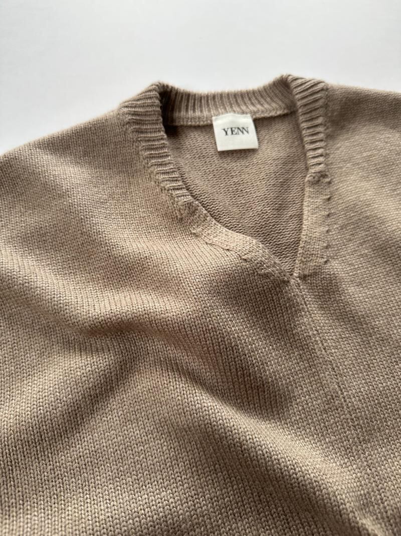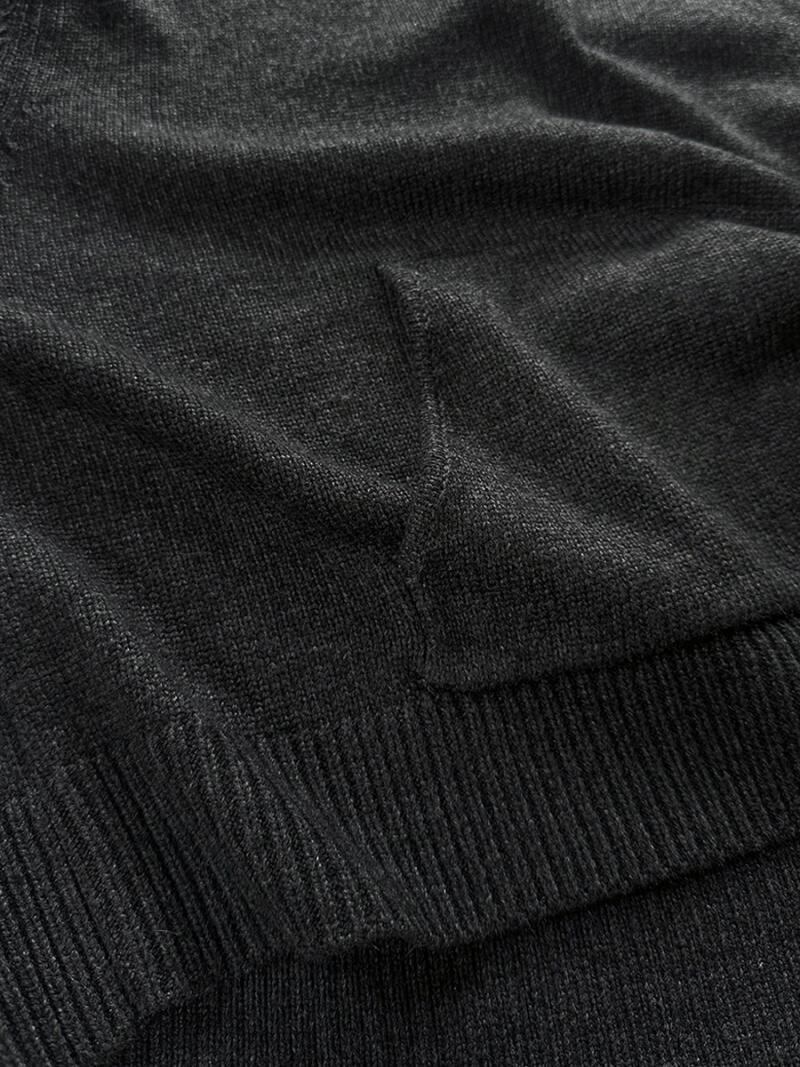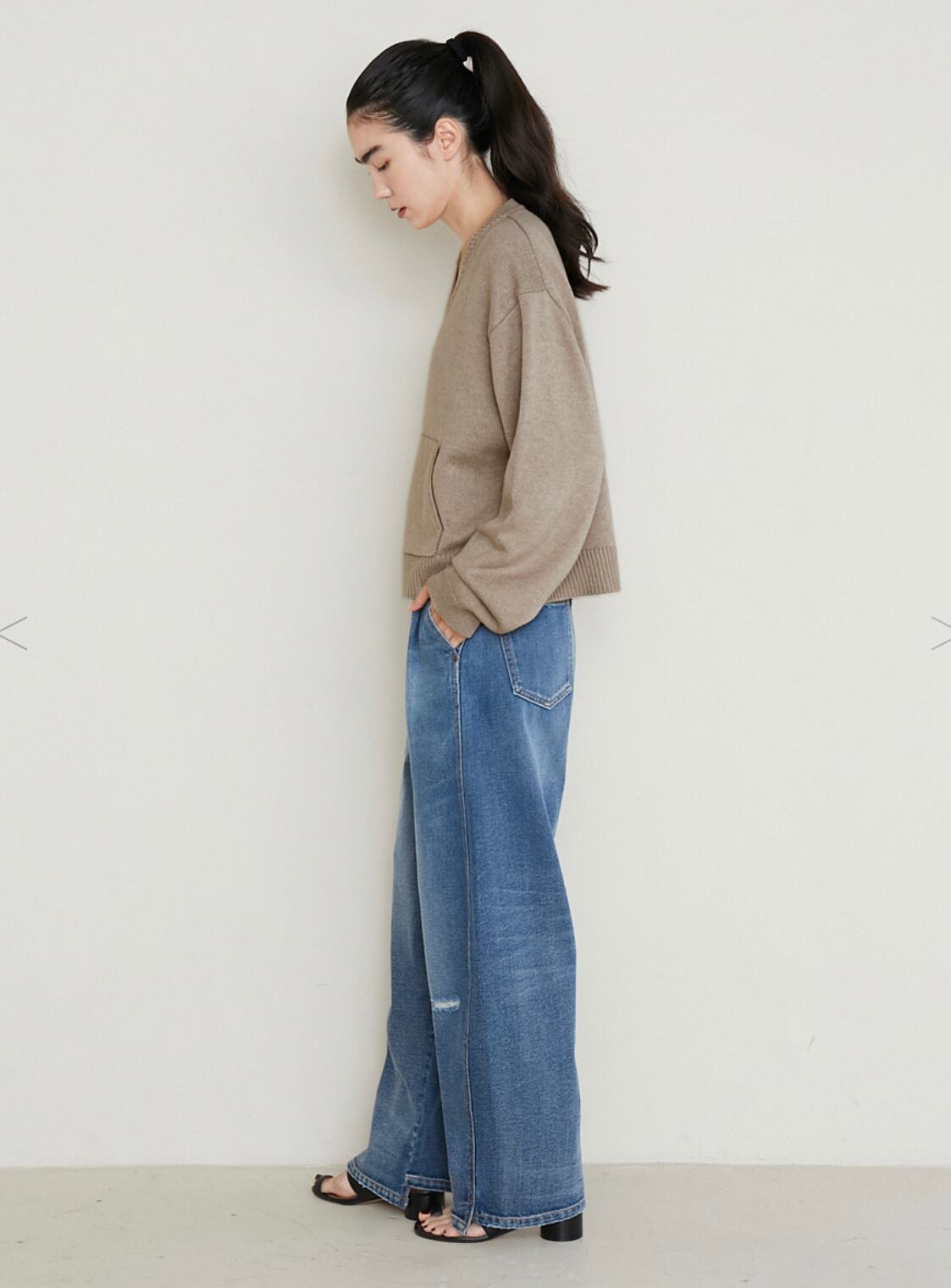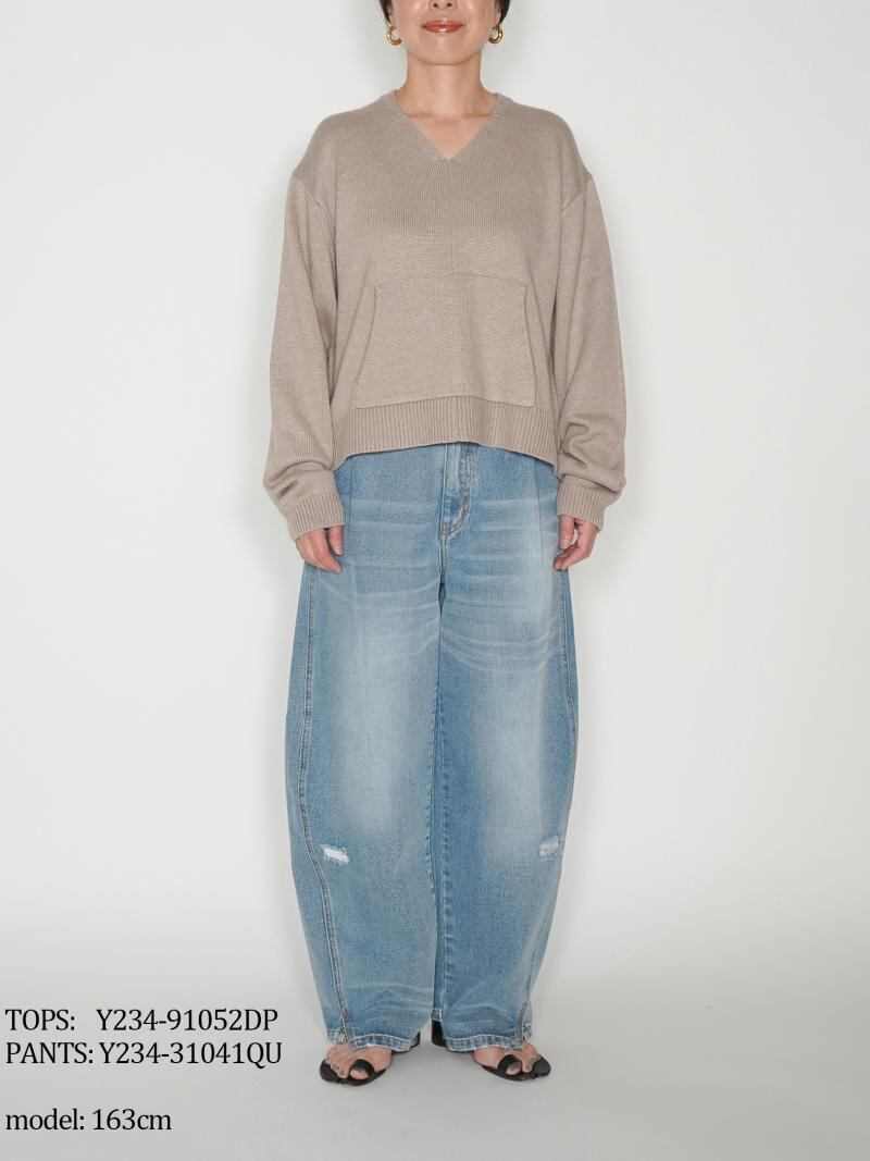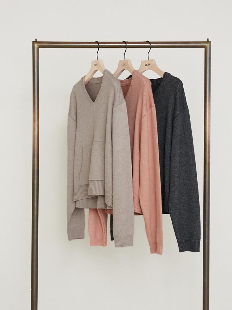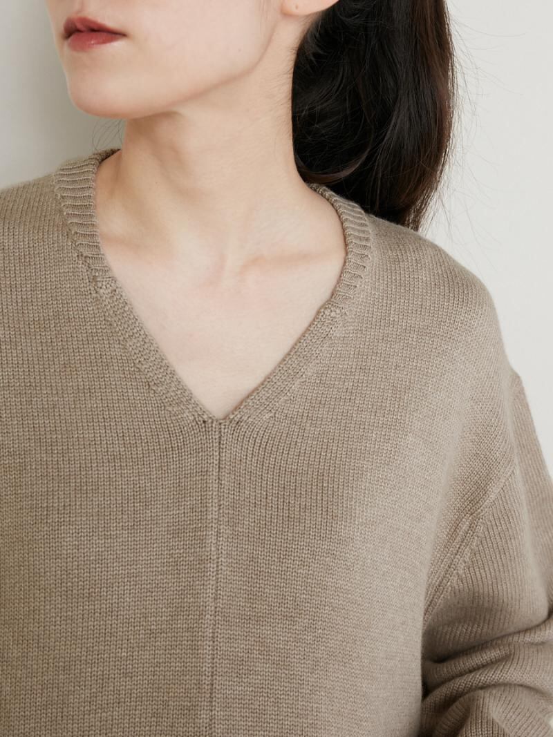 ブルゾンのようなリブ衿とカンガルーポケットがデザインポイントで、大人っぽいVネックのニットにあえてスポーティーの要素をちりばめて遊びをプラスしました。 少し短めの丈で、後ろは若干長くなっています。 衿のVあきは1枚でも着用できるくらいのあきを計算しました。シャツや、フードロンTをレイヤードさせるのもおすすめのスタイリングです。ボリュームのボトムにも合わせやすく、さりげないデザインのきいた大人ニットトップスになります。