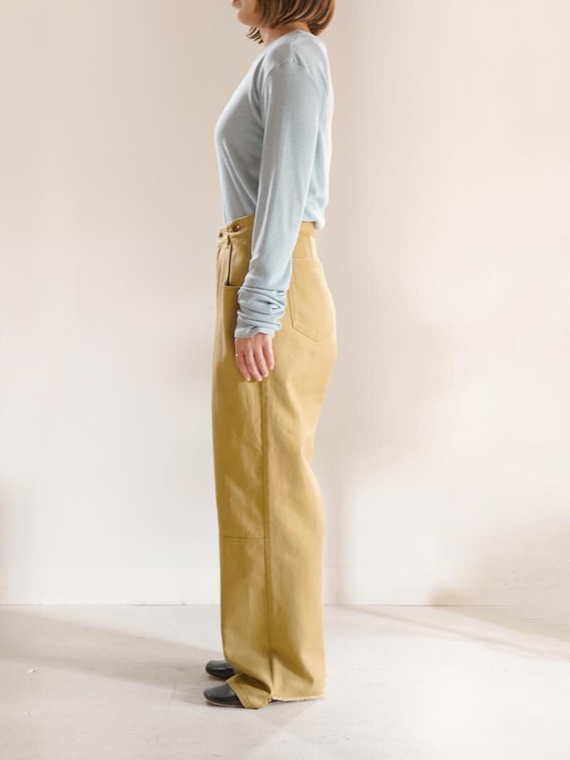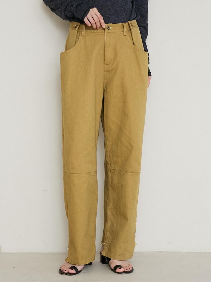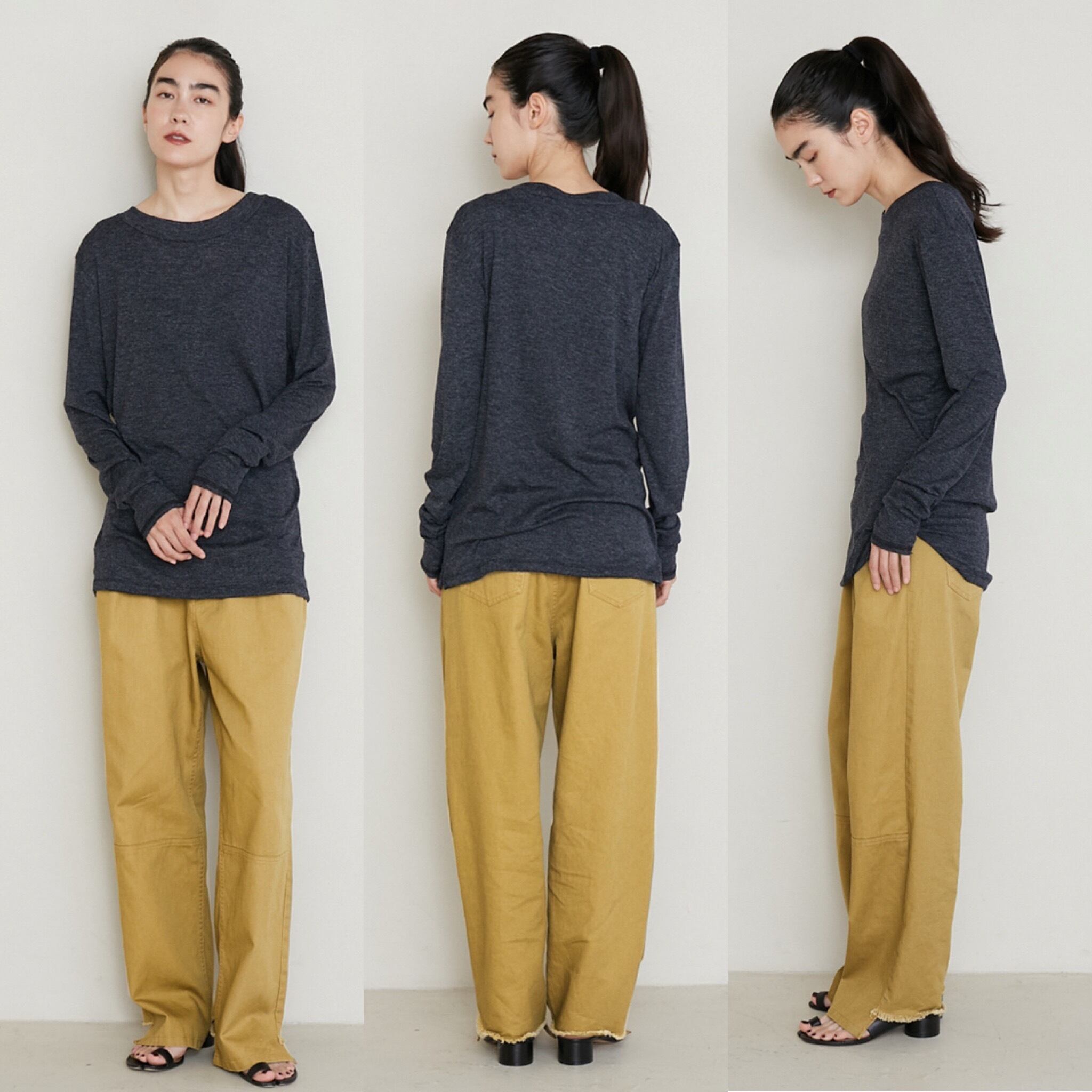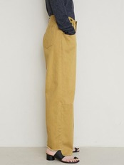 ウエストベルトをタックのように折り込んでボタンで止めるデザインになっていて、おなか周りにゆとりがありリラックスして履いていただけます。ウエスト設定はジャストウエストより少し下めになっていて、少し短めのトップスと合わせたり、タックインした時にウエストのデザインが生きるようになっています。