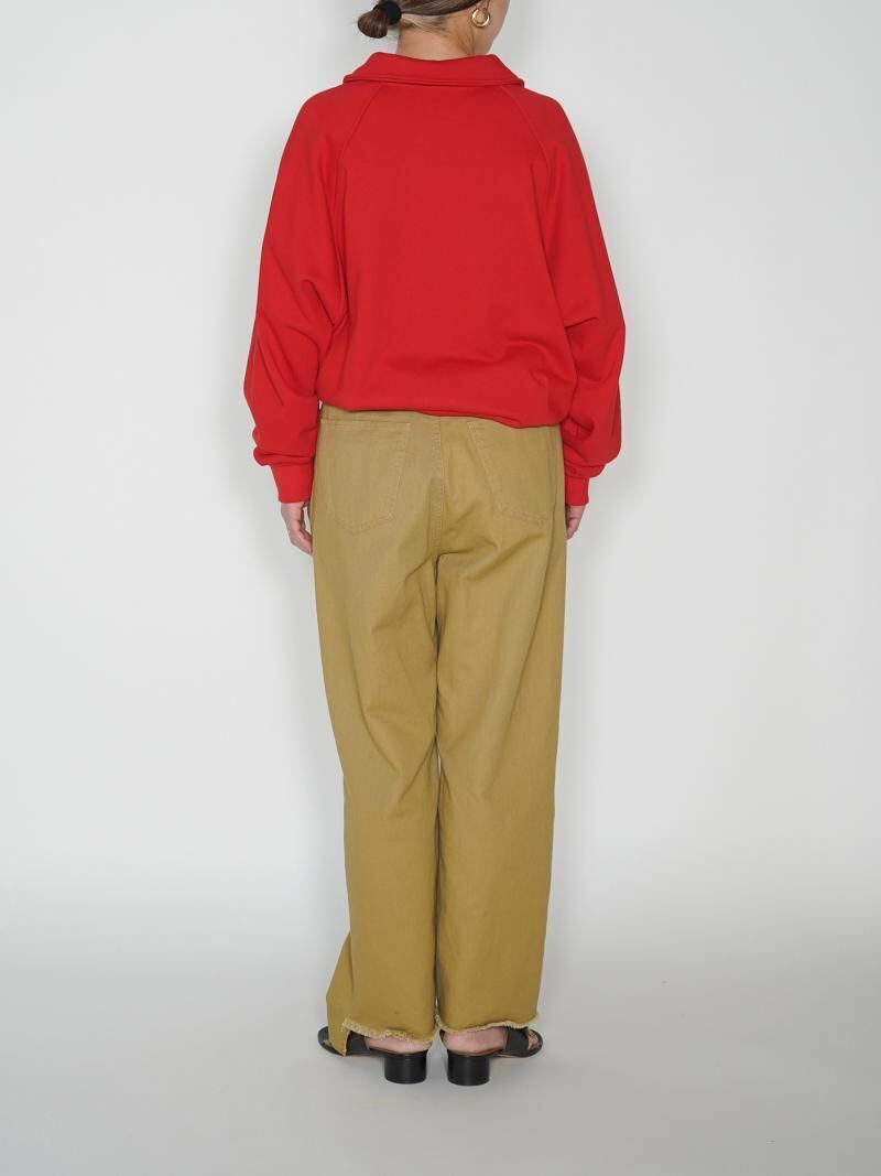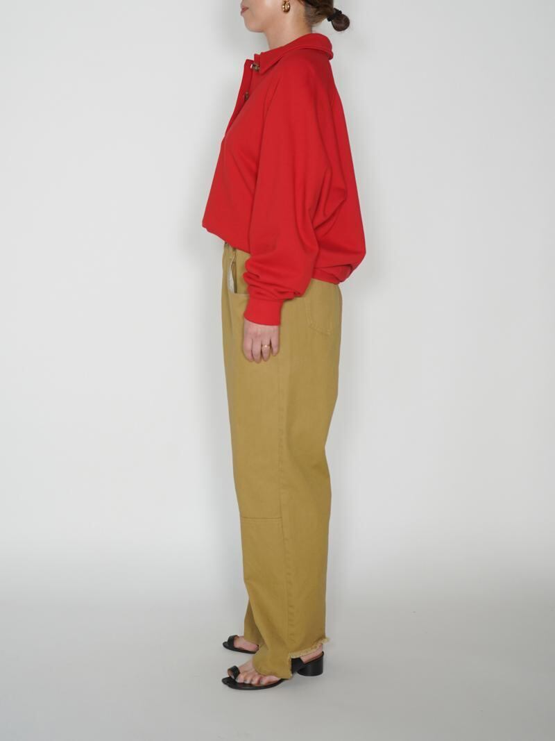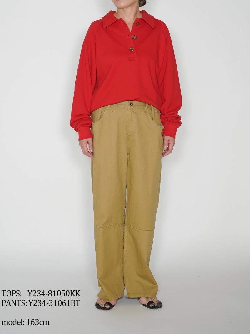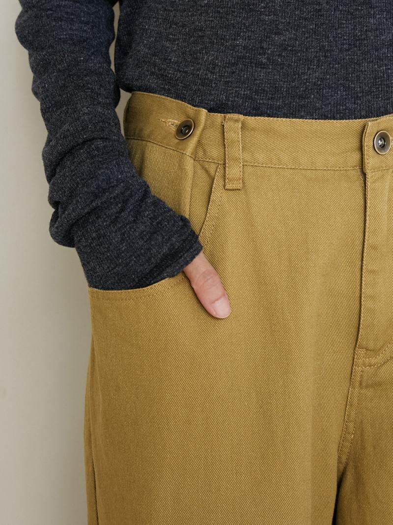 ウエストベルトをタックのように折り込んでボタンで止めるデザインになっていて、おなか周りにゆとりがありリラックスして履いていただけます。ウエスト設定はジャストウエストより少し下めになっていて、少し短めのトップスと合わせたり、タックインした時にウエストのデザインが生きるようになっています。