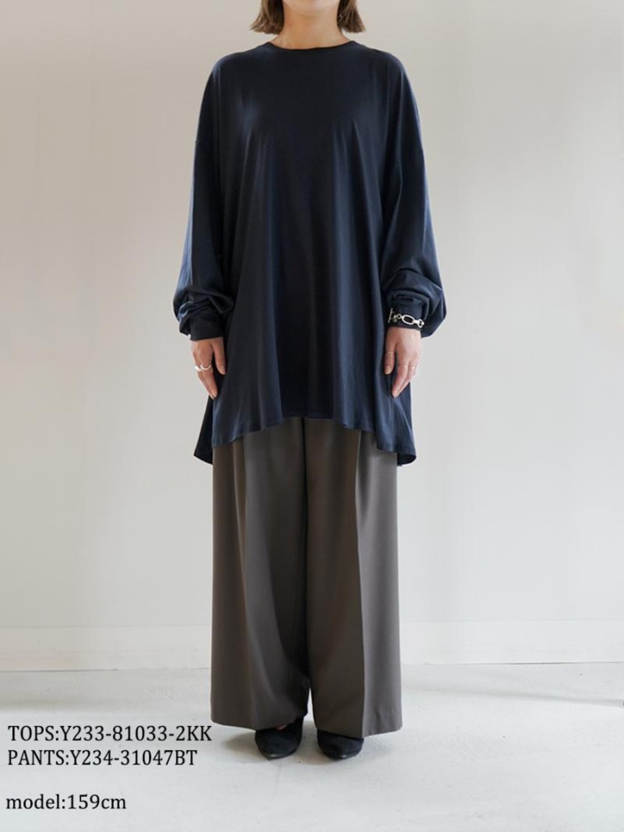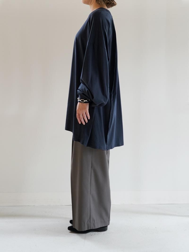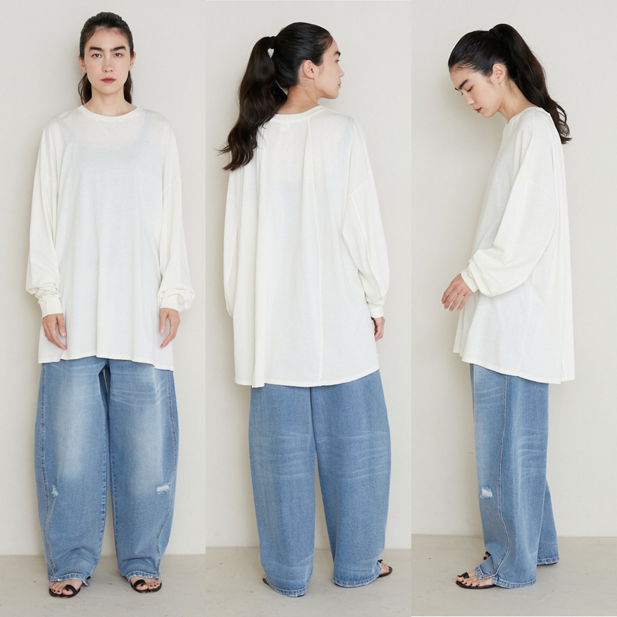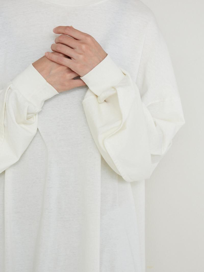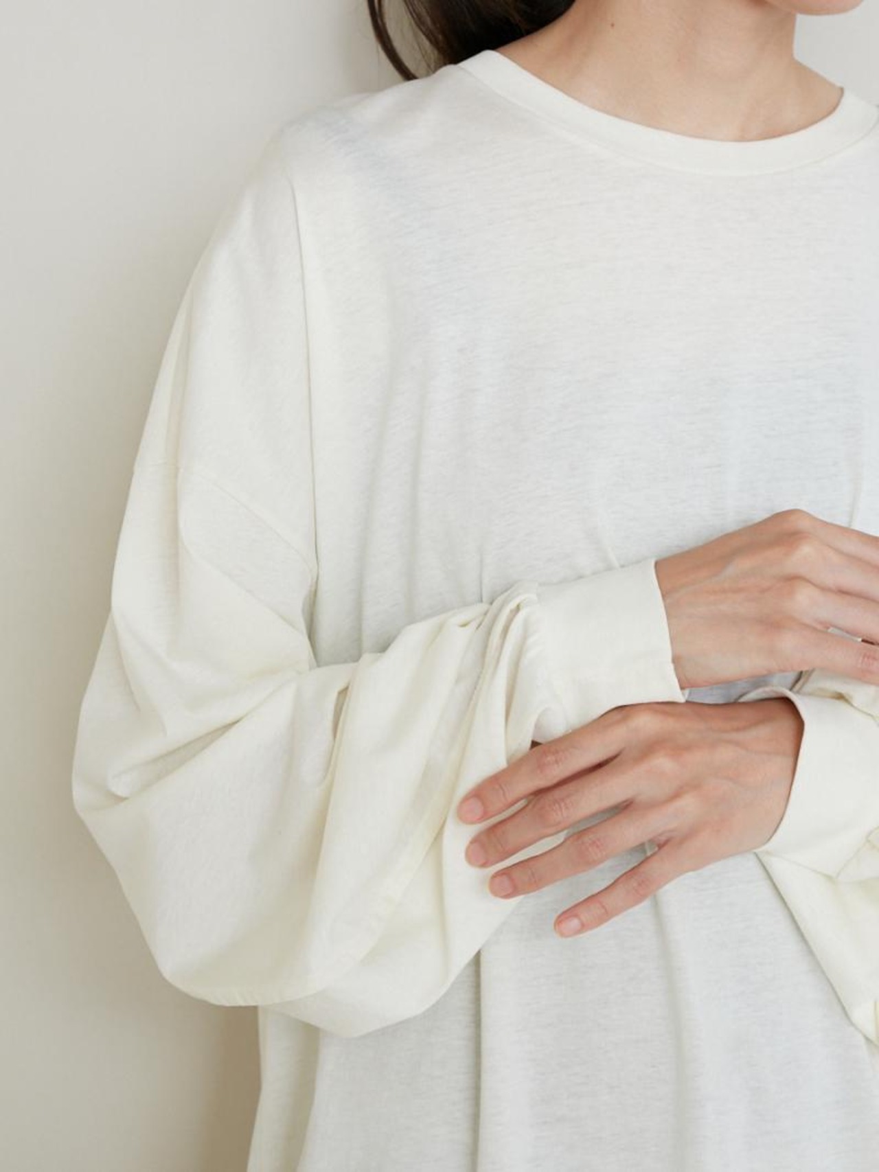 立体的なフォルムが特徴です。 一見シンプルながらもデザインが効いたモードな印象で、季節の変わり目に重宝するロンTのバリエーションとしてぜひ揃えていただきたい1枚です。