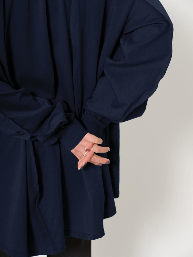 ゆるっとしたオーバーサイズのシルエットで、後袖と後身頃に入れた切り替えを大きくカーブさせることで作る