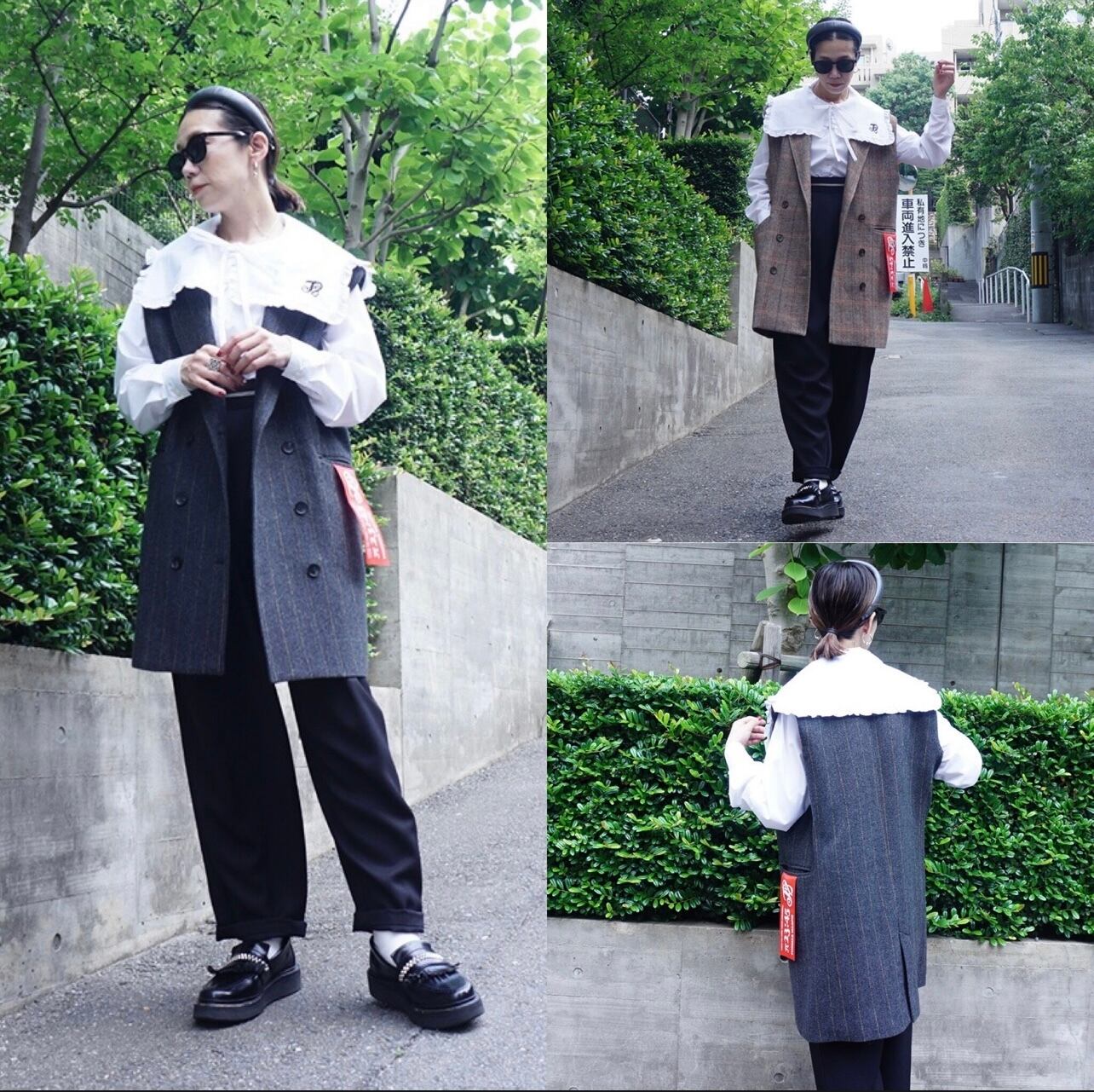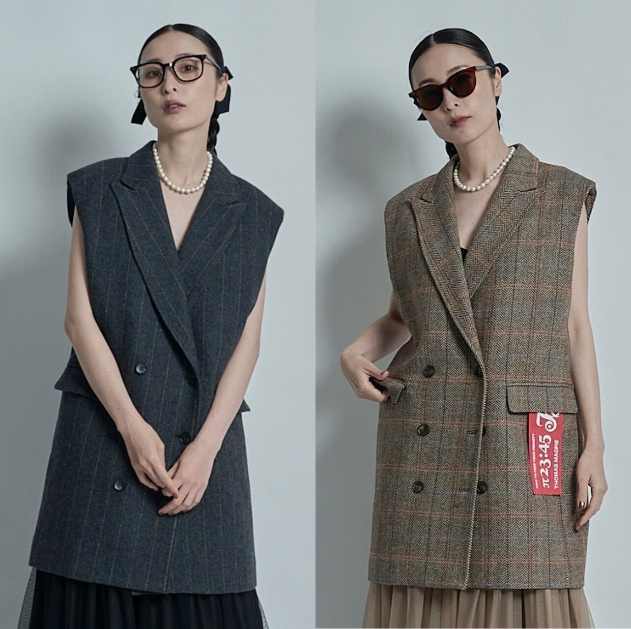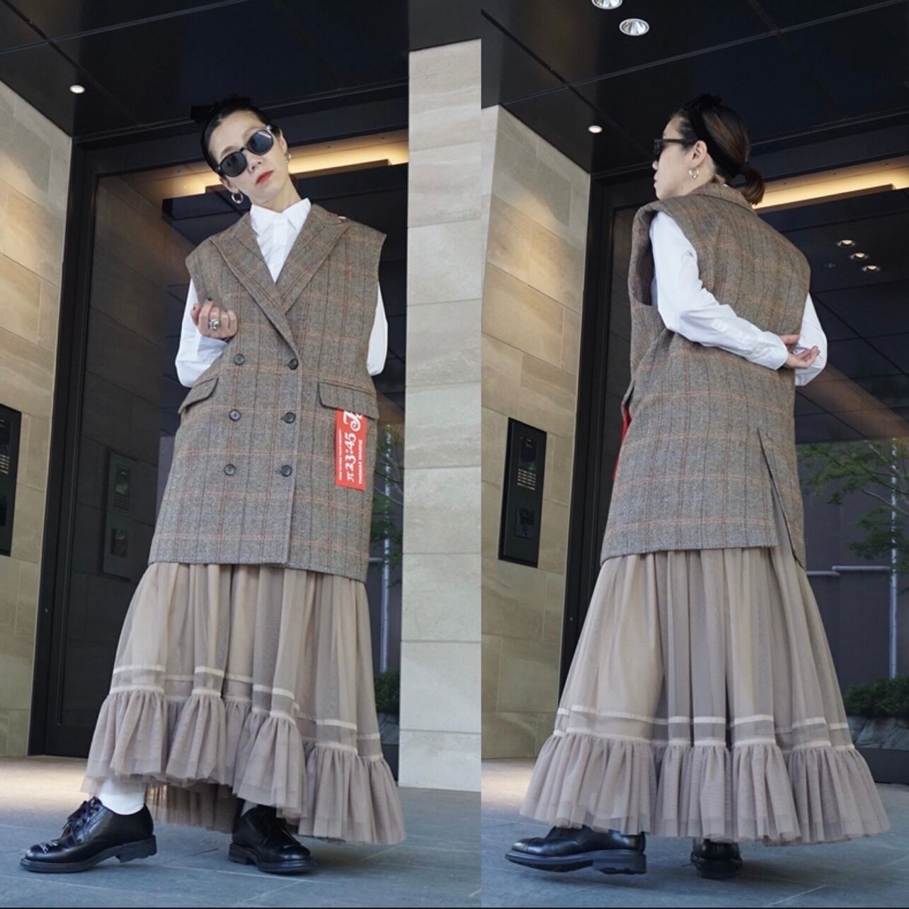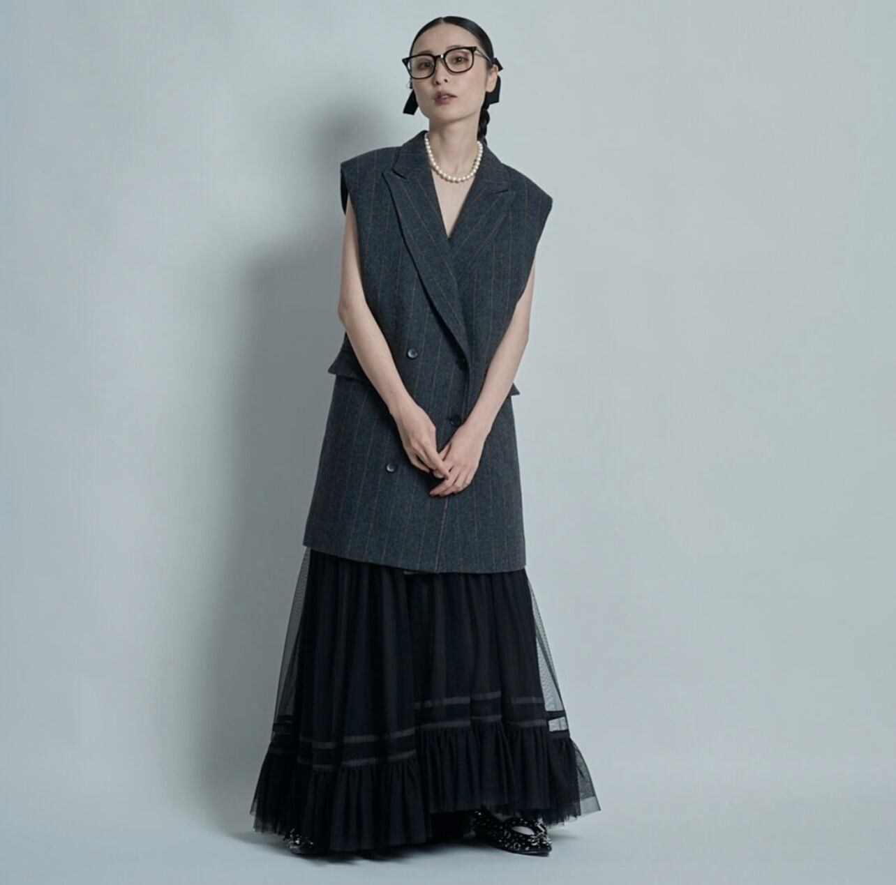 肩パッドの入った形の綺麗なテーラードベストです。以前は夏用にリネンで作っていました。非常に人気だったため、素材をパワーアップさせてウール素材で作ってみました。今回はヘリンボーンのハリのあるウールを使用しました。ウールなので、今まで販売しているものとは一味違う雰囲気です。今回、新作ではない為、予約商品からは除外していましたが、スタッフから、非常に好評であった為、また私もセーラーカラーのフリルシャツとの相性が抜群に良かったので急遽予約を取ることを決めました。少し物足りないなと感じてしまうコーディネートの日にサラッと羽織るだけで、一気にカッコ良さが増す便利なアイテムです。素材の良さと縫製の良さが感じられる出来上がりに、とても嬉しく感じました。オーバーサイズのコートの中に着ることも可能です。肩パッドが入っていますが、あまり気にせずに着てもらえるかなと思います。肩パッドはとてもかっこいい丸みとふくらみになっています。また前身頃は全面、接着芯でハリを出しています。後ろ身頃の上部にも接着芯を貼っていて、カチッとしていて、とても上質感が感じられるベストに仕上がりました。同時に予約受付中のアンゴラコートの中に着ることも可能です。その上質で静かな佇まいに惚れ込み、今回一番のお気に入りアイテムとなりました。インパクトがあるわけではありませんが、秋口に必ず役立ってくれると思います。夏の予約販売ということで、ノースリーブでも着てみましたが、またそれもカッコよくて、チャレンジしてみたいなと思いました。お勧めはチャコールグレーです。ブラックのチュールバレリーナスカートに合わせて欲しいと思います。ベージュにはカフェのチュールバレリーナスカートがしっくりときました。私は現在悩み中で、どちらも捨て難いので、じっくり考えたいと思っています。使いやすいのはチャコールグレーのヘリンボーン。着丈の長さが絶妙で、構えずにサラリと着れるのも良いなと思います。またポケットからオリジナルのマグパイの赤いテープが出ているのがポイントです。中に収めることも可能です。お好みでない方は縫製を外してご使用ください。このベストは今回一押しのアイテムです。ぜひ秋冬のコーディネートに加えてください。大人っぽくて、上質感があり、少しだけいつものコーディネートの格が上がると思います。