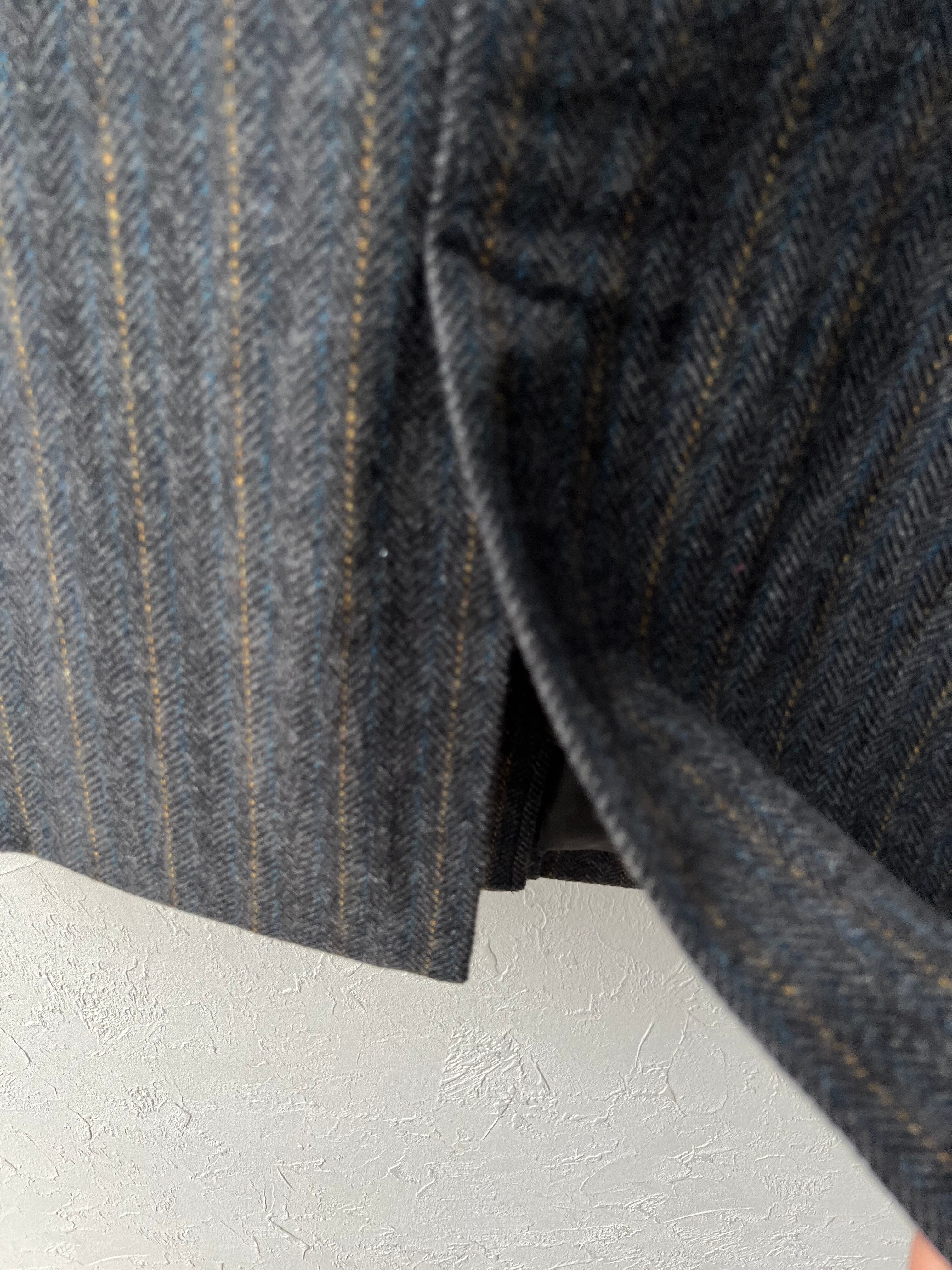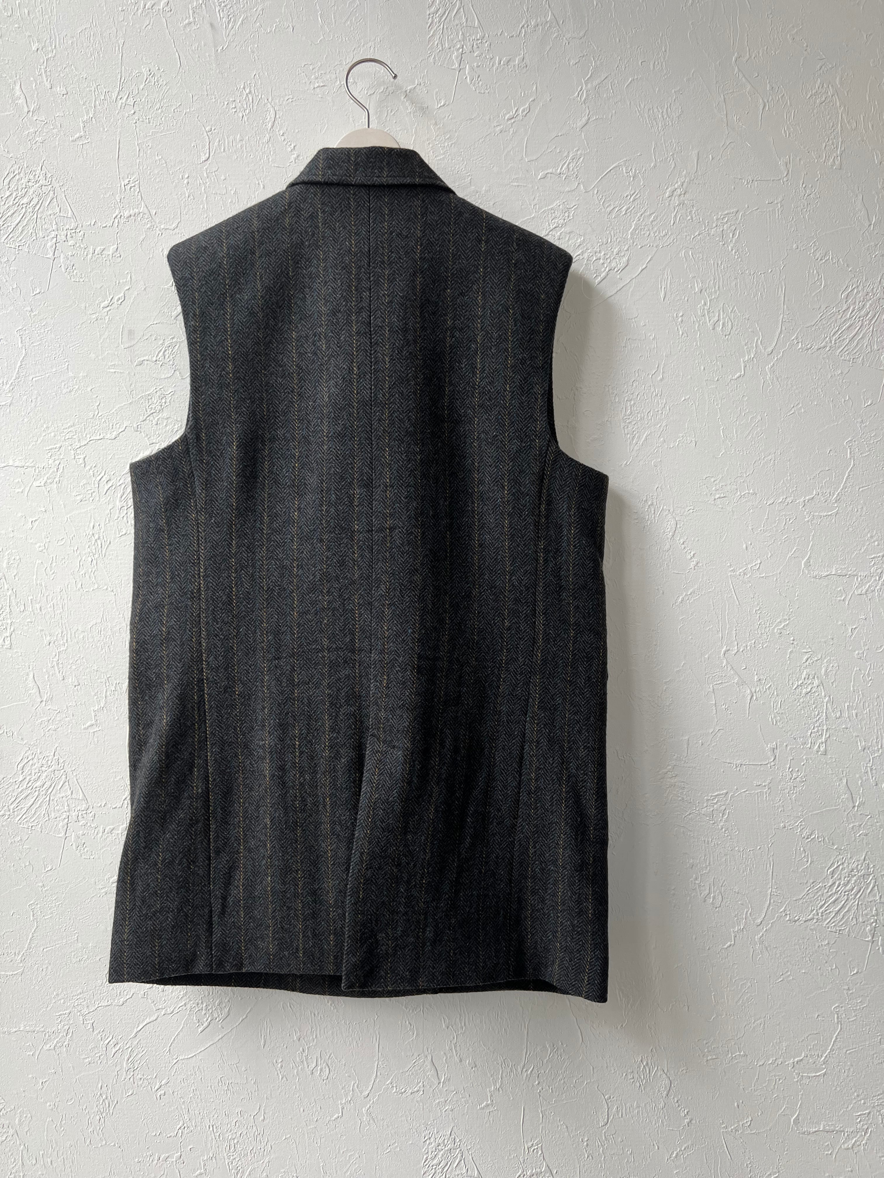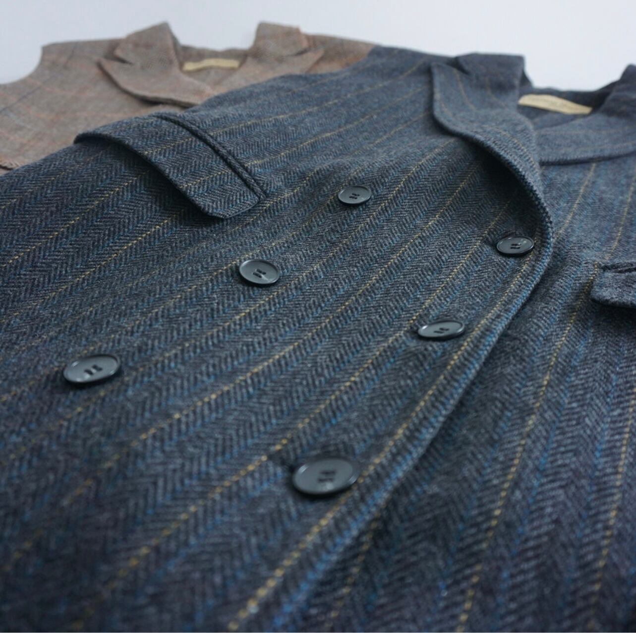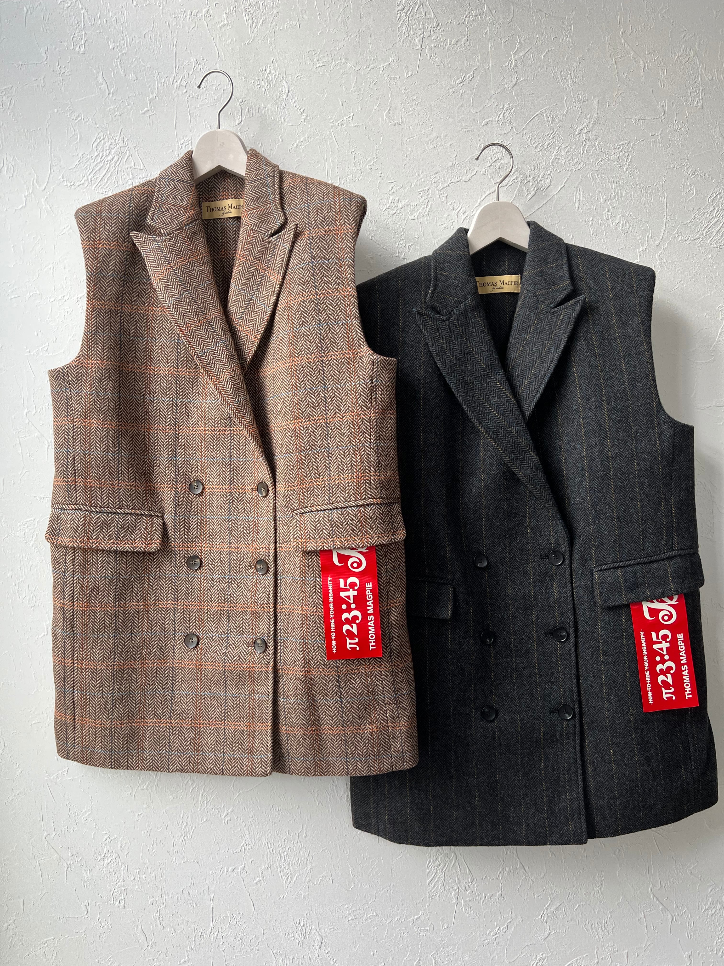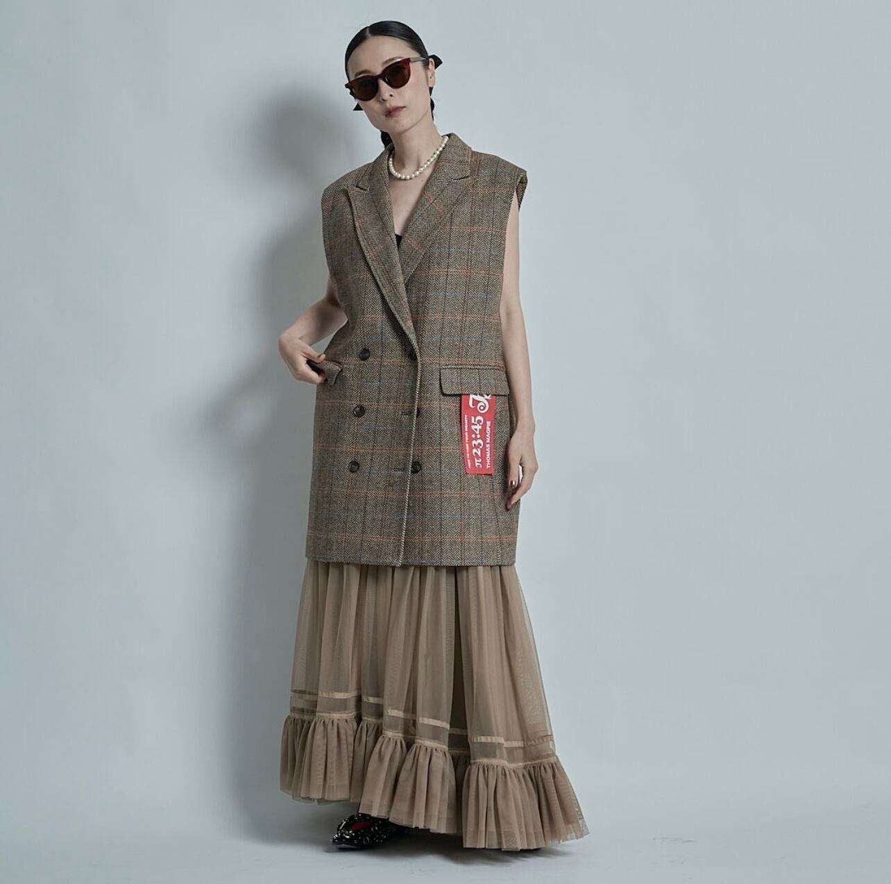 肩パッドの入った形の綺麗なテーラードベストです。以前は夏用にリネンで作っていました。非常に人気だったため、素材をパワーアップさせてウール素材で作ってみました。今回はヘリンボーンのハリのあるウールを使用しました。ウールなので、今まで販売しているものとは一味違う雰囲気です。今回、新作ではない為、予約商品からは除外していましたが、スタッフから、非常に好評であった為、また私もセーラーカラーのフリルシャツとの相性が抜群に良かったので急遽予約を取ることを決めました。少し物足りないなと感じてしまうコーディネートの日にサラッと羽織るだけで、一気にカッコ良さが増す便利なアイテムです。素材の良さと縫製の良さが感じられる出来上がりに、とても嬉しく感じました。オーバーサイズのコートの中に着ることも可能です。肩パッドが入っていますが、あまり気にせずに着てもらえるかなと思います。肩パッドはとてもかっこいい丸みとふくらみになっています。また前身頃は全面、接着芯でハリを出しています。後ろ身頃の上部にも接着芯を貼っていて、カチッとしていて、とても上質感が感じられるベストに仕上がりました。同時に予約受付中のアンゴラコートの中に着ることも可能です。その上質で静かな佇まいに惚れ込み、今回一番のお気に入りアイテムとなりました。インパクトがあるわけではありませんが、秋口に必ず役立ってくれると思います。夏の予約販売ということで、ノースリーブでも着てみましたが、またそれもカッコよくて、チャレンジしてみたいなと思いました。お勧めはチャコールグレーです。ブラックのチュールバレリーナスカートに合わせて欲しいと思います。ベージュにはカフェのチュールバレリーナスカートがしっくりときました。私は現在悩み中で、どちらも捨て難いので、じっくり考えたいと思っています。使いやすいのはチャコールグレーのヘリンボーン。着丈の長さが絶妙で、構えずにサラリと着れるのも良いなと思います。またポケットからオリジナルのマグパイの赤いテープが出ているのがポイントです。中に収めることも可能です。お好みでない方は縫製を外してご使用ください。このベストは今回一押しのアイテムです。ぜひ秋冬のコーディネートに加えてください。大人っぽくて、上質感があり、少しだけいつものコーディネートの格が上がると思います。