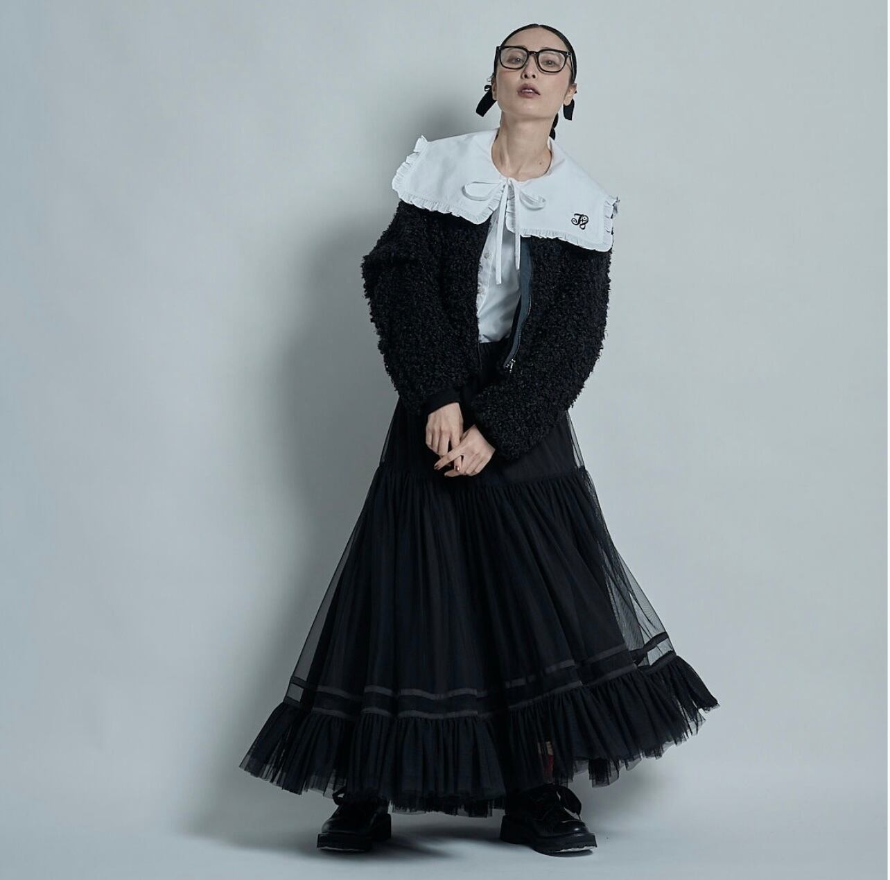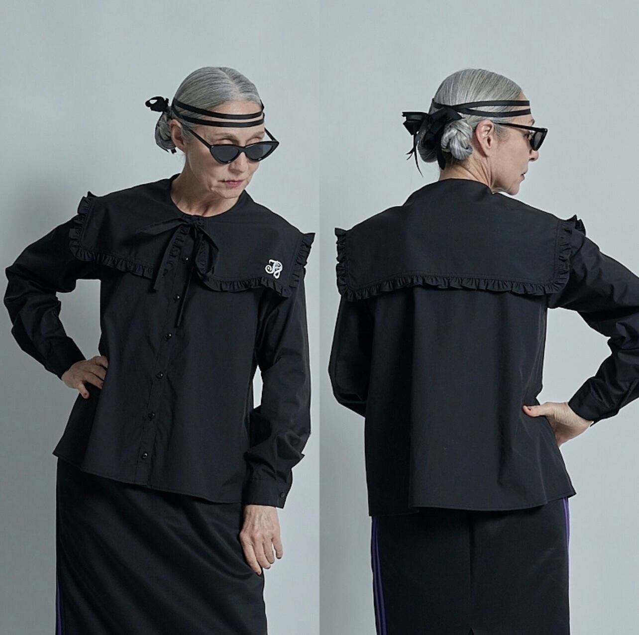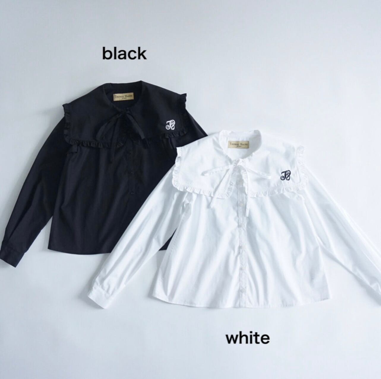 今回はセーラーカラーのフリルシャツを作りました。シワになりにくいサラリとした素材です。襟にインパクトがあり、後ろ姿はセーラーカラーになっています。最近の気になるアイテムとしてバックがセーラーになっている襟ががありコーディネートのポイントにしてみたくて作りました。またマグパイ初のロゴマークを作って、襟に刺繍を入れてみました。THOMAS MAGPIEの名前の中に入っているTPを変形して作っています。また胸元にはリボンをつけています。結んでも良いし、そのまま垂らして着用もOKです。一枚あると色々なアウターやニット、スウェットなどの重ね着のエッセンスになるかなと思います。今回は、ホワイト、ブラックを予約商品にピックアップしました。お勧めは子供っぽくならないブラックがお勧めです。個人的にはホワイトが80年代風でかわいいかなと思っています。ホワイトは重ね着をしないと少し子供っぽい雰囲気になりますので重ね着をお勧めしたいと思います。特に同時に予約商品として出している、テーラードベストとの組み合わせが気に入っています。もしちょっと変わった雰囲気で重ね着を楽しんでみたいという方にお勧めします。私は今回はブラックとホワイトを両方とも購入したいなと検討しています。