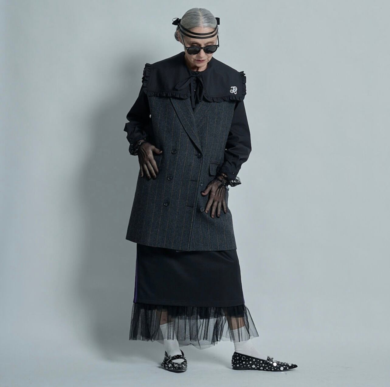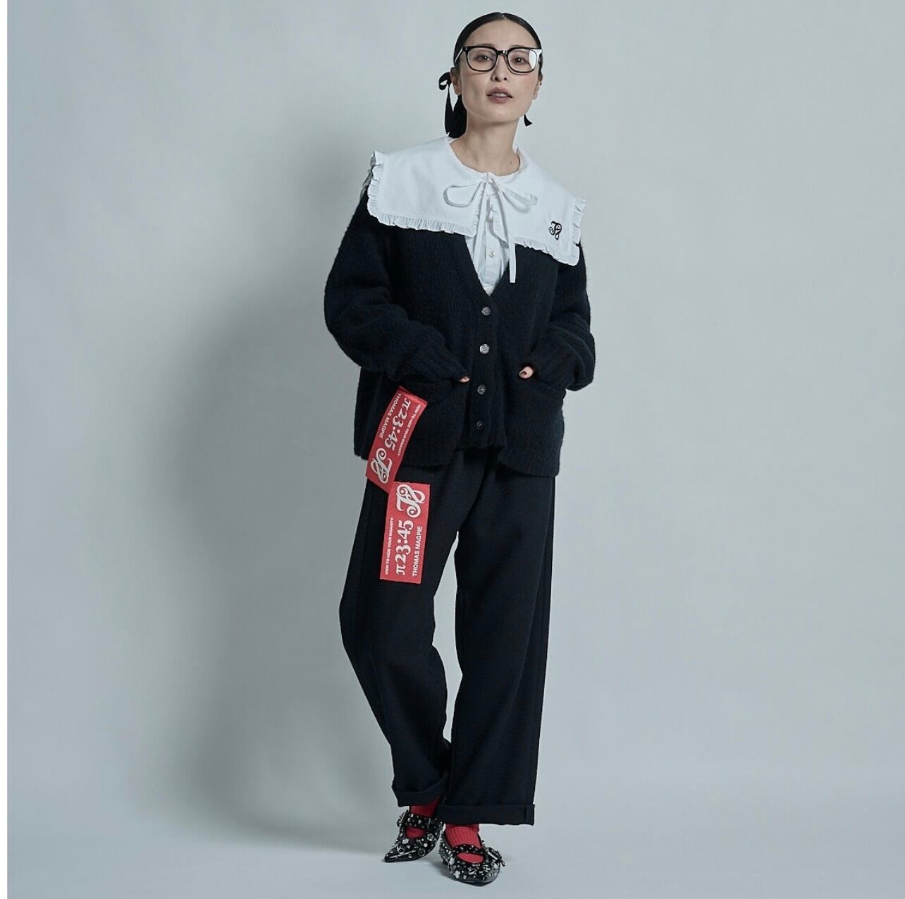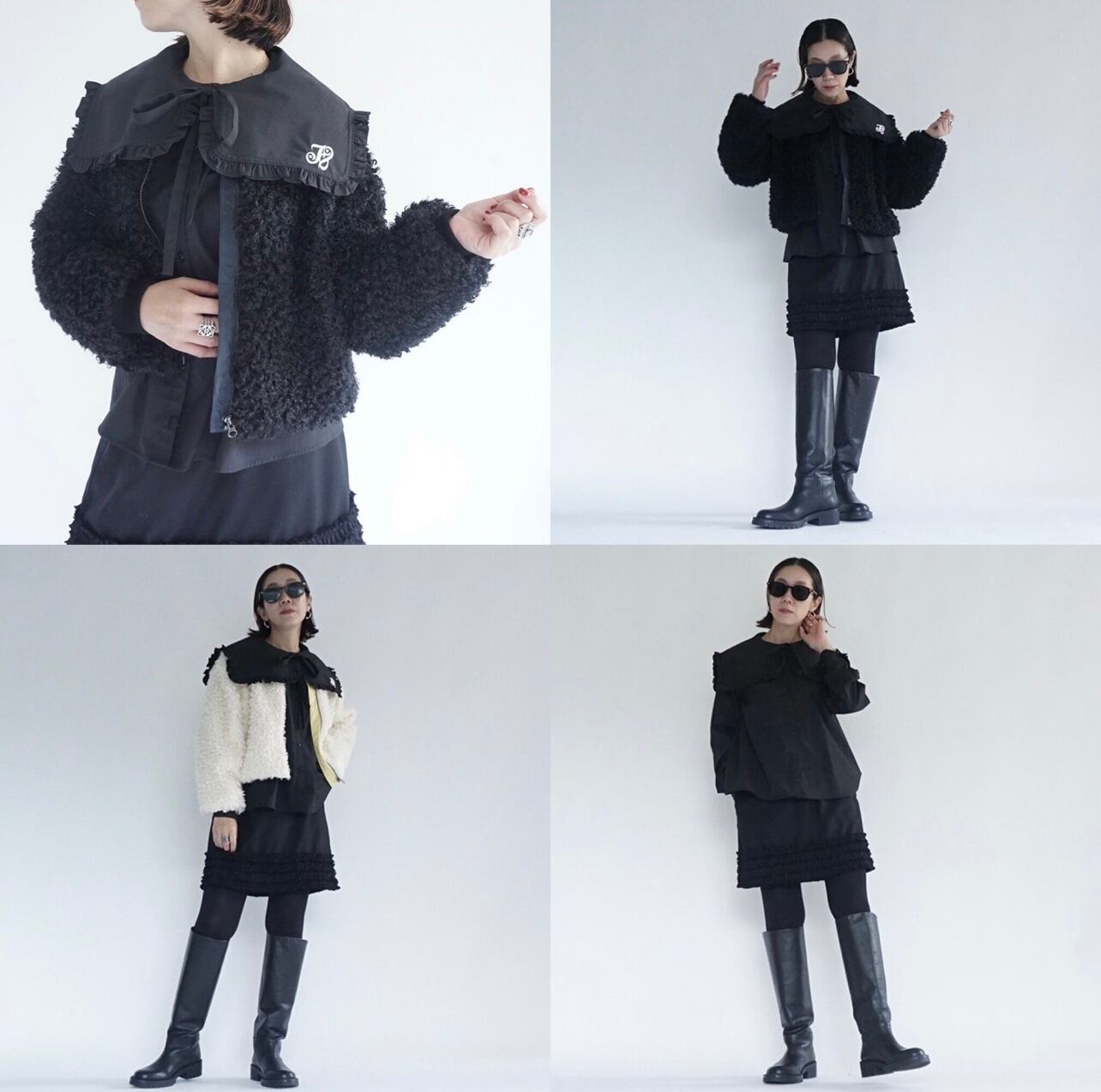 今回はセーラーカラーのフリルシャツを作りました。シワになりにくいサラリとした素材です。襟にインパクトがあり、後ろ姿はセーラーカラーになっています。最近の気になるアイテムとしてバックがセーラーになっている襟ががありコーディネートのポイントにしてみたくて作りました。またマグパイ初のロゴマークを作って、襟に刺繍を入れてみました。THOMAS MAGPIEの名前の中に入っているTPを変形して作っています。また胸元にはリボンをつけています。結んでも良いし、そのまま垂らして着用もOKです。一枚あると色々なアウターやニット、スウェットなどの重ね着のエッセンスになるかなと思います。今回は、ホワイト、ブラックを予約商品にピックアップしました。お勧めは子供っぽくならないブラックがお勧めです。個人的にはホワイトが80年代風でかわいいかなと思っています。ホワイトは重ね着をしないと少し子供っぽい雰囲気になりますので重ね着をお勧めしたいと思います。特に同時に予約商品として出している、テーラードベストとの組み合わせが気に入っています。もしちょっと変わった雰囲気で重ね着を楽しんでみたいという方にお勧めします。私は今回はブラックとホワイトを両方とも購入したいなと検討しています。