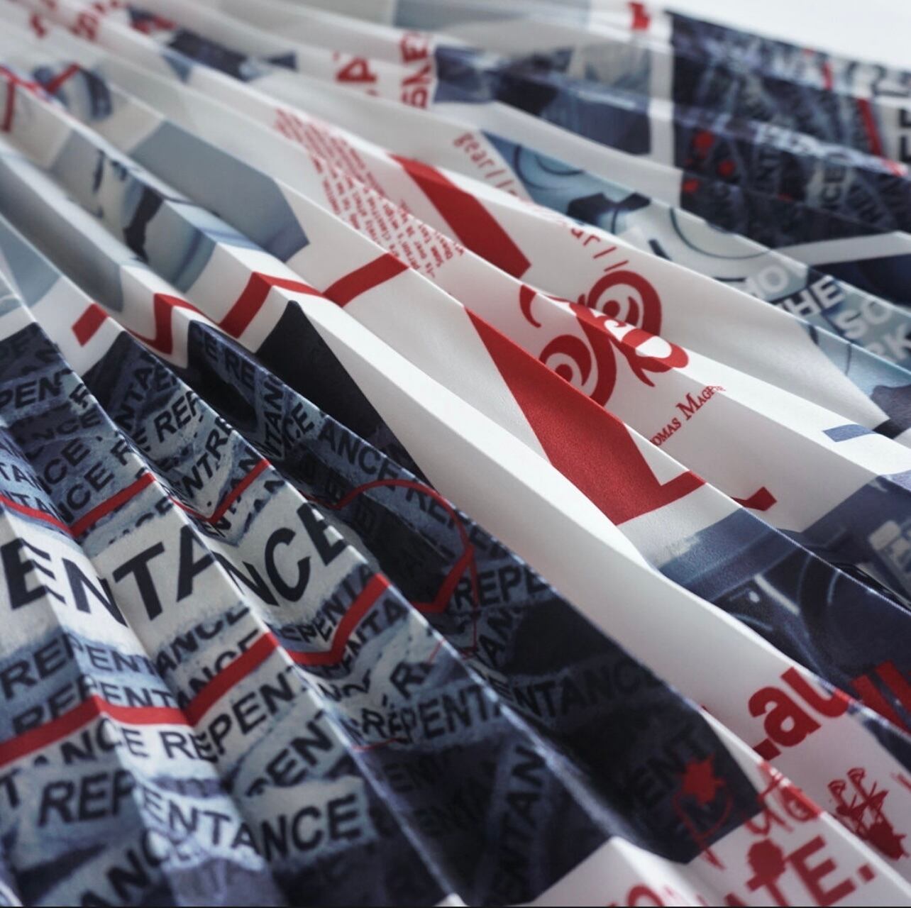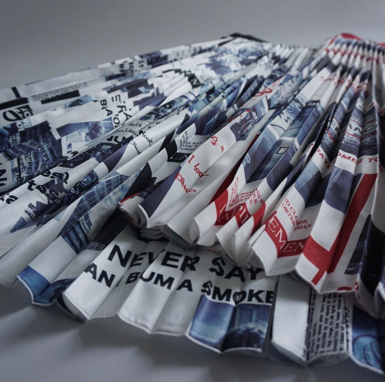 今回のテキスタイルは、これまで使ってきたアーカイブグラフィックを復活させたり、ロゴのテーマになっている、ごめんねワードを散りばめました。そこに関連するフォトプリントを付けています。私自身が3年前にパリに行った際に撮影した写真や、トーマスマグパイ スタッフの働く渋谷のオフィスから眺める空、地元福岡のコインランドリーで撮影したものなど。