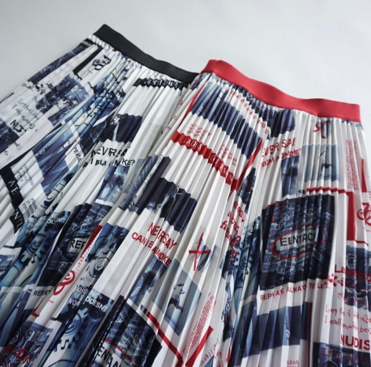 今回はフォトプリントのプリーツスカートを作りました。プリーツは従来と同じような感じですが、少ししっとりした肌触りの感じられるポリエステルです。肌あたりが良く、着やすい素材。ウエスト部分は、今回は直接ゴムを直付け仕様ですっきりとしています。いつもの着心地の良さに加えて、ストンと落ちるシルエットが、細く見せる効果があり、定番で作っているスカートです。