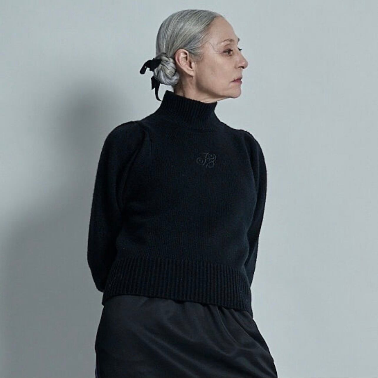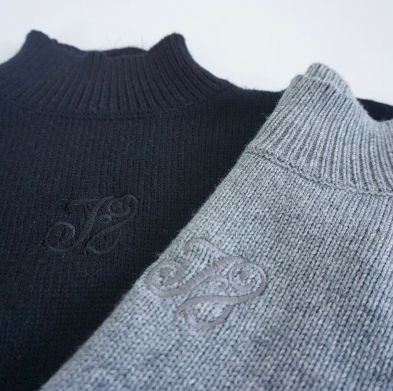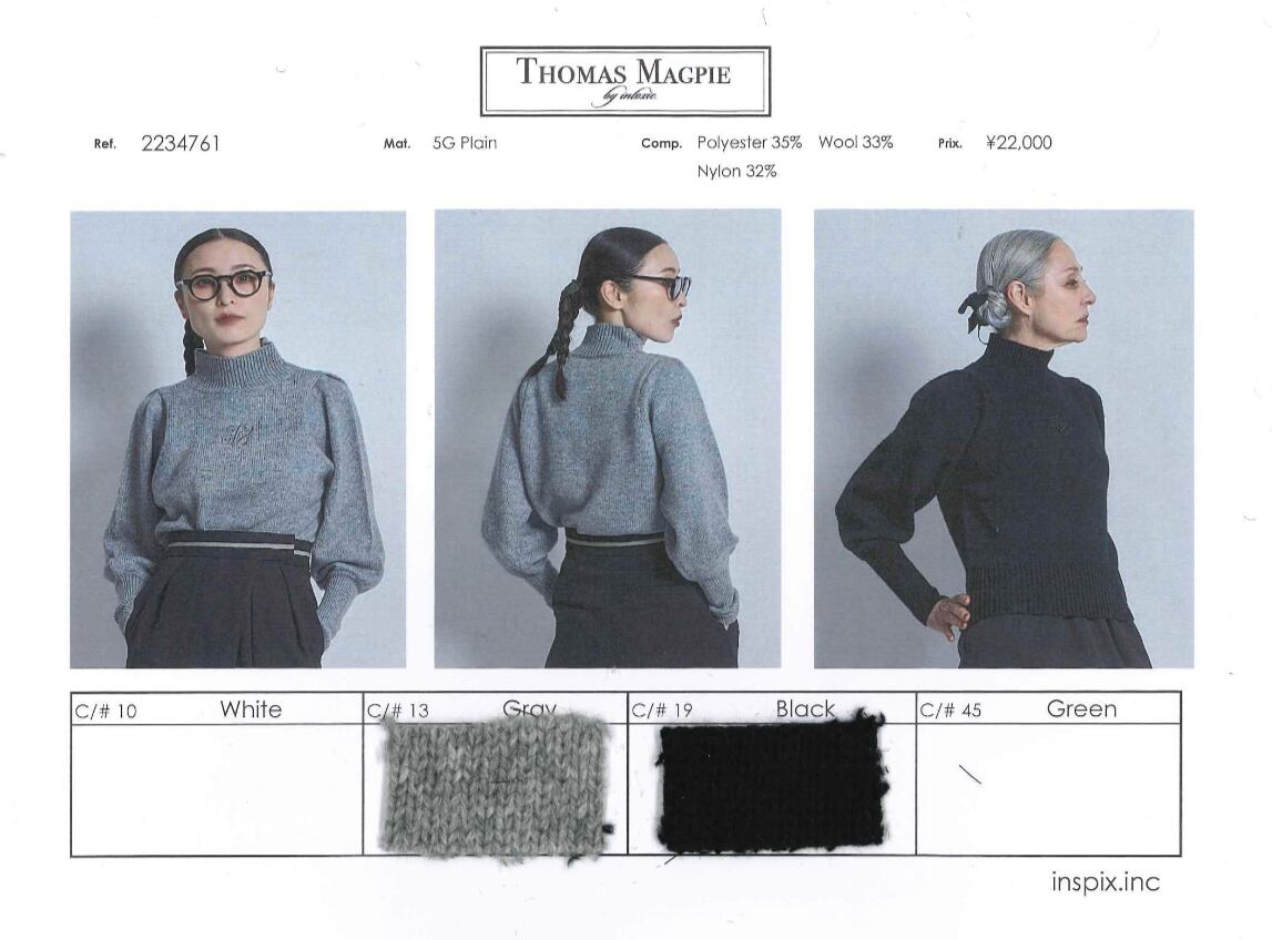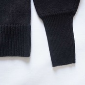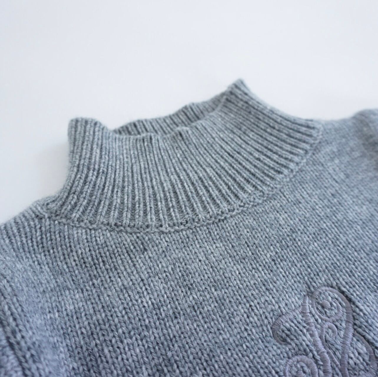 毎日でも着れる実用性の高いハイネックニット。1枚あると便利です。ポリエステルとウールの混紡です。今回このニットは袖のシルエットにこだわって作っています。身頃は小さすぎず、大きすぎず、体型は選ばず着ることができ、とてもすっきりとしています。アームは割と大きめで、袖も長め。袖口は長めのリブにしてタイトに絞まるようにしました。小柄な方にも袖口の長いリブで留まるので、袖の長さが調整で気にならないようになっています。肩は少しパフ気味、上品さのあるパフスリーブにも、膨らみと強さのあるパワーショルダーにも見えて、今の気分によく合うシルエットが出来たと思います。ハイネックは絞まり過ぎていないのでとても着やすくなっています。フロント中央に今回多用している、マグパイのマークを同色で刺繍しています。目立たないのでオフィスなどでも実用性があるかなと思います。毎日着ても飽きが来ないので、グレー、ブラックどちらも凡庸性が高いです。上にテーラードジャケットを羽織るととてもカッコよく決まります。またパンツでも、スカートでも使いやすい長さにしました。裾のリブの絞りが少し足りないと感じたので、もう少しリブ部分だけ小さくして、腰で留まるように変更しようかと考えています。厚みはあまりありません。シルエットがキレイにでる肉感です。パンツにインしてもかさばり感はありません。