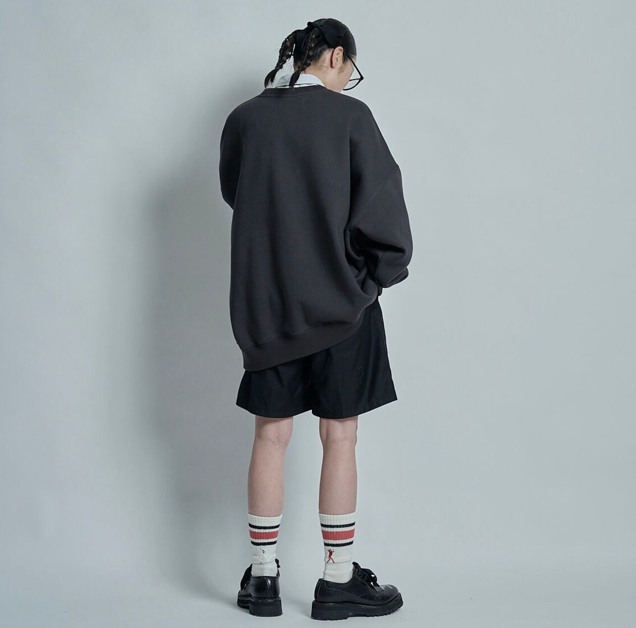 新型スウェットです。フーディーと同じく裏起毛の同素材。今回は、メンズのXL程度のサイズにしてみました。これまでのスェットもとても人気で、形が非常に良いと言われてきましたが、更に1サイズ大きめになっています。メンズのXLに近いと思います。しっかりとした肉感なので、だれてしまうこともなく、シルエットがとても良いです。初めて大幅にサイズを変えてみましたが、肩がしっかりしている方や、身長の高い方、グラマラスな体型の方が着られても、華奢に見せてくれる効果がある、とサイズにこだわりの深いスタッフが話していました。これまでのスウェットもとても気に入ってはいましたが、最近は大幅なオーバーサイズか、割とコンパクトなサイズ感か、どちらかに傾倒しています。なんとなくのオーバーサイズも嫌いではありませんでしたが、メンズを女の子が着ている雰囲気をもっと出したくて、サイズ変更しました。首回りも少しいつもより広めにしました。バストが大きい方は首回りを気にされますが、気に入ってもらえるような少しだけ広めの首回りにしてみました。裾もやや絞ったリブにしていますが、ヒップには引っかかりにくい締まり感。身幅も広めで、ストンと引っ掛かりがなく落ちるので、腰回りも華奢に見えると思います。