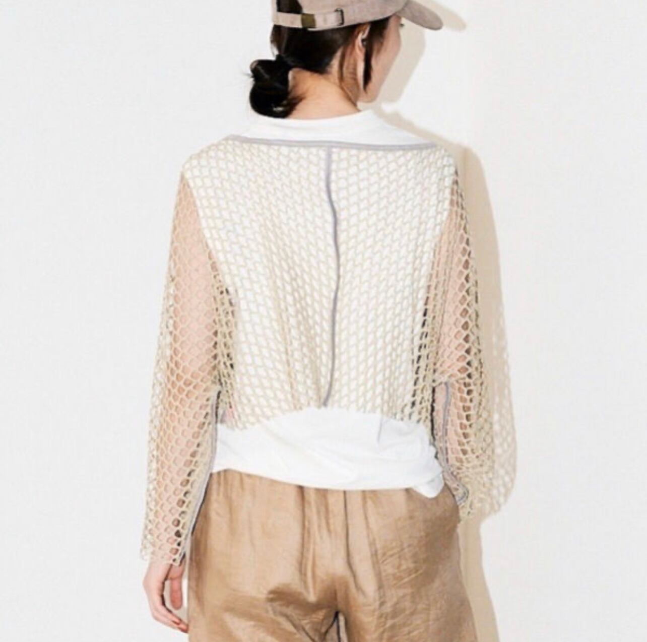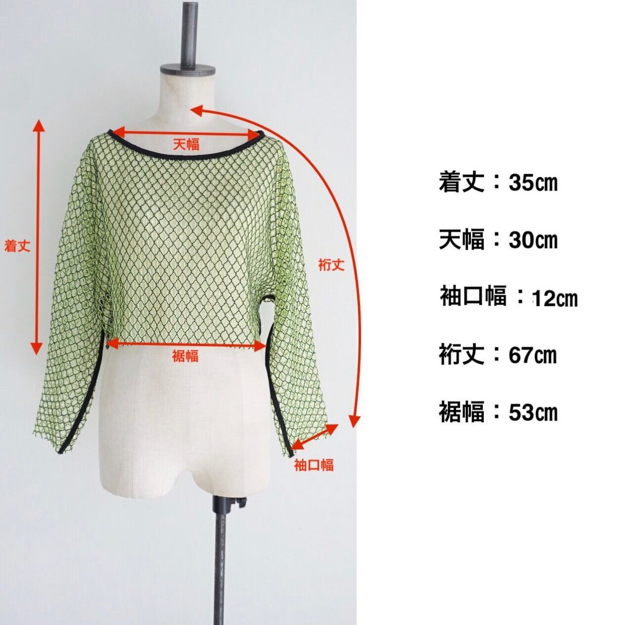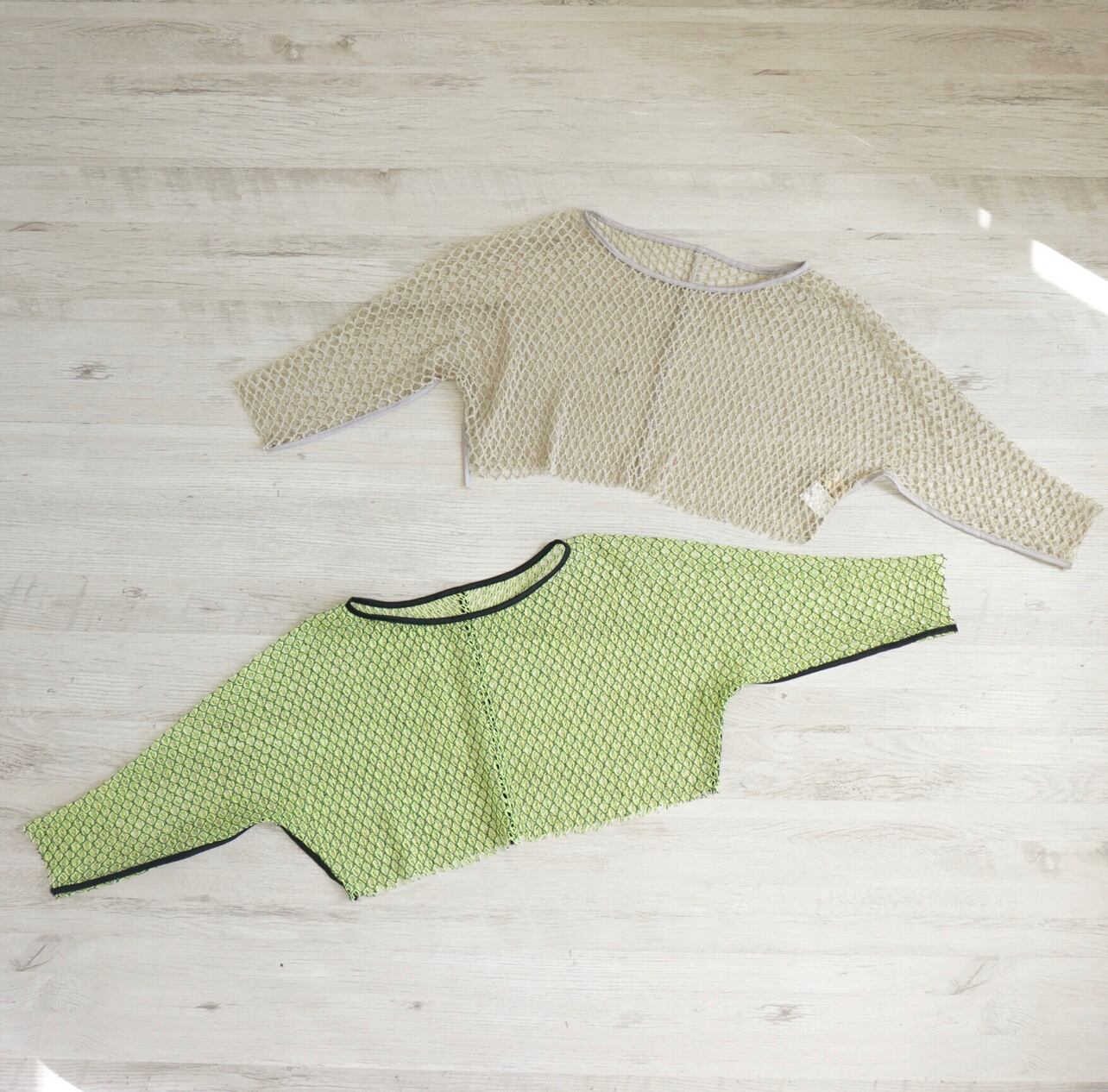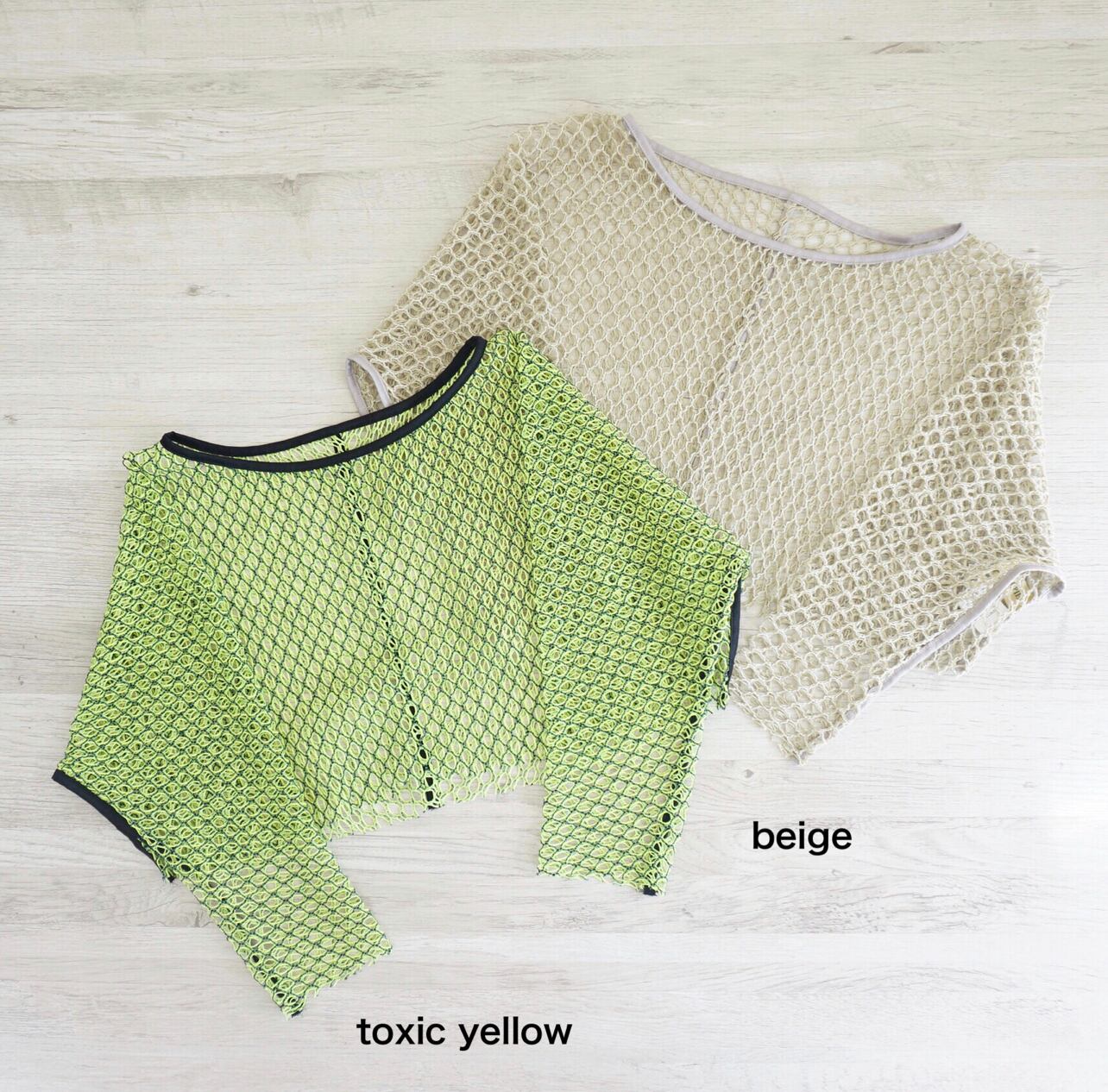 ショート丈のメッシュトップを作りました。真夏に楽しめる透け感。この素材は以前からどうしても使ってみたかったものでずっと持ち歩いていました。特にお勧めがトキシックイエローカラー。蛍光感の強いイエローグリーンです。イエローはブラックとイエローの混ざった太い糸でメッシュにしてあります。しっかりとしていて耐久性があります。オーバーサイズで真夏から真冬まで重ね着に重宝します。着丈が短めのトップはチャレンジしてみたいけど抵抗感がある。でも重ね着で短めのトップであれば抵抗なく着ることができそうです。イエローはブラックの糸が入っているのでブラックとの相性が抜群で合わせやすいと思います。合わせをあまり気にせず何にでも合わせてみても良いかなと思います。ルールがない方が楽しめるアイテムかなと思っています。耐久性のある日本製の素材でメイドインジャパンです。