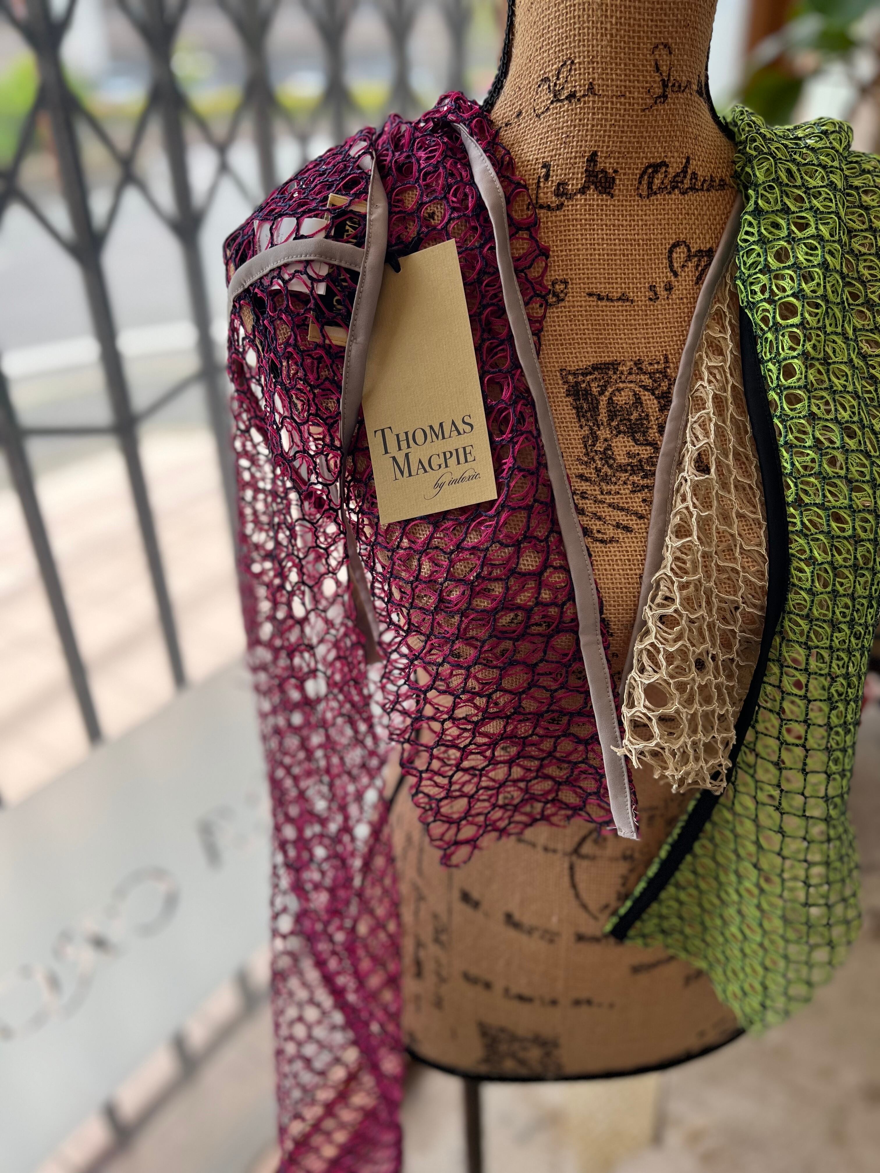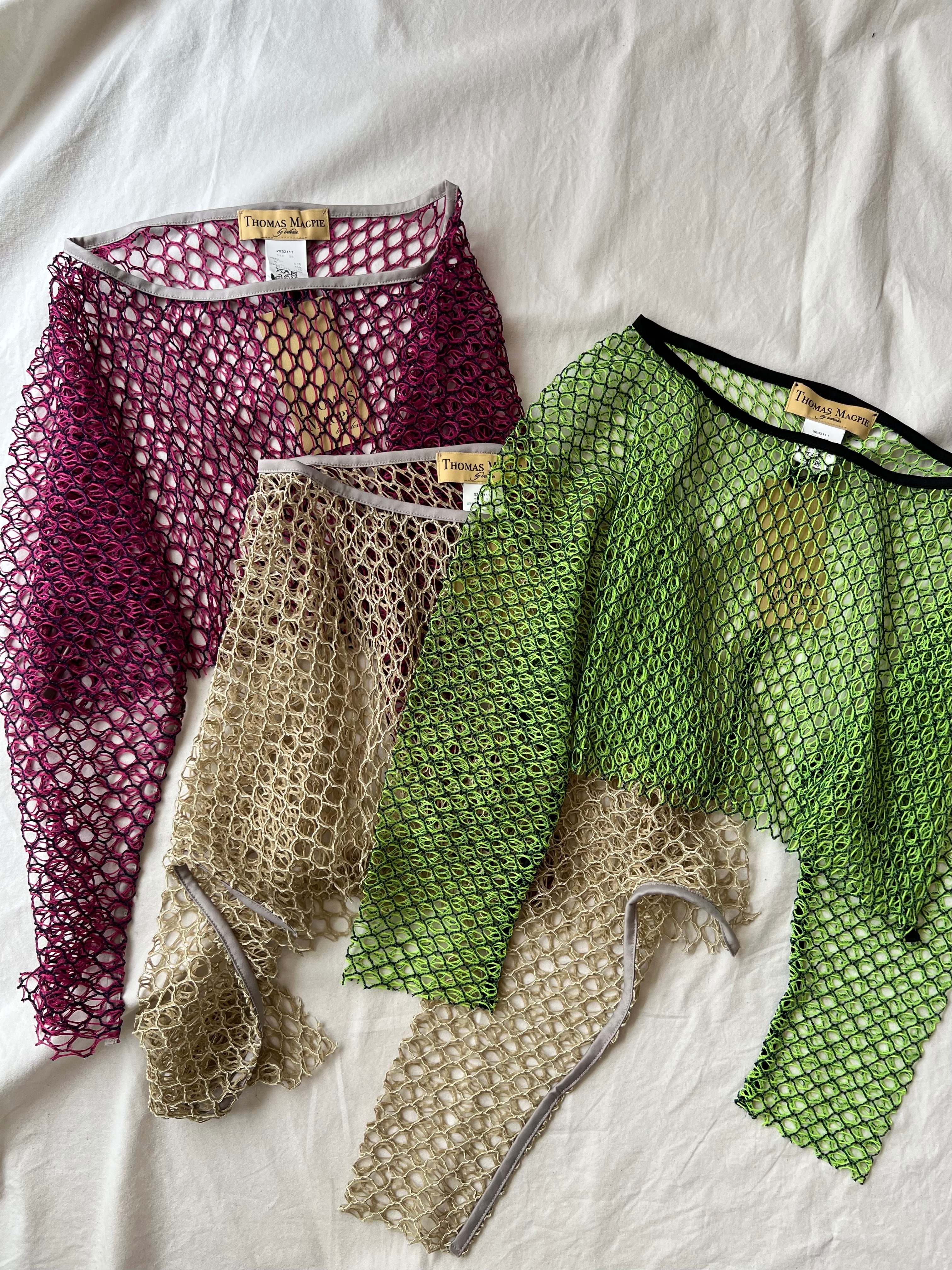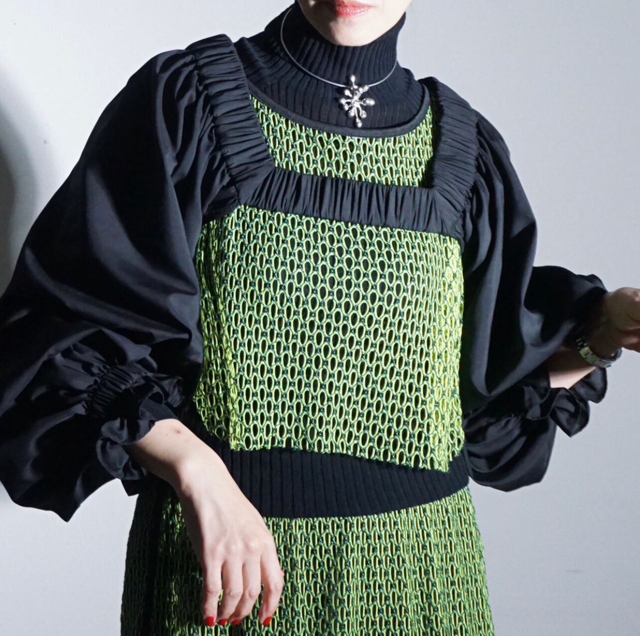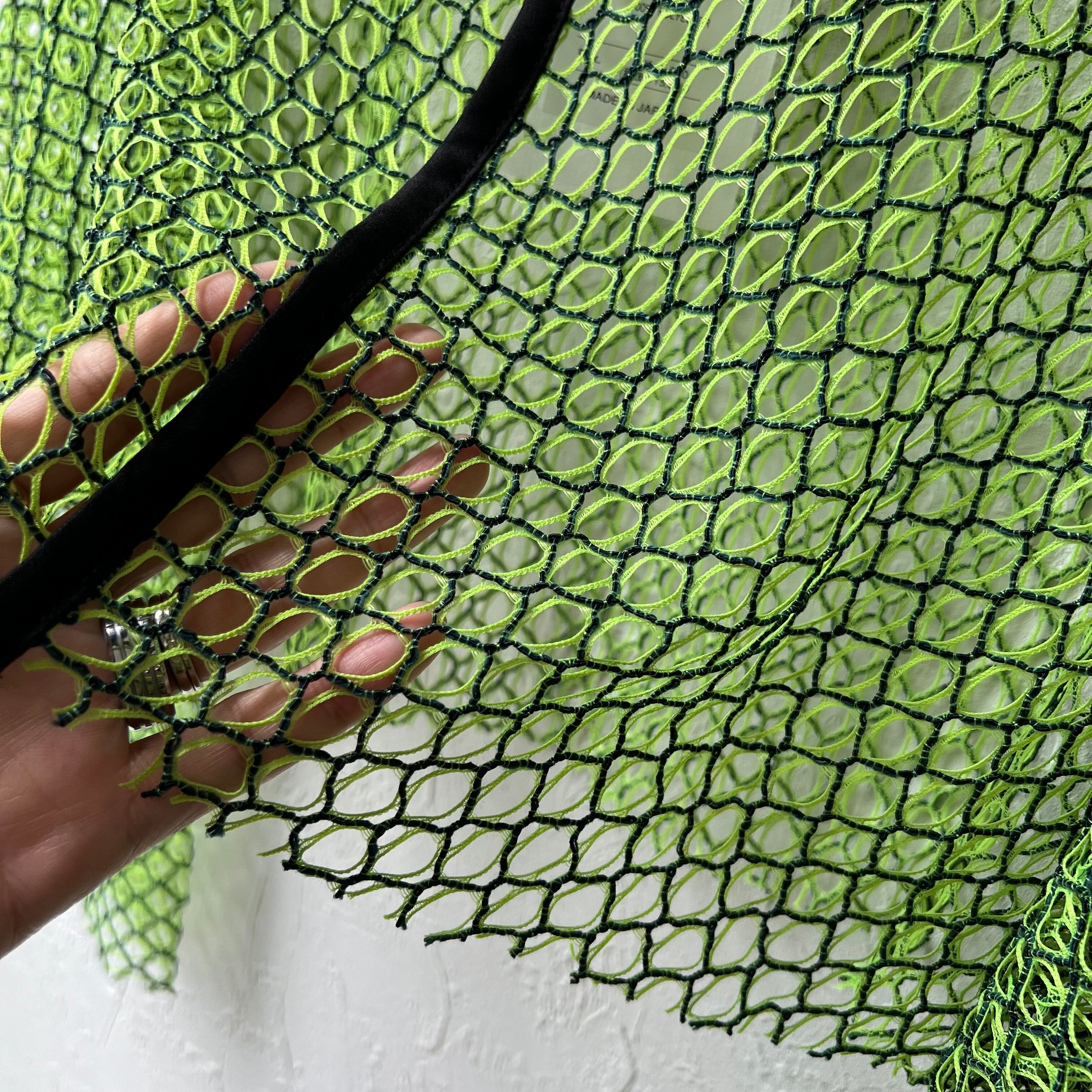 ショート丈のメッシュトップを作りました。真夏に楽しめる透け感。この素材は以前からどうしても使ってみたかったものでずっと持ち歩いていました。特にお勧めがトキシックイエローカラー。蛍光感の強いイエローグリーンです。イエローはブラックとイエローの混ざった太い糸でメッシュにしてあります。しっかりとしていて耐久性があります。オーバーサイズで真夏から真冬まで重ね着に重宝します。着丈が短めのトップはチャレンジしてみたいけど抵抗感がある。でも重ね着で短めのトップであれば抵抗なく着ることができそうです。イエローはブラックの糸が入っているのでブラックとの相性が抜群で合わせやすいと思います。合わせをあまり気にせず何にでも合わせてみても良いかなと思います。ルールがない方が楽しめるアイテムかなと思っています。耐久性のある日本製の素材でメイドインジャパンです。