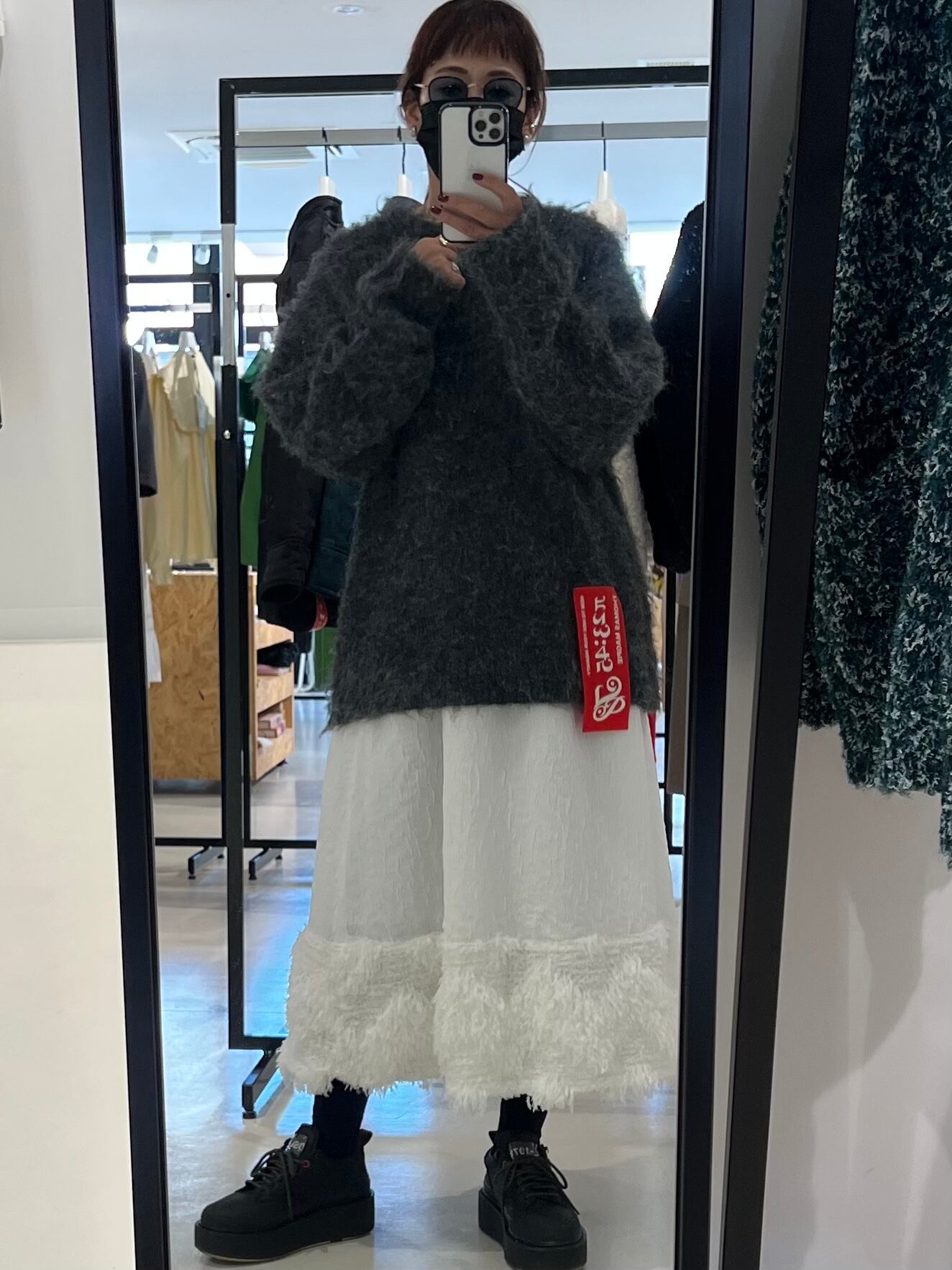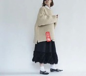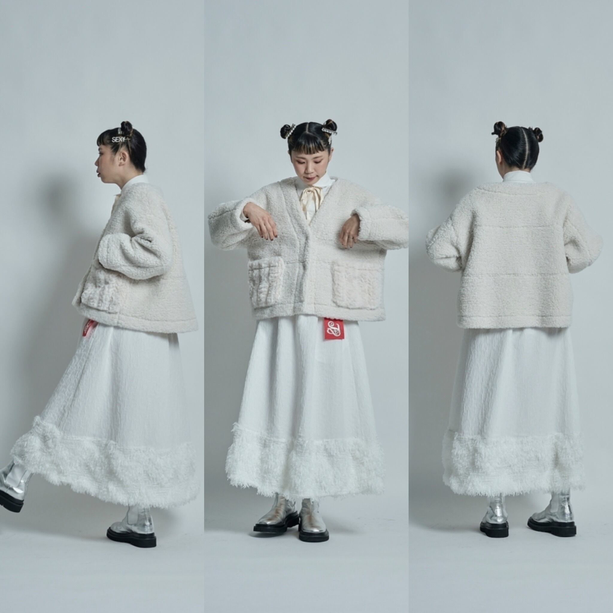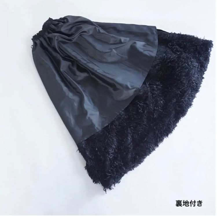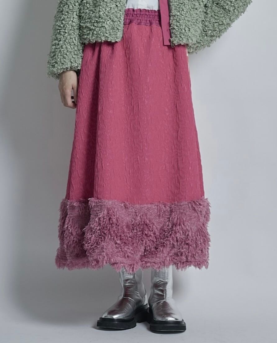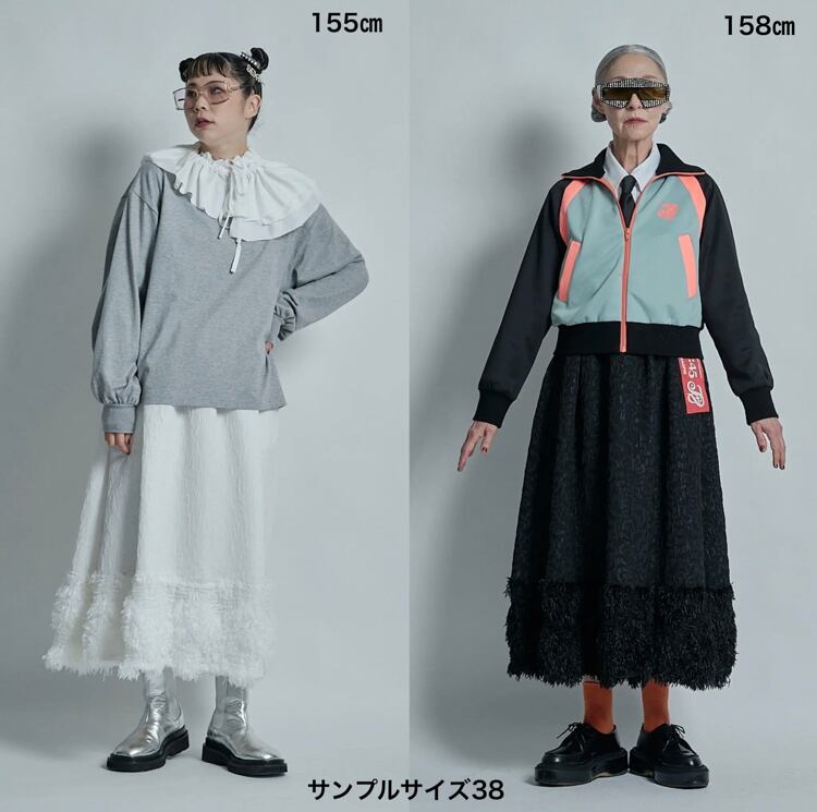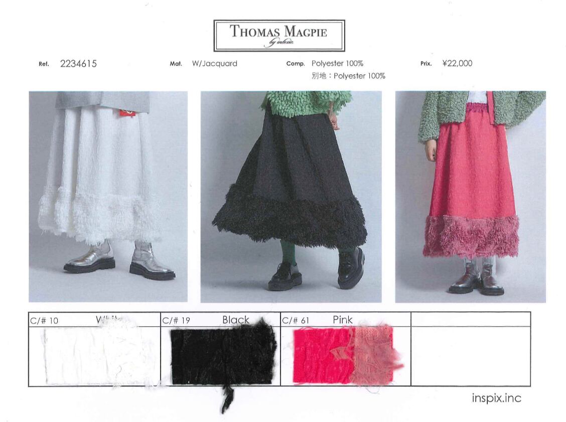 コレクションのデザインを始めるときに、まず最初にテーマカラーと、どのような物を作っていきたいかを考えます。次に素材集め、ロゴのテーマ、アイテムの絞り込みを行なっていきます。今回のテーマはスポーツアイテムにチャレンジしたのでジャージー素材を探していきました。その次に、全体のテーマとして、これまであまり使って来なかった、表面変化のある素材、凹凸、フェザーなど。ニットもかなり変化のある物にしたくて、オリジナルの編み地にチャレンジしたり、全体的に表面変化にこだわるラインナップにしています。中でも、今回のこのスカートは、動きのあるフェイクフェザーを裾にたっぷりとつけ、加工されている凸凹のあるジャガード生地とドッキングさせたスカートで、全体のコレクションの中でも、表面変化のある素材同士で私の決めた最初のテーマに沿ったアイテムと言えます。今回は積極的に生地のピックアップを行い、生地からデザインを考えてきました。変化のある素材で今までに既存のブランドイメージにない、新しさを探し素材選びに注力しました。このスカートの良さは、今までにはない重みのあるフェザーをつけたシルエットです。裾にフェザーを付けたので綺麗な台形のシルエットが出ます。そのシルエットがとても綺麗で、とにかく本当に合わせやすい。カタログのルックを作る時に、色々なトップスに合わせられてとても便利でした。ウエストはゴムで、とても着やすく、サイズに幅がありどんな体型の方にも合いやすくなっています。華やかではありますが、扱いがしやすいポリエステル素材です。フェザー部分は多少抜けが見られますが、密集している為、多少抜けても全く目立ちません。このフェザーに見える部分もポリエステルの糸で毛羽立ちの表現をしており、珍しさがあるかと思います。お洗濯はドライクリーニングですが、自宅で優しくドライ用洗剤で手洗い可能です。どちらもポリエステル素材なのでとても扱いがしやすい素材です。秋冬に沢山着てもらいたい、とても楽しめるユースフルなスカートです。ブラックが使いやすくてリッチなイメージ。高級メゾンのコレクションのような雰囲気があります。ホワイトはかなり真っ白なカラーですが、冬のホワイトコーディネートに可愛さが増してスノーホワイトのイメージでとてもフレッシュさがあります。ホワイトは難易度が少し高くなるかもしれません。どちらもお勧めですが、ブラックはとにかく使いやすいと思います。私の今回の一押しアイテムです。